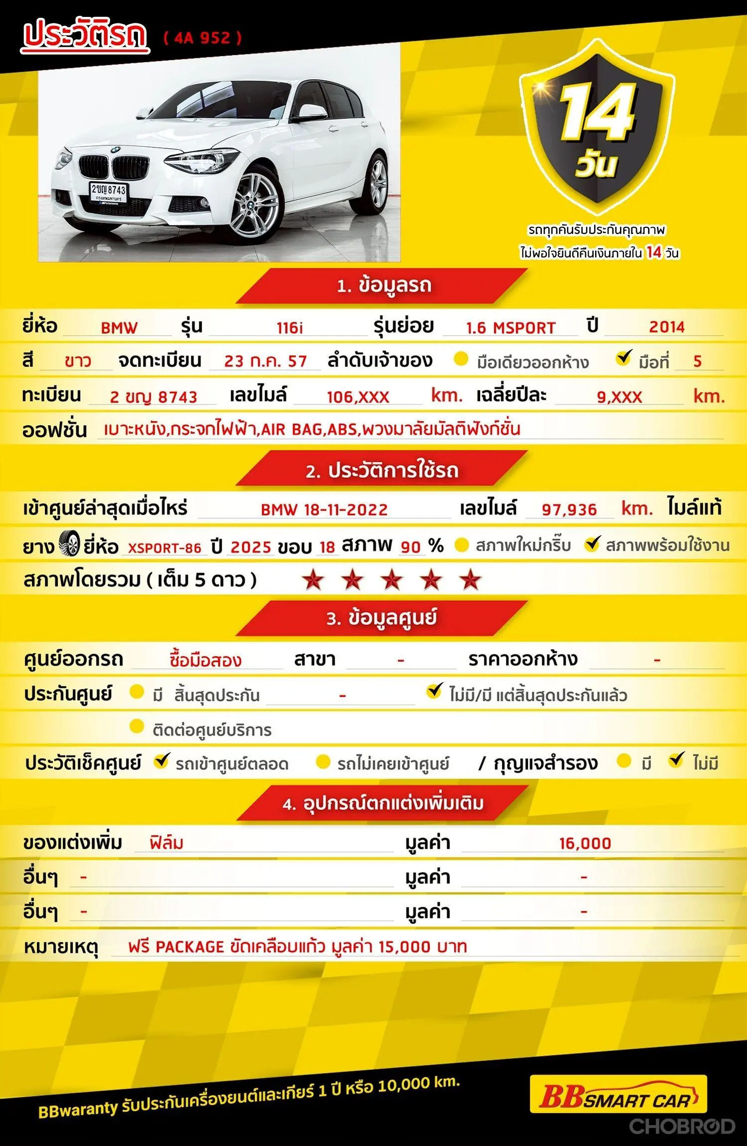 BMW 116i 1.6 MSPORT 2014 ออกรถ 0 บาท จัดได้ 449,000 บ. Line:@********แสดงข้อมูล 🔥จอง 199 บาท ส่งบัตรประชาชน รู้ผลพิจารณาภายใน 30 นาที ไม่ผ่านคืนเงินจองทุกกรณี 🔥ซื้อรถกับ BB พร้อมให้คำปรึกษา แก้ทุกปัญหา ให้ทุกเรื่อง บริการ call center 24 ชม. 🔥BB Care Plus รับประกันหลังการขาย สูงสุด 2 ปี หรือ 20,000 km.. 🔥มีรถให้เลือกมากกว่า 1,800 คัน บีบีสมาร์ทคาร์ 4 สาขากาญจนาภิเษก รหัสรถ 4A952 ราคา 429,000 บ ผ่อนเพียง 7,898 บาท Brand. : BMW Year. : 2014 Model. :SERIES 1 Grade. : 1.6 M SPORT 116i F20 Engine. : 1600 CC. Type. : เบนซิน Gearbox : A/T Color. : ขาว Mileage. : 106,XXX km. (ซื้อสด ราคานี้ยังไม่รวมค่าดำเนินการ 10,000 บ.) 🚩 Price. 429,000 บาท ยอดจัด : 439,000 บาท เงินดาวน์. : ฟรีดาวน์ ประกันภัย : ฟรีประกันภัย 1 ปี ค่าดำเนินการ : 10,000 รวมออกรถ 0 บาท ผ่อน 36 งวด = 14,571 บาท ผ่อน 48 งวด = 11,309 บาท ผ่อน 60 งวด = 9,430 บาท ผ่อน 72 งวด = 8,478 บาท ผ่อน 84 งวด = 7,898 บาท *เงื่อนไขเป็นไปตามที่ไฟแนนซ์กำหนด โปรโมชั่นพิเศษ สำหรับลูกค้าเครดิตดี 🚩เลือกรับเรทดอกเบี้ยพิเศษ 📍36 งวด = 1.29 % 📍48 งวด = 1.99 % 📍60 งวด = 2.39 % 📍72 งวด = 3.59 % 🔥 เงื่อนไข โปรโมชั่น ดอกเบี้ยเริ่มต้น 1.29% ตลอดอายุสัญญา - ยอดจัดไฟแนนซ์ 300,000-600,0000 บาท - ผ่อนสูงสุด 72 เดือน - เป็นลูกค้าประวัติดี พนักงานประจำเงินเดือน 20,000 ขึ้นไป - ค่าดำเนินการแคมเปญ 20,000 บาท (รวมในยอดจัดได้) 🎗Car Hightlight!!! รถใหม่มาอีกแล้วคะ BMW SERIES 1 สะดุดตาไม่มีเบื่อ กับดีไซน์ที่โดดเด่นเหลือเชื่อแข็งแกร่ง ดุดัน แต่ยังแฝงไปด้วยความโฉบเฉี่ยวที่พร้อมจะทำให้คุณมั่นใจในทุกการเดินทาง 🎗ภายใน แอร์ วิทยุ - CD เบาะหนังแท้ เบาะไฟฟ้าคู่หน้า เบรค ABS Airbag พวงมาลัย Multifunction เบาะหนัง เซ็นทรัลล๊อก กุญแจรีโมท-สัญญานกันขโมย พวงมาลัยเพาเวอร์ จอ LCD เล่น DVD กระจกไฟฟ้า แอร์ AUTO 🎗ภายนอก กระจกมองข้างปรับไฟฟ้า ไฟตัดหมอก กล้องส่องหลัง กระจกมองข้างพับไฟฟ้า ไฟเลี้ยวกระจกมองข้าง ล้อแม็ก เซนเซอร์รอบคัน 🎗ความคุ้มค่า ราคาผ่อนสบายกระเป๋า เราคัดเลือกสภาพรถคันนี้มาแล้ว สภาพดีมากๆ เทียบกับราคานี้ถือว่าคุ้มค่าสุดๆ ไปเลยจ้า ⭐️การรับประกันหลังการขาย BB Care Plus สูงสุด 2 ปี หรือ 20,000 km. ด้วยช่างที่ผ่านการอบรมจากศูนย์ชั้นนำของประเทศ 🎉Special offer เฉพาะ บีบีสมาร์ทคาร์ ที่นี่ที่เดียว ⭐ดอกเบี้ยเริ่มต้น 1.29% มีไฟแนนซ์รองรับหลายที่ค่ะ ⭐ฟรี!! แพคเก็จ ขัดเคลือบแก้ว มูลค่า 15,000 บาท ทุกคัน ⭐อนุมัติไว 30 นาที นำเอกสารมาให้ครบรับรถกลับบ้านทันทีค่ะ ⭐BB Care Plus รับประกันหลังการขาย สูงสุด 2 ปี หรือ 20,000 km. ⭐มี 6 สาขา ในกรุงเทพและปริมณฑลใกล้บ้านท่าน ⭐รถทุกคันผ่านตรวจสอบ Inspection เรียบแล้วค่ะ ผ่าน 5 ดาวทุกคันค่ะ ⭐เซลล์ทุกท่านเป็นมืออาชีพพร้อมให้บริการทุกท่านแน่นอนค่ะ เลือกข้อเสนอที่ให้คุณมากกว่าที่อื่น เพราะเราเล็งเห็นแล้ว ที่บีบีสมาร์ทคาร์ ให้คุณได้มากกว่าที่อื่นแน่นอนครับ มาที่เดี