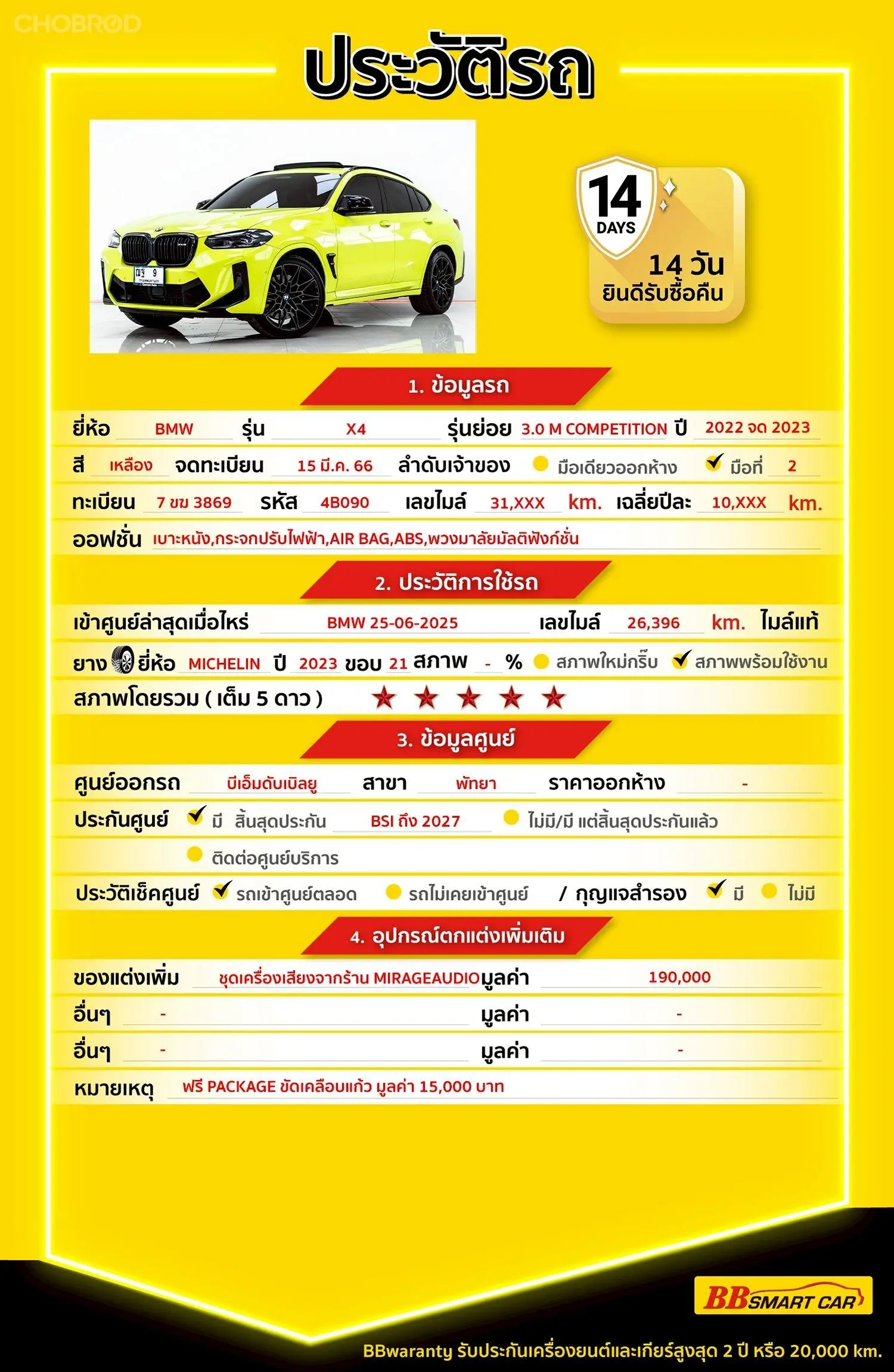 BMW X4 3.0 M COMPETITION 2023 ออกรถ 0 บาท จัดได้ 5,619,000 บ. Line:@698epmtg 🔥จอง 199 บาท ส่งบัตรประชาชน รู้ผลพิจารณาภายใน 30 นาที ไม่ผ่านคืนเงินจองทุกกรณี 🔥ซื้อรถกับ BB พร้อมให้คำปรึกษา แก้ทุกปัญหา ให้ทุกเรื่อง บริการ call center 24 ชม. 🔥BB Care Plus รับประกันหลังการขาย สูงสุด 2 ปี หรือ 20,000 km.. 🔥มีรถให้เลือกมากกว่า 1,800 คัน สาขา4 ถนนกาญจนาภิเษกใกล้กับสมาคมปักษ์ใต้ รหัสรถ 4B090 ราคา 5,599,000 บ ผ่อนเพียง 93,904 บาท Brand. : BMW Year. : 2023 Model. : X4 G02 Grade. : 3.0 M COMPETITION Engine. : 3000 CC. Type. : เบนซิน Gearbox : A/T Color. : เหลือง Mileage. : 31,XXX km. (ซื้อสด ราคานี้ยังไม่รวมค่าดำเนินการ 10,000 บ.) 🚩 Price. 5,599,000 บาท ยอดจัด : 5,609,000 บาท เงินดาวน์. : ฟรีดาวน์ ประกันภัย : ฟรีประกันภัย 1 ปี ค่าดำเนินการ : 10,000 รวมออกรถ 0 บาท ผ่อน 36 งวด = 180,665 บาท ผ่อน 48 งวด = 138,988 บาท ผ่อน 60 งวด = 115,482 บาท ผ่อน 72 งวด = 103,312 บาท ผ่อน 84 งวด = 93,904 บาท *เงื่อนไขเป็นไปตามที่ไฟแนนซ์กำหนด โปรโมชั่นพิเศษ สำหรับลูกค้าเครดิตดี 🚩เลือกรับเรทดอกเบี้ยพิเศษ 📍36 งวด = 1.29 % 📍48 งวด = 1.99 % 📍60 งวด = 2.39 % 📍72 งวด = 3.59 % 🔥 เงื่อนไข โปรโมชั่น ดอกเบี้ยเริ่มต้น 1.29% ตลอดอายุสัญญา - ยอดจัดไฟแนนซ์ 300,000-600,0000 บาท - ผ่อนสูงสุด 72 เดือน - เป็นลูกค้าประวัติดี พนักงานประจำเงินเดือน 20,000 ขึ้นไป - ค่าดำเนินการแคมเปญ 20,000 บาท (รวมในยอดจัดได้) 🎗Car Hightlight!!! รถใหม่มาอีกแล้วคะ BMW X4 รถสปอร์ตในคราบ SUV" ที่มีความดิบและดุดันมากที่สุดรุ่นหนึ่งในคลาสปรับโฉมใหม่ที่มาพร้อมสมรรถนะระดับซูเปอร์คาร์ ช่วงล่างหนึบเกาะถนนเหมือนรถแข่ง พวงมาลัยคม ขับ 4 ล้อที่ท้ายออกนิดๆ อารมณ์รถสปอร์ตจ๋า หล่อจบ: ชุดแต่ง M รอบคัน ล้อ 21 นิ้ว ภายในคาร์บอน ไฟท้ายสวยดุ 🎗ภายใน BMW X4 ภายในดูดุดันด้วยโทนสีดำตัดคาร์บอนไฟเบอร์ แต่ยังมีความโปร่งด้วยหลังคา Panoramic Glass Roof กุญแจรีโมท-สัญญานกันขโมย เบาะหนัง แอร์ แอร์ AUTO จอ LCD เล่น DVD เบรกมือไฟฟ้า เกียร์ Paddle Shift เบาะไฟฟ้าคู่หน้า พวงมาลัยเพาเวอร์ ซันรูฟ พวงมาลัย Multifunction วิทยุ - CD กระจกไฟฟ้า Airbag เบรค ABS ไมล์ Digital เซ็นทรัลล๊อก เบาะหนังแท้ Cruise Control หลังคาแก้ว 🎗ภายนอก ดูดีตามมาตรฐานรถยุโรป กระจกมองข้างปรับไฟฟ้า ไฟตัดหมอก กล้องส่องหลัง เซนเซอร์รอบคัน ไฟเลี้ยวกระจกมองข้าง ไฟโปรเจคเตอร์ กระจกมองข้างพับไฟฟ้า ชุดแต่งสเกิร์ตรอบคัน ล้อแม็ก 🎗ความคุ้มค่า ราคาผ่อนสบายกระเป๋า เราคัดเลือกสภาพรถคันนี้มาแล้ว สภาพดีมากๆ เทียบกับราคานี้ถือว่าคุ้มค่าสุดๆ ไปเลยจ้า ⭐️การรับประกันหลังการขาย BB Care Plus สูงสุด 2 ปี หรือ 20,000 km. ด้วยช่างที่ผ่านการอบรมจากศูนย์ชั้นนำของประเทศ 🎉Special offer เฉพาะ บีบีสมาร์ทคาร์ ที่นี่ที่เดียว ⭐ดอกเบี้ยเริ่มต้น 1.29% มีไฟแนนซ์รองรับหลายที่ค่ะ ⭐ฟรี!! แพคเก็จ ขัดเคลือบแก้ว มูลค่า 15,000 บาท ทุกคัน ⭐อนุมัติไว 30 นาที นำเอกสารมาให้ครบรับรถกลับบ้านทันทีค่ะ ⭐BB Care Plus ร