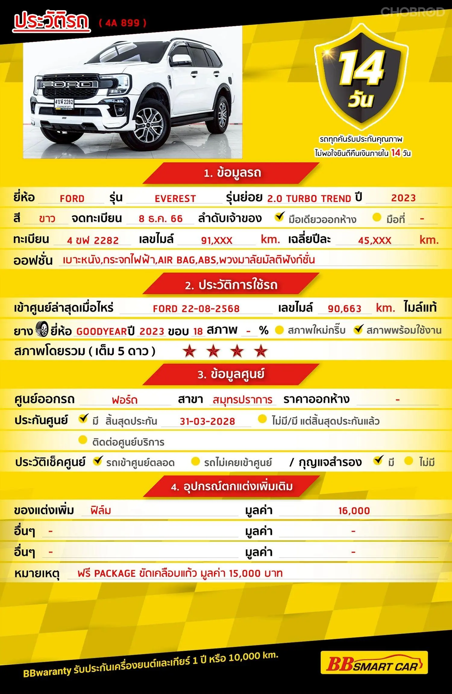 FORD EVEREST 2.0 TURBO TREND 2023 ออกรถ 0 บาท จัดได้ 999,000 บ. Line:@********แสดงข้อมูล 🔥จอง 199 บาท ส่งบัตรประชาชน รู้ผลพิจารณาภายใน 30 นาที ไม่ผ่านคืนเงินจองทุกกรณี 🔥ซื้อรถกับ BB พร้อมให้คำปรึกษา แก้ทุกปัญหา ให้ทุกเรื่อง บริการ call center 24 ชม. 🔥BB Care Plus รับประกันหลังการขาย สูงสุด 2 ปี หรือ 20,000 km.. 🔥มีรถให้เลือกมากกว่า 1,800 คัน บีบีสมาร์ทคาร์ 4 สาขากาญจนาภิเษก รหัสรถ 4A899 ราคา 979,000 บาท ผ่อนเพียง 16,557 บาท Brand. : FORD Year. : 2023 Model. : EVEREST Grade. : 2.0 TURBO TREND Engine. : 2000 CC Type. : ดีเซล Gearbox : AT Color. : ขาว Mileage. : 91,XXX km. (ซื้อสด ราคานี้ยังไม่รวมค่าดำเนินการ 10,000 บ.) 🚩 Price. 979,000 บาท ยอดจัด : 989,000 บาท เงินดาวน์ : 0 บาท ประกันภัย : ฟรีประกันภัย 1 ปี ค่าดำเนินการ : 10,000 บาท รวมออกรถ : 0 บาท ผ่อน 36 งวด = 31,856 บาท ผ่อน 48 งวด = 24,507 บาท ผ่อน 60 งวด = 20,362 บาท ผ่อน 72 งวด = 18,217 บาท ผ่อน 84 งวด = 16,557 บาท **เงื่อนไขเป็นไปตามที่ไฟแนนซ์กำหนด โปรโมชั่นพิเศษ สำหรับลูกค้าเครดิตดี เลือกรับเรทดอกเบี้ยพิเศษ 📍36 งวด = 1.29 % 📍48 งวด = 1.99 % 📍60 งวด = 2.39 % 📍72 งวด = 3.59 % 🔥 เงื่อนไข โปรโมชั่น ดอกเบี้ยเริ่มต้น 1.29% ตลอดอายุสัญญา - ยอดจัดไฟแนนซ์ 300,000-600,000 บาท - ผ่อนสูงสุด 72 เดือน - เป็นลูกค้าประวัติดี พนักงานประจำเงินเดือน 20,000 ขึ้นไป - ค่าดำเนินการแคมเปญ 20,000 บาท (รวมในยอดจัดได้) 🎗Car Hightlight FORD EVEREST 2.0 TURBO TREND ดีเซล 2023 รถยนต์อเนกประสงค์เอสยูวีขนาดกลาง โดดเด่นด้วยเทคโนโลยีอัจฉริยะ ประสิทธิภาพ และความปลอดภัย ที่มาพร้อมสมรรถนะการขับขี่อย่างเหนือชั้นทั้งบนทางเรียบและแบบออฟโรด ผสานกับเทคโนโลยีอันล้ำสมัย ดีไซน์ที่โดดเด่น และห้องโดยสารที่หรูหราและสะดวกสบายยิ่งขึ้น 🎗ภายใน ห้องโดยสารกว้างขวาง: เบาะนั่ง 3 แถว 7 ที่นั่ง เน้นความสบายและพื้นที่ใช้สอย หน้าจอแสดงผล: จอสัมผัสแนวตั้งขนาด 10.1 นิ้ว (สำหรับรุ่น Trend) รองรับ Apple CarPlay และ Android Auto ไร้สาย มาตรวัดดิจิทัล: จอแสดงผลข้อมูลการขับขี่แบบดิจิทัลขนาด 8 นิ้ว วัสดุ: ใช้โทนสีเข้ม เน้นความทนทานและดูแลรักษาง่าย ฟังก์ชันอำนวยความสะดวก: แท่นชาร์จไร้สาย (บางรุ่น), ช่องจ่ายไฟ 12V หลายตำแหน่ง, ช่องแอร์สำหรับผู้โดยสารตอนหลัง ระบบความปลอดภัย: ถุงลมนิรภัย 7 ตำแหน่ง, ระบบควบคุมเสถียรภาพการทรงตัว (ESP), ระบบป้องกันล้อล็อก (ABS), ระบบกระจายแรงเบรก (EBD) 🎗ภายนอก ดีไซน์แข็งแกร่ง: กระจังหน้าโครเมียมขนาดใหญ่ ไฟหน้า LED C-clamp ดีไซน์ใหม่ กันชนหน้า-หลังที่ดุดัน มิติตัวถัง: ใหญ่ขึ้น ให้ความรู้สึกโอ่อ่า ฐานล้อกว้างขึ้นเพื่อการทรงตัวที่ดี ล้ออัลลอย: ดีไซน์ใหม่ ขนาด 18 นิ้ว (สำหรับรุ่น Trend) ฟังก์ชัน: ราวหลังคา บันไดข้าง ไฟท้าย LED ทรง C-clamp 🎗ความคุ้มค่า สำหรับคันนี้หากเปรียบเทียบราคากับคุณภาพ คันนี้ถือว่าคุ้มค่ามากค่ะ ผ่อนสบายๆก็มีรถขับได้ รถดีมีคุณภาพแบบนี้รีบตัดสินใจซื้อได้เลราคานี้