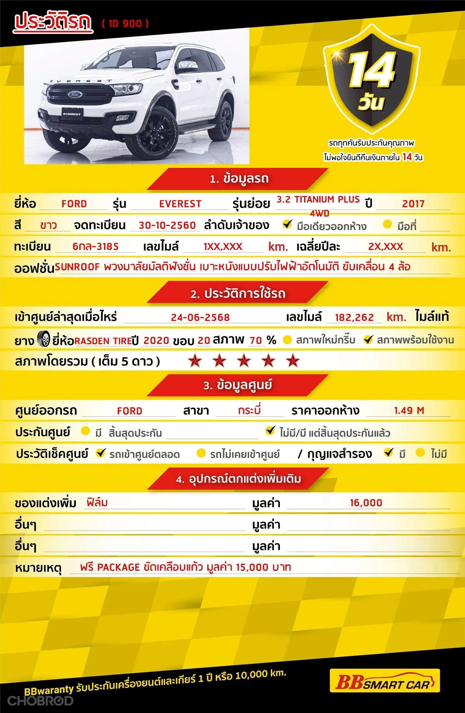 FORD EVEREST 3.2 TITANIUM+ 4WD 2017 ออกรถ 0 บาท จัดได้ 624,000 บ. Line:@********แสดงข้อมูล 🔥จอง 199 บาท ส่งบัตรประชาชน รู้ผลพิจารณาภายใน 30 นาที ไม่ผ่านคืนเงินจองทุกกรณี 🔥ซื้อรถกับ BB พร้อมให้คำปรึกษา แก้ทุกปัญหา ให้ทุกเรื่อง บริการ call center 24 ชม. 🔥BB Care Plus รับประกันหลังการขาย สูงสุด 2 ปี หรือ 20,000 km.. 🔥มีรถให้เลือกมากกว่า 1,600 คัน บีบีสมาร์ทคาร์ 4 สาขากาญจนาภิเษก รหัส 4A942 ราคา 604,000 บ. ผ่อนเพียง 10,363 บาท Brand. : FORD Year. : 2017 Model. : EVEREST Grade. : 3.2 TITANIUM PLUS 4WD Engine. : 3200 CC Type. : ดีเซล Gearbox : AT Color. : ขาว Mileage. : 184,XXX km. (ซื้อสด ราคานี้ยังไม่รวมค่าดำเนินการ 10,000 บ.) 🚩 Price. 604,000 บาท ยอดจัด : 614,000 บาท เงินดาวน์. : ฟรีเงินดาวน์ ประกันภัย : ฟรีประกันภัย 1 ปี ค่าดำเนินการ : 10,000บาท รวมออกรถ 0 บาท ผ่อน 36 = 19,938 บาท ผ่อน 48 = 15,338 บาท ผ่อน 60 = 12,745 บาท ผ่อน 72 = 11,401 บาท ผ่อน 84 = 10,363 บาท *เงื่อนไขเป็นไปตามที่ไฟแนนซ์กำหนด โปรโมชั่นพิเศษ สำหรับลูกค้าเครดิตดี 🚩เลือกรับเรทดอกเบี้ยพิเศษ 📍36 งวด = 1.29 % 📍48 งวด = 1.99 % 📍60 งวด = 2.39 % 📍72 งวด = 3.59 % 🔥 เงื่อนไข โปรโมชั่น ดอกเบี้ยเริ่มต้น 1.29% ตลอดอายุสัญญา - ยอดจัดไฟแนนซ์ 300,000-600,0000 บาท - ผ่อนสูงสุด 72 เดือน - เป็นลูกค้าประวัติดี พนักงานประจำเงินเดือน 20,000 ขึ้นไป - ค่าดำเนินการแคมเปญ 20,000 บาท (รวมในยอดจัดได้) 🎗Car Hightlight รถสวยๆ วันนี้ขอแนะนำ FORD EVEREST 3.2 TITANIUM PLUS 4WD AT 2017 จุดเด่นออฟชั่น 1 : SUNROOF 2 : พวงมาลัยมัลติฟังชั่น 3 : แผนที่นำทาง Navigator แสดงผลบนหน้าจอสีอัจฉริยะสั่งงานด้วยระบบกดสัมผัสแบบ 4 : เบาะหนังแบบปรับไฟฟ้าอัตโนมัติ ด้วยปุ่มกดสั่งงาน รอบห้องโดยสาร 5 : ขับเคลื่อน 4 ล้อ ประกอบไปด้วย เบาะคู่ 2 ที่นั่งด้านหน้า ปรับไฟฟ้า เบาะคนขับปรับไฟฟ้า 8 ระดับ เบาะแถวหลัง 2 ที่นั้งตอนสุดท้าย พับเก็บ เปิด / ปิด ด้วยระบบไฟฟ้า และฝาท้าย เปิด / ปิด อัตโนมัติ ด้วยปุ่มกดสั่งงาน ระบบไฟฟ้า 🎗ภายใน - ระบบควบคุมความเร็วแบบรักษาระยะห่างอัตโนมัติ (Adaptive Cruise Control) - ระบบช่วยควบคุมรถให้อยู่ในช่องทาง (Lane Keeping System) - ระบบเตือนการชนด้านหน้า (Forward Collision Warning System) - ระบบแจ้งเตือนการขับขี่ (Driver Alert System) - ระบบเปิด-ปิดไฟสูงอัจฉริยะ (Auto High Beam Control) - พวงมาลัยมัลติฟังก์ชั่น เบาะหนัง ABS Airbag 🎗ภายนอก ล้อแมกซ์ 20" ที่ปัดหมอกด้านหลัง กระจกปรับไฟฟ้า กระจกมองข้างสีเดียวกับตัวรถ ตัวรถสีขาว เรียบหรูดูดี ไม่มีน้ำท่วมหรือชนหนักแน่นอนค่ะ 🎗ความคุ้มค่า สำหรับรถคันนี้แล้วคุณภาพที่ลูกค้าได้รับ ถือว่ามาแบบเต็มสุดๆทั้งระบบรักษาความปลอดภัยและเทคโนโลยีต่างๆที่มากับตัวรถนับว่าคุ้มสุดๆ กำลังเครื่องดี ไม่ว่าจะทางเรียบหรือขรุขระทนรทานกับทุกพื้นผิวถนน ดูแลง่าย ในราคาที่แสนสบายกระเป๋าด้วยจ้า ⭐️การรับประกันหลังการขาย BB Care Plus สูงสุด 2 ปี หรือ 20,000 km. ด้วยช่างที่ผ่านการอบรมจากศูนย์ชั้นนำของประเทศ 🎉🎉Special offer เฉพาะ บีบีสมาร