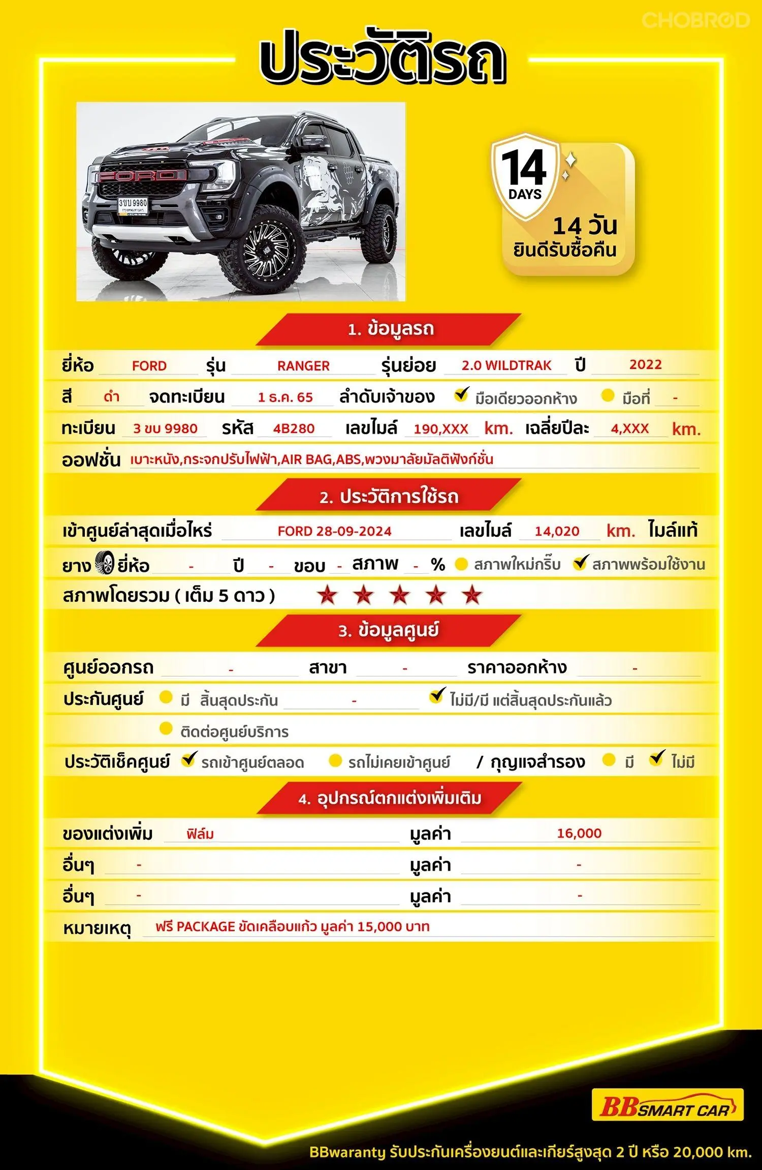 FORD RANGER 2.0 WILDTRAK 2022 ออกรถ 0 บาท จัดได้ 789,000 บ. Line:@698epmtg 🔥มีรถให้เลือกมากกว่า 1,800 คัน 🔥รถทุกคันผ่านตรวจสอบ Inspection เรียบร้อยแล้วค่ะ ผ่าน 5 ดาวทุกคันค่ะ 🔥ซื้อรถกับ BB พร้อมให้คำปรึกษา แก้ทุกปัญหา ให้ทุกเรื่อง บริการ call center 24 ชม. 🔥BB Care Plus รับประกันหลังการขาย สูงสุด 2 ปี หรือ 20,000 km. 🔥ฟรี!! แพคเก็จ ขัดเคลือบแก้ว มูลค่า 15,000 บาท ทุกคัน 🔥มี 6 สาขา ในกรุงเทพและปริมณฑลใกล้บ้านท่าน สาขา 4 ถนนกาญจนาภิเษกใกล้กับสมาคมปักษ์ใต้ รหัสรถ 4B280 ราคา 769,000 บ. ผ่อนเพียง 13,042 บาท Brand. : FORD Year. : 2022 Model. : RANGER DOUBLE CAB Grade. : 2.0 BI-WILDTRAK Engine. : 2000 CC. Type. : ดีเซล Gearbox : A/T Color. : ดำ Mileage. : 18,XXX km. (ซื้อสด ราคานี้ยังไม่รวมค่าดำเนินการ 10,000 บ.) 🚩 Price. 769,000 บาท ยอดจัด : 779,000 บาท เงินดาวน์. : ฟรีดาวน์ ประกันภัย : ฟรีประกันภัย 1 ปี ค่าดำเนินการ : 10,000 บาท รวมออกรถ 0 บาท ผ่อน 36 งวด = 25,092 บาท ผ่อน 48 งวด = 19,303 บาท ผ่อน 60 งวด = 16,038 บาท ผ่อน 72 งวด = 14,349 บาท ผ่อน 84 งวด = 13,042 บาท **เงื่อนไขเป็นไปตามที่ไฟแนนซ์กำหนด โปรโมชั่นพิเศษ สำหรับลูกค้าเครดิตดี 🚩เลือกรับเรทดอกเบี้ยพิเศษ 📍36 งวด = 1.29 % 📍48 งวด = 1.99 % 📍60 งวด = 2.39 % 📍72 งวด = 3.59 % 🔥 เงื่อนไข โปรโมชั่น ดอกเบี้ยเริ่มต้น 1.29% ตลอดอายุสัญญา - ยอดจัดไฟแนนซ์ 300,000-600,000 บาท - ผ่อนสูงสุด 72 เดือน - เป็นลูกค้าประวัติดี พนักงานประจำเงินเดือน 20,000 ขึ้นไป - ค่าดำเนินการแคมเปญ 20,000 บาท (รวมในยอดจัดได้) 🎗Car Hightlight NEW !!!! รถมาใหม่อีกคันวันนี้ค่ะ!!! FORD RANGER DOUBLE CAB 2.0 BI-TURBO WILDTRAK HI-RIDER AT 2022 จุดเด่นออปชั่น * เครื่องยนต์ 2.0 Bi-Turbo: ขุมพลังดีเซลเทอร์โบคู่ที่ให้สมรรถนะสูงสุด แรงบิดมหาศาล ขับสนุกและประหยัดน้ำมัน * รุ่น Wildtrak: ตกแต่งสปอร์ตดุดันจากโรงงาน มาพร้อมโรลบาร์และชุดแต่งที่เป็นเอกลักษณ์ของสายลุย * เทคโนโลยีล้ำสมัย: หน้าจอสัมผัสขนาดใหญ่รองรับความบันเทิงเต็มรูปแบบ พร้อมกล้องมองภาพขณะถอยจอด * สภาพรถเหมือนใหม่: ไมล์แท้วิ่งน้อยมากเพียง 18,xxx km. รถมือเดียวออกห้าง ประวัติเช็กศูนย์ตลอด มั่นใจได้ 100% * ความสะดวกสบาย: เบาะหนังปรับไฟฟ้าคู่หน้า พวงมาลัย Multifunction และระบบช่วยขับขี่อัจฉริยะครบครัน 🎗ภายใน กระจกมองข้างปรับไฟฟ้า แอร์ แอร์ AUTO พวงมาลัย Multifunction เบาะไฟฟ้าคู่หน้า จอ LCD เล่น DVD เซ็นทรัลล๊อก เบรค ABS เบาะหนัง เบรกมือไฟฟ้า กระจกไฟฟ้า Airbag วิทยุ - CD พวงมาลัยเพาเวอร์ กุญแจรีโมท-สัญญานกันขโมย ไมล์ Digital เบาะกึ่งหนัง 🎗ภายนอก ล้อแม็ก ไฟเลี้ยวกระจกมองข้าง บันไดข้าง ไฟตัดหมอก แม็กลายเนอร์ โรลบาร์ กล้องส่องหลัง กระจกมองข้างพับไฟฟ้า คิ้วกันสาด ดีไซน์ดุดันสไตล์ Wildtrak 🎗ความคุ้มค่า เป็นรถกระบะ 4 ประตูตัวท็อปที่ได้รับความนิยมสูงสุดในตลาด ด้วยสมรรถนะที่เหนือชั้น ออปชั่นที่จัดเต็ม และสภาพรถที่ใหม่มากเหมือนเพิ่งออกจากโชว์รูม คุ้มค่าที่สุดสำหรับผู้ที่มองหารถใช้งานและรถ