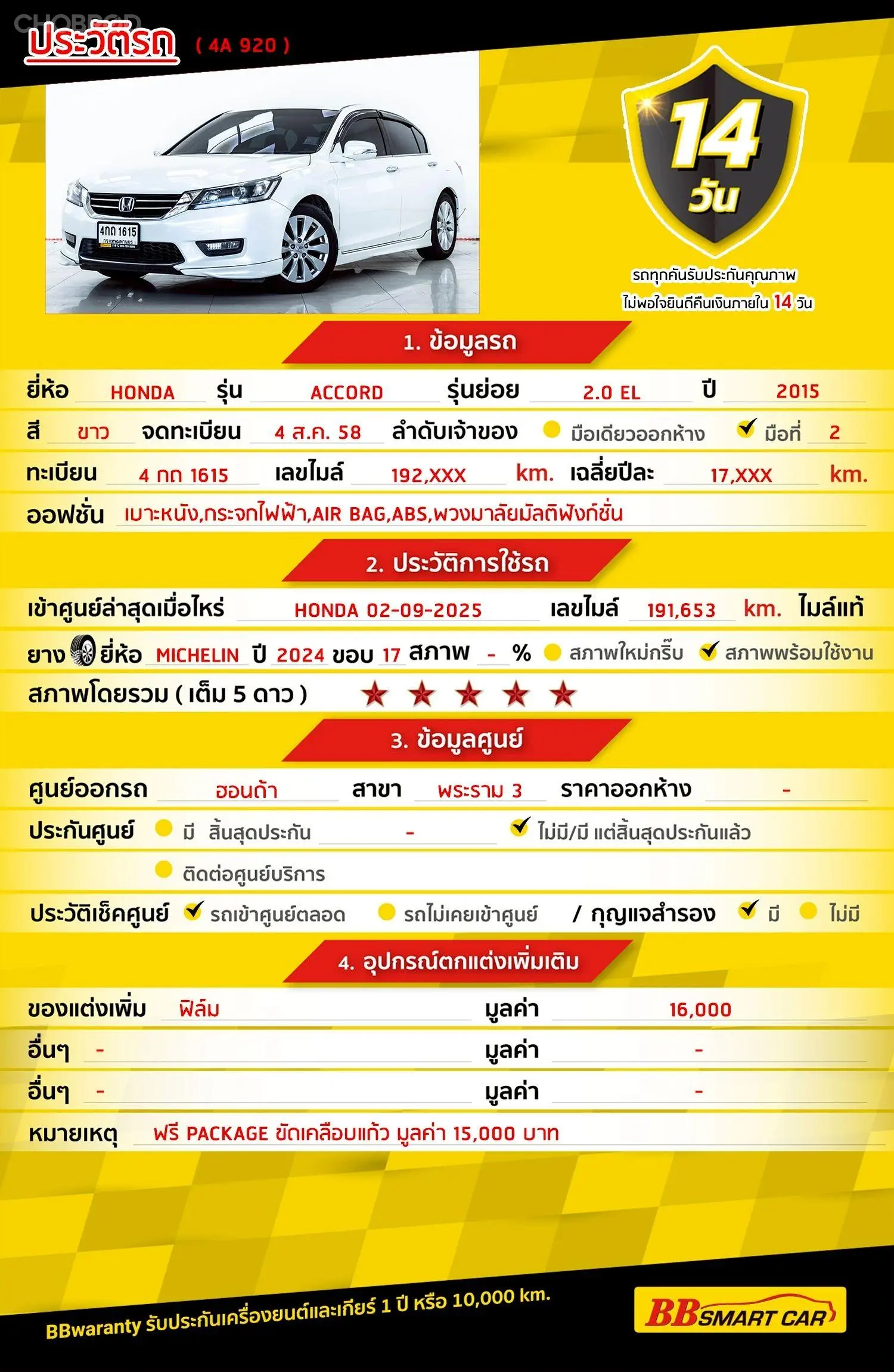HONDA ACCORD 2.0 EL 2015 ออกรถ 0 บาท จัดได้ 389,000 บ. Line:@********แสดงข้อมูล 🔥จอง 199 บาท ส่งบัตรประชาชน รู้ผลพิจารณาภายใน 30 นาที ไม่ผ่านคืนเงินจองทุกกรณี 🔥ซื้อรถกับ BB พร้อมให้คำปรึกษา แก้ทุกปัญหา ให้ทุกเรื่อง บริการ call center 24 ชม. 🔥BB Care Plus รับประกันหลังการขาย สูงสุด 2 ปี หรือ 20,000 km.. 🔥มีรถให้เลือกมากกว่า 1,800 คัน บีบีสมาร์ทคาร์ 4 สาขากาญจนาภิเษก รหัสรถ 4A920 ราคา 369,000 บาท ผ่อนเพียง 6,818 บาท Brand. : HONDA Year. : 2015 Model. : ACCORD Grade. : 2.0 EL Engine. : 2000 CC Type. : เบนซิน Gearbox : A/T Color. : ขาว Mileage. : 192,XXX km. (ซื้อสด ราคานี้ยังไม่รวมค่าดำเนินการ 10,000 บ.) 🚩 Price. 369,000 บาท ยอดจัด : 379,000 บาท ประกันภัย : ฟรีประกันภัย 1 ปี ค่าดำเนินการ : 10,000 บาท รวมออกรถ : 0 บาท ผ่อน 36 งวด = 12,579 บาท ผ่อน 48 งวด = 9,763 บาท ผ่อน 60 งวด = 8,141 บาท ผ่อน 72 งวด = 7,319 บาท ผ่อน 84 งวด = 6,818 บาท เงื่อนไขเป็นไปตามที่ไฟแนนซ์กำหนด** โปรโมชั่นพิเศษ สำหรับลูกค้าเครดิตดี 🚩เลือกรับเรทดอกเบี้ยพิเศษ 📍36 งวด = 1.29 % 📍48 งวด = 1.99 % 📍60 งวด = 2.39 % 📍72 งวด = 3.59 % 🔥 เงื่อนไข โปรโมชั่น ดอกเบี้ยเริ่มต้น 1.29% ตลอดอายุสัญญา - ยอดจัดไฟแนนซ์ 300,000-600,000 บาท - ผ่อนสูงสุด 72 เดือน - เป็นลูกค้าประวัติดี พนักงานประจำเงินเดือน 20,000 ขึ้นไป - ค่าดำเนินการแคมเปญ 20,000 บาท (รวมในยอดจัดได้) 🎗Car Hightlight HONDA ACCORD สำหรับรถยนต์ระดับ Luxury จากค่ายญี่ปุ่นเจ้านี้ ซึ่งการเปลี่ยนแปลงที่ออกมานั้น สะท้อนความหรูหราเพิ่มเติม โดยใส่ความ VIP มากขึ้น 🎗ภายใน เบาะกึ่งหนัง เบาะหนัง แอร์ AUTO กุญแจรีโมท-สัญญานกันขโมย จอ LCD เล่น DVD พวงมาลัย Multifunction เบาะไฟฟ้าคู่หน้า เบรค ABS Airbag แอร์ กระจกไฟฟ้า เซ็นทรัลล๊อก พวงมาลัยเพาเวอร์ วิทยุ - CD 🎗ภายนอก กระจกมองข้างปรับไฟฟ้า กล้องส่องหลัง ไฟตัดหมอก คิ้วกันสาด เซนเซอร์รอบคัน ไฟเลี้ยวกระจกมองข้าง กระจกมองข้างพับไฟฟ้า 🎗ความคุ้มค่า สำหรับคันนี้หากเปรียบเทียบราคากับคุณภาพ คันนี้ถือว่าคุ้มค่ามากค่ะ ผ่อนสบายๆก็มีรถขับได้ รถดีมีคุณภาพแบบนี้รีบตัดสินใจซื้อได้เลราคานี้มาไวไปไวนะคะ ⭐️การรับประกันหลังการขาย BB Care Plus สูงสุด 2 ปี หรือ 20,000 km. ด้วยช่างที่ผ่านการอบรมจากศูนย์ชั้นนำของประเทศ 🎉Special offer เฉพาะ บีบีสมาร์ทคาร์ ที่นี่ที่เดียว ⭐ดอกเบี้ยเริ่มต้น 1.29% มีไฟแนนซ์รองรับหลายที่ค่ะ ⭐ฟรี!! แพคเก็จ ขัดเคลือบแก้ว มูลค่า 15,000 บาท ทุกคัน ⭐อนุมัติไว 30 นาที นำเอกสารมาให้ครบรับรถกลับบ้านทันทีค่ะ ⭐BB Care Plus รับประกันหลังการขาย สูงสุด 2 ปี หรือ 20,000 km. ⭐มี 6 สาขา ในกรุงเทพและปริมณฑลใกล้บ้านท่าน ⭐รถทุกคันผ่านตรวจสอบ Inspection เรียบร้อยแล้วค่ะ ผ่าน 5 ดาวทุกคันค่ะ ⭐เซลล์ทุกท่านเป็นมืออาชีพพร้อมให้บริการทุกท่านแน่นอนค่ะ เลือกข้อเสนอที่ให้คุณมากกว่าที่อื่น เพราะเราเล็งเห็นแล้ว ที่บีบีสมาร์ทคาร์ ให้คุณได้มากกว่าที่อื่นแน่นอนครับ มาที่