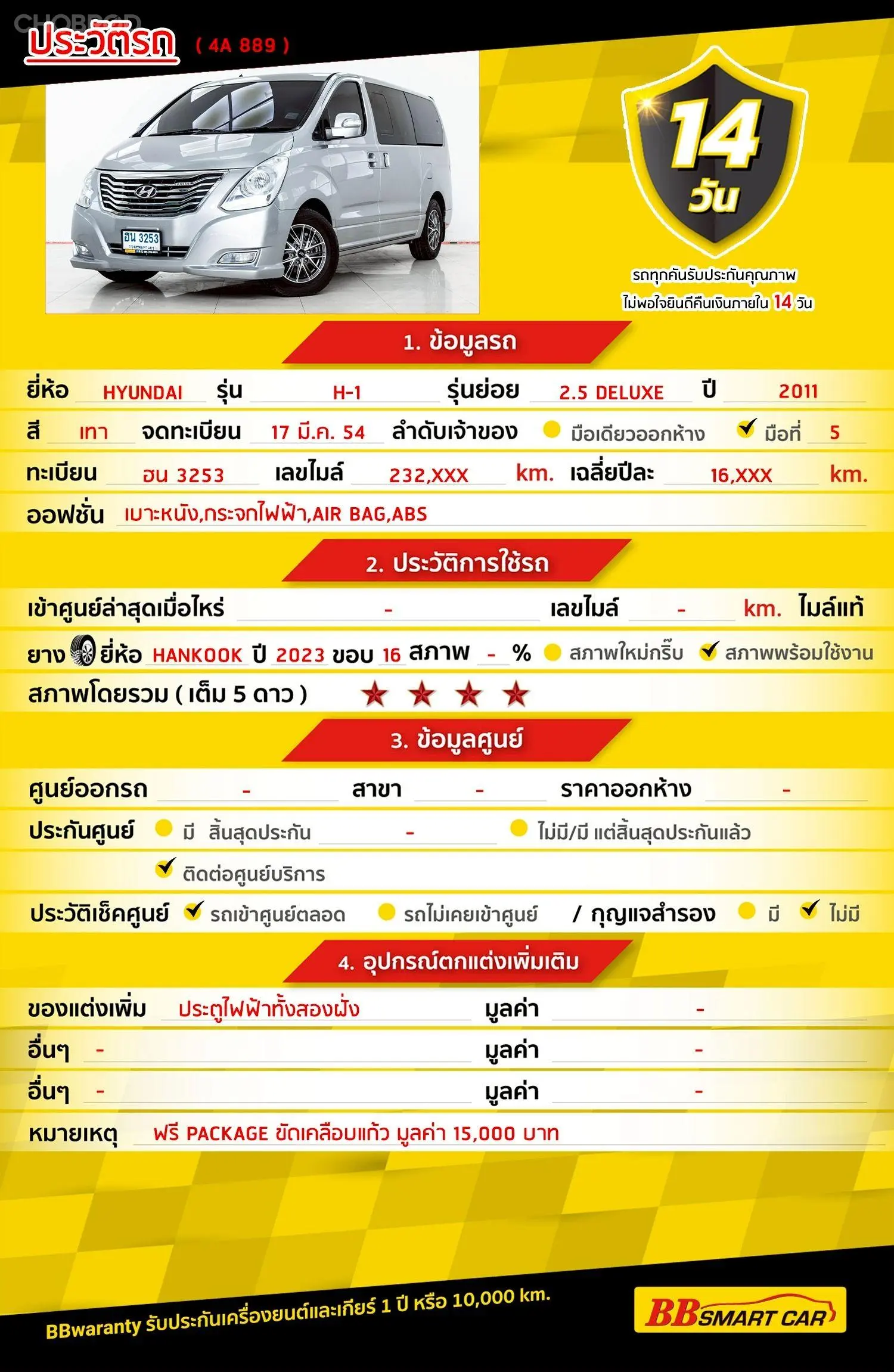 HYUNDAI H1 2.5 DELUXE 2011 ออกรถ 0 บาท จัดได้ 399,000 บ. Line:@********แสดงข้อมูล 🔥จอง 199 บาท ส่งบัตรประชาชน รู้ผลพิจารณาภายใน 30 นาที ไม่ผ่านคืนเงินจองทุกกรณี 🔥ซื้อรถกับ BB พร้อมให้คำปรึกษา แก้ทุกปัญหา ให้ทุกเรื่อง บริการ call center 24 ชม. 🔥BB Care Plus รับประกันหลังการขาย สูงสุด 2 ปี หรือ 20,000 km.. 🔥มีรถให้เลือกมากกว่า 1,600 คัน บีบีสมาร์ทคาร์ 4 สาขากาญจนาภิเษก รหัส 4A889 ราคา 379,000 บ. ผ่อนเพียง 7,730 บาท Brand. : HYUNDAI Year : 2011 Model. : H-1 Grade. : 2.5 DELUXE Engine. : 2500 CC. Type : ดีเซล Gearbox : A/T Color : เทา Mileage. : 232,XXX km. (ซื้อสด ราคานี้ยังไม่รวมค่าดำเนินการ 10,000 บ.) 🚩 Price. 379,000 บาท ยอดจัด : 389,000 บาท เงินดาวน์. : ฟรีเงินดาวน์ ประกันภัย : ฟรีประกันภัย 1 ปี ค่าดำเนินการ : 10,000บาท รวมออกรถ 0 บาท ผ่อน 36 งวด = 13,730 บาท ผ่อน 48 งวด = 10,839 บาท ผ่อน 60 งวด = 9,191 บาท ผ่อน 72 งวด = 8,209 บาท ผ่อน 84 งวด = 7,730 บาท เงื่อนไขเป็นไปตามที่ไฟแนนซ์กำหนด** โปรโมชั่นพิเศษ สำหรับลกค้าเครดิตดี 🚩เลือกรับเรทดอกเบี้ยพิเศษ 📍36 งวด = 1.29 % 📍48 งวด = 1.99 % 📍60 งวด = 2.39 % 📍72 งวด = 3.59 % 🔥 เงื่อนไข โปรโมชั่น ดอกเบี้ยเริ่มต้น 1.29% ตลอดอายุสัญญา - ยอดจัดไฟแนนซ์ 300,000-600,0000 บาท - ผ่อนสูงสุด 72 เดือน - เป็นลูกค้าประวัติดี พนักงานประจำเงินเดือน 20,000 ขึ้นไป - ค่าดำเนินการแคมเปญ 20,000 บาท (รวมในยอดจัดได้) 🎗Car Hightlight รถใหม่มาแล้วค่ะ HYUNDAI ปี 2011 รถตู้ครอบครัว/เอนกประสงค์ขนาดใหญ่ รุ่นยอดนิยม เครื่องดีเซล 2.5 ซีซี ขับขี่นุ่มนวล ประหยัดน้ำมัน ใช้งานได้ทั้งงานส่วนตัวและเชิงพาณิชย์ 🎗ภายใน • แอร์รอบคัน แยกหน้า–หลัง เย็นทั่วถึง • เครื่องเสียงครบ CD/USB/MP3 + ลำโพงรอบคัน • เบาะหนัง กว้าง นั่งได้ 11 ที่นั่ง แถว 2 Captain Seat • กระจกไฟฟ้า กระจกมองข้างปรับไฟฟ้า • ถุงลมคู่หน้า + ABS/EBD ปลอดภัยมั่นใจ 🎗ภายนอก • ตัวถังสีเงิน ดีไซน์ใหญ่หรู ดูภูมิฐาน • กระจังหน้าโครเมียม ไฟหน้าขนาดใหญ่ส่องสว่างชัด • กันชนและไฟตัดหมอกครบ • กระจกมองข้างพร้อมไฟเลี้ยวในตัว • ล้อแม็กซ์เสริมความพรีเมียม แข็งแรงทุกการเดินทาง 🚐✨ 🎗ความคุ้มค่า สำหรับรถคันนี้แล้วคุณภาพที่ลูกค้าได้รับ ถือว่ามาแบบเต็มสุดๆทั้งระบบรักษาความปลอดภัยและเทคโนโลยีต่างๆที่มากับตัวรถนับว่าคุ้มสุดๆ กำลังเครื่องดี ไม่ว่าจะทางเรียบหรือขรุขระทนรทานกับทุกพื้นผิวถนน ดูแลง่าย ในราคาที่แสนสบายกระเป๋าด้วยจ้า ⭐️การรับประกันหลังการขาย BB Care Plus สูงสุด 2 ปี หรือ 20,000 km. ด้วยช่างที่ผ่านการอบรมจากศูนย์ชั้นนำของประเทศ 🎉Special offer เฉพาะ บีบีสมาร์ทคาร์ ที่นี่ที่เดียว ⭐ดอกเบี้ยเริ่มต้น 1.29% มีไฟแนนซ์รองรับหลายที่ค่ะ ⭐ฟรี!! แพคเก็จ ขัดเคลือบแก้ว มูลค่า 15,000 บาท ทุกคัน ⭐อนุมัติไว 30 นาที นำเอกสารมาให้ครบรับรถกลับบ้านทันทีค่ะ ⭐BB Care Plus รับประกันหลังการขาย สูงสุด 2 ปี หรือ 20,000 km. ⭐มี 6 สาขา ในกรุงเทพและปริมณฑลใกล้บ้า