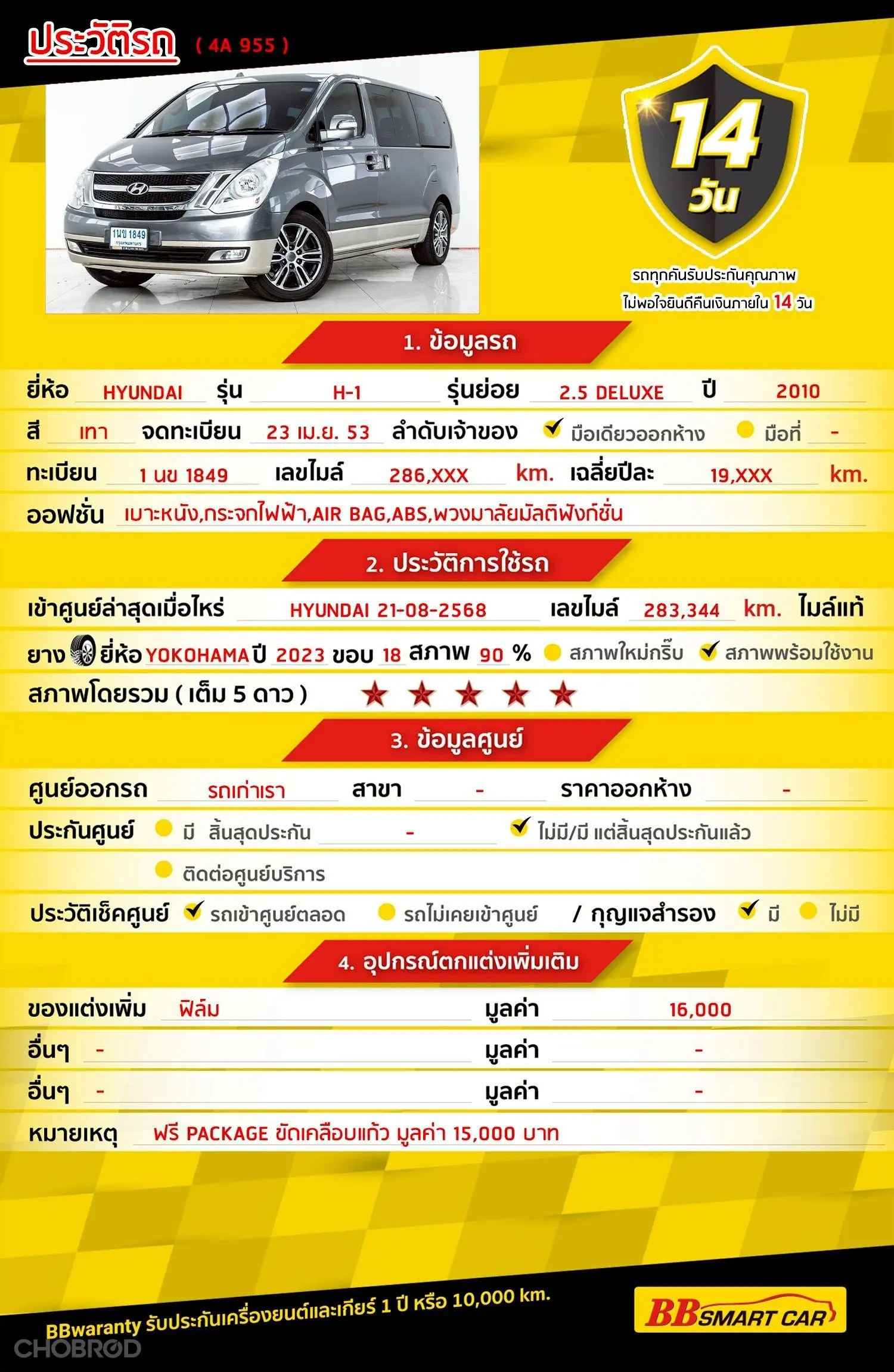 HYUNDAI H-1 2.5 DELUXE 2010 ออกรถ 0 บาท จัดได้ 429,000 บ. Line:@698epmtg 🔥จอง 199 บาท ส่งบัตรประชาชน รู้ผลพิจารณาภายใน 30 นาที ไม่ผ่านคืนเงินจองทุกกรณี 🔥ซื้อรถกับ BB พร้อมให้คำปรึกษา แก้ทุกปัญหา ให้ทุกเรื่อง บริการ call center 24 ชม. 🔥BB Care Plus รับประกันหลังการขาย สูงสุด 2 ปี หรือ 20,000 km.. 🔥มีรถให้เลือกมากกว่า 1,800 คัน บีบีสมาร์ทคาร์ 4 สาขากาญจนาภิเษก รหัส 4A955 ราคา 409,000 บาท ผ่อนเพียง 8,954 บาท Brand. : HYUNDAI Year. : 2010 Model. : H-1 Grade. : 2.5 DELUXE Engine. : 2500 CC Type. : ดีเซล Gearbox : AT Color. : เทา Mileage. : 286,XXX km. (ซื้อสด ราคานี้ยังไม่รวมค่าดำเนินการ 10,000 บ.) 🚩 Price. 409,000 บาท ยอดจัด : 419,000 บาท เงินดาวน์ : 0 บาท ประกันภัย : ฟรีประกันภัย 1 ปี ค่าดำเนินการ : 10,000 บาท รวมออกรถ : 0 บาท ผ่อน 36 งวด = 14,616 บาท ผ่อน 48 งวด = 11,651 บาท ผ่อน 60 งวด = 9,962 บาท ผ่อน 72 งวด = 8,954 บาท เงื่อนไขเป็นไปตามที่ไฟแนนซ์กำหนด** โปรโมชั่นพิเศษ สำหรับลกค้าเครดิตดี 🚩เลือกรับเรทดอกเบี้ยพิเศษ 📍36 งวด = 1.29 % 📍48 งวด = 1.99 % 📍60 งวด = 2.39 % 📍72 งวด = 3.59 % 🔥 เงื่อนไข โปรโมชั่น ดอกเบี้ยเริ่มต้น 1.29% ตลอดอายุสัญญา - ยอดจัดไฟแนนซ์ 300,000-600,0000 บาท - ผ่อนสูงสุด 72 เดือน - เป็นลูกค้าประวัติดี พนักงานประจำเงินเดือน 20,000 ขึ้นไป - ค่าดำเนินการแคมเปญ 20,000 บาท (รวมในยอดจัดได้) 🎗Car Hightlight รถสวยๆ วันนี้ขอแนะนำ HYUNDAI H-1 2.5 DELUXE AT 2010 รถตู้เอนกประสงค์ที่ได้รับความนิยมอย่างมากในตลาดรถมือสองของไทย ด้วยความกว้างขวาง ความสะดวกสบาย และความทนทาน ทำให้ยังคงเป็นตัวเลือกที่น่าสนใจสำหรับหลายๆ คน ความทนทานในราคาที่จับต้องได้ หากคุณกำลังมองหารถสำหรับครอบครัวใหญ่ หรือเพื่อการพาณิชย์ รถคันนี้เป็นตัวเลือกที่น่าสนใจ 🎗ภายใน ภายในลายไม้ พวงมาลัย Multifunction Airbag เบาะหนัง เบรค ABS กระจกไฟฟ้า จอ LCD เล่น DVD พวงมาลัยเพาเวอร์ เซ็นทรัลล๊อก วิทยุ - CD แอร์ เบาะกึ่งหนัง กุญแจรีโมท-สัญญานกันขโมย 🎗ภายนอก กระจกมองข้างปรับไฟฟ้า ไฟตัดหมอก กล้องส่องหลัง เซนเซอร์ถอยหลัง ไฟเลี้ยวกระจกมองข้าง สปอยเลอร์หลัง ตัวรถสีเทา หรูหรา ไม่มีชนหนักแน่นอนค่ะ 🎗ความคุ้มค่า สำหรับรถคันนี้แล้วคุณภาพที่ลูกค้าได้รับ ถือว่ามาแบบเต็มสุดๆทั้งระบบรักษาความปลอดภัยและเทคโนโลยีต่างๆที่มากับตัวรถนับว่าคุ้มสุดๆ กำลังเครื่องดี ไม่ว่าจะทางเรียบหรือขรุขระทนรทานกับทุกพื้นผิวถนน ดูแลง่าย ในราคาที่แสนสบายกระเป๋าด้วยจ้า ⭐️การรับประกันหลังการขาย BB Care Plus สูงสุด 2 ปี หรือ 20,000 km. ด้วยช่างที่ผ่านการอบรมจากศูนย์ชั้นนำของประเทศ 🎉Special offer เฉพาะ บีบีสมาร์ทคาร์ ที่นี่ที่เดียว ⭐ดอกเบี้ยเริ่มต้น 1.29% มีไฟแนนซ์รองรับหลายที่ค่ะ ⭐ฟรี!! แพคเก็จ ขัดเคลือบแก้ว มูลค่า 15,000 บาท ทุกคัน ⭐อนุมัติไว 30 นาที นำเอกสารมาให้ครบรับรถกลับบ้านทันทีค่ะ ⭐BB Care Plus รับประกันหลังการขาย สูงสุด 2 ปี หรือ 20,000 km. ⭐มี 6 สาขา