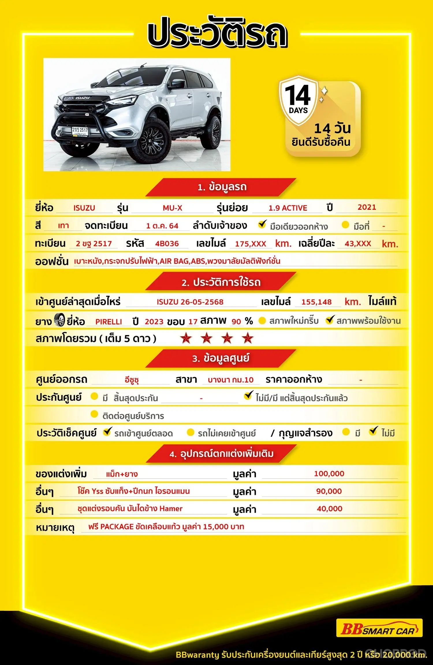 ISUZU MU-X 1.9 ACTIVE 2021 ออกรถ 0 บาท จัดได้ 819,000 บ. Line:@698epmtg 🔥จอง 199 บาท ส่งบัตรประชาชน รู้ผลพิจารณาภายใน 30 นาที ไม่ผ่านคืนเงินจองทุกกรณี 🔥ซื้อรถกับ BB พร้อมให้คำปรึกษา แก้ทุกปัญหา ให้ทุกเรื่อง บริการ call center 24 ชม. 🔥BB Care Plus รับประกันหลังการขาย สูงสุด 2 ปี หรือ 20,000 km.. 🔥มีรถให้เลือกมากกว่า 1,800 คัน สาขา4 ถนนกาญจนาภิเษกใกล้กับสมาคมปักษ์ใต้ รหัสรถ 4B036 ราคา 799,000 บ. ผ่อนเพียง 13,544 บาท Brand. : ISUZU Year. : 2021 Model. : MU-X Grade. : 1.9 ACTIVE Engine. : 1900 CC. Type. : ดีเซล Gearbox : A/T Color. : เทา Mileage. : 175,XXX km. (ซื้อสด ราคานี้ยังไม่รวมค่าดำเนินการ 10,000 บ.) 🚩 Price. 799,000 บาท ยอดจัด : 809,000 บาท เงินดาวน์. : ฟรีดาวน์ ประกันภัย : ฟรีประกันภัย 1 ปี ค่าดำเนินการ : 10,000 บาท รวมออกรถ 0 บาท ผ่อน36 = 26,058 บาท ผ่อน48 = 20,046 บาท ผ่อน60 = 16,657 บาท ผ่อน72 = 14,901 บาท ผ่อน84 = 13,544 บาท *เงื่อนไขเป็นไปตามที่ไฟแนนซ์กำหนด โปรโมชั่นพิเศษ สำหรับลกค้าเครดิตดี 🚩เลือกรับเรทดอกเบี้ยพิเศษ 📍36 งวด = 1.29 % 📍48 งวด = 1.99 % 📍60 งวด = 2.39 % 📍72 งวด = 3.59 % 🔥 เงื่อนไข โปรโมชั่น ดอกเบี้ยเริ่มต้น 1.29% ตลอดอายุสัญญา - ยอดจัดไฟแนนซ์ 300,000-600,0000 บาท - ผ่อนสูงสุด 72 เดือน - เป็นลูกค้าประวัติดี พนักงานประจำเงินเดือน 20,000 ขึ้นไป - ค่าดำเนินการแคมเปญ 20,000 บาท (รวมในยอดจัดได้) 🎗Car Hightlight มาแล้วค่ะ !! ISUZU MU-X 1.9 ACTIVE 2021 หนึ่งใน PPV (รถอเนกประสงค์พื้นฐานกระบะ) ที่ได้รับความนิยมสูงมากในตลาดมือสองปัจจุบัน ด้วยชื่อเสียงเรื่องความทนทานของเครื่องยนต์และความประหยัด 🎗ภายใน แอร์ เซ็นทรัลล๊อก เบรกมือไฟฟ้า กุญแจรีโมท-สัญญานกันขโมย จอ LCD เล่น DVD พวงมาลัย Multifunction กระจกไฟฟ้า พวงมาลัยเพาเวอร์ เบาะหนัง เบาะกึ่งหนัง วิทยุ - CD Airbag เบรค ABS 🎗ภายนอก กระจกมองข้างปรับไฟฟ้า บันไดข้าง ไฟโปรเจคเตอร์ ล้อแม็ก กันชนแต่ง เซนเซอร์รอบคัน กล้องส่องหลัง สปอยเลอร์หลัง ไฟตัดหมอก 🎗ความคุ้มค่า เป็นแบรนด์ที่ซื้อง่ายขายคล่อง ดูแลง่ายมากๆค่ะ ศูนย์บริการก็เยอะ มีทั่วประเทศอะไหล่หาง่ายทั้งนอกและในศูนย์ เหมาะกับการนำไปใช้ประกอบอาชีพได้ เทียบกับราคานี้ถือว่าคุ้มค่ามากๆเลยค่ะ ⭐️การรับประกันหลังการขาย BB Care Plus สูงสุด 2 ปี หรือ 20,000 km. ด้วยช่างที่ผ่านการอบรมจากศูนย์ชั้นนำของประเทศ 🎉Special offer เฉพาะ บีบีสมาร์ทคาร์ ที่นี่ที่เดียว ⭐ดอกเบี้ยเริ่มต้น 1.29% มีไฟแนนซ์รองรับหลายที่ค่ะ ⭐ฟรี!! แพคเก็จ ขัดเคลือบแก้ว มูลค่า 15,000 บาท ทุกคัน ⭐อนุมัติไว 30 นาที นำเอกสารมาให้ครบรับรถกลับบ้านทันทีค่ะ ⭐BB Care Plus รับประกันหลังการขาย สูงสุด 2 ปี หรือ 20,000 km. ⭐มี 6 สาขา ในกรุงเทพและปริมณฑลใกล้บ้านท่าน ⭐รถทุกคันผ่านตรวจสอบ Inspection เรียบแล้วค่ะ ผ่าน 5 ดาวทุกคันค่ะ ⭐เซลล์ทุกท่านเป็นมืออาชีพพร้อมให้บริการทุกท่านแน่นอนค่ะ เลือกข้อเสนอที่ให้คุณมากกว่าที่อื่น เพราะเราเล็งเห็นแล้ว ที่บีบ