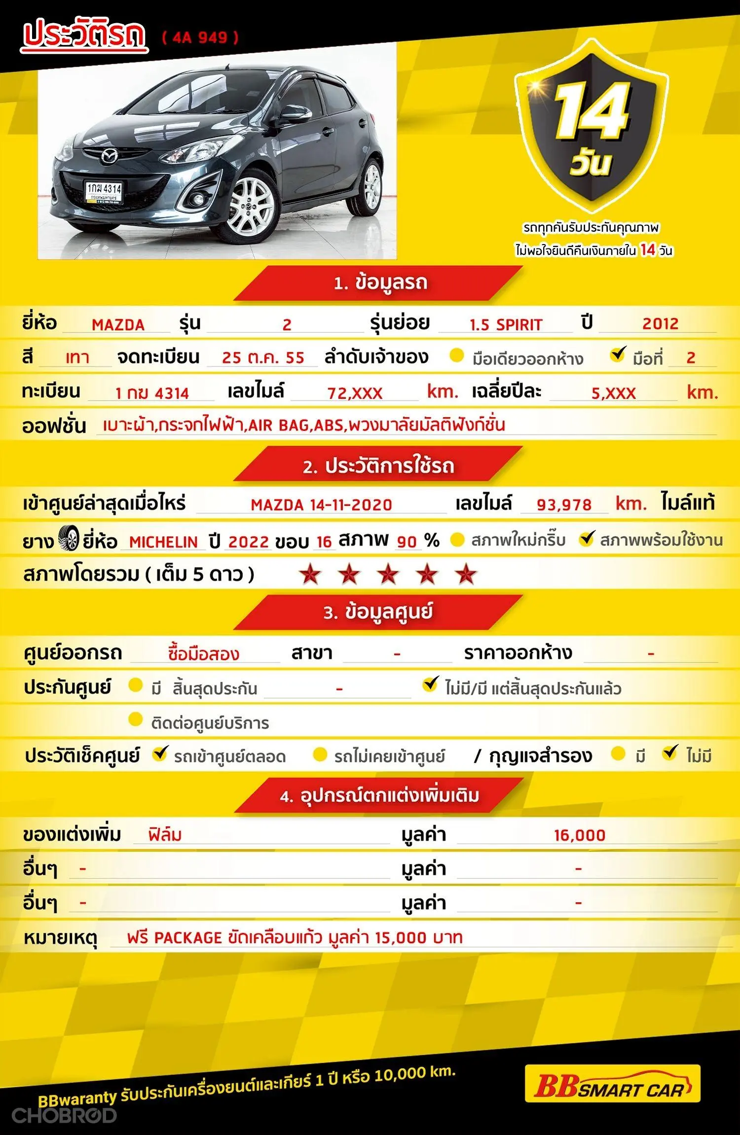 MAZDA 2 1.5 SPIRIT 2012 ออกรถ 0 บาท จัดได้ 149,000 บ. Line:@********แสดงข้อมูล 🔥จอง 199 บาท ส่งบัตรประชาชน รู้ผลพิจารณาภายใน 30 นาที ไม่ผ่านคืนเงินจองทุกกรณี 🔥ซื้อรถกับ BB พร้อมให้คำปรึกษา แก้ทุกปัญหา ให้ทุกเรื่อง บริการ call center 24 ชม. 🔥BB Care Plus รับประกันหลังการขาย สูงสุด 2 ปี หรือ 20,000 km.. 🔥มีรถให้เลือกมากกว่า 1,800 คัน บีบีสมาร์ทคาร์ 4 สาขากาญจนาภิเษก รหัส 4A949 ราคา 129,000 บ. ผ่อนเพียง 2,701 บาท Brand. : MAZDA Year : 2012 Model. : 2 / 5DR Grade. : 1.5 SPIRIT SPORT Engine. : 1500 CC. Type : เบนซิน Gearbox : A/T Color : เทา Mileage. : 172,XXX km. (ซื้อสด ราคานี้ยังไม่รวมค่าดำเนินการ 10,000 บ.) 🚩 Price. 129,000 บาท ยอดจัด : 139,000 บาท เงินดาวน์. : ฟรีเงินดาวน์ ประกันภัย : ฟรีประกันภัย 1 ปี ค่าดำเนินการ : 10,000บาท รวมออกรถ 0 บาท ผ่อน36 = 4,782 บาท ผ่อน48 = 3,749 บาท ผ่อน60 = 3,223 บาท ผ่อน72 = 2,871 บาท ผ่อน84 = 2,701 บาท *เงื่อนไขเป็นไปตามที่ไฟแนนซ์กำหนด โปรโมชั่นพิเศษ สำหรับลูกค้าเครดิตดี 🚩เลือกรับเรทดอกเบี้ยพิเศษ 📍36 งวด = 1.29 % 📍48 งวด = 1.99 % 📍60 งวด = 2.39 % 📍72 งวด = 3.59 % 🔥 เงื่อนไข โปรโมชั่น ดอกเบี้ยเริ่มต้น 1.29% ตลอดอายุสัญญา - ยอดจัดไฟแนนซ์ 300,000-600,0000 บาท - ผ่อนสูงสุด 72 เดือน - เป็นลูกค้าประวัติดี พนักงานประจำเงินเดือน 20,000 ขึ้นไป - ค่าดำเนินการแคมเปญ 20,000 บาท (รวมในยอดจัดได้) 🎗Car Hightlight รถใหม่มาแล้วค่ะ Mazda 2 4 ประตู ปี 2013 ยังคงความเป็นสปอร์ตที่เร้าใจและเป็นครั้งแรกกับนวัตกรรมสุดล้ำ เพื่อควบคุมการขับขี่ และเทคโนโลยีความปลอดภัยอย่างมาพร้อมด้วยฟังก์ชั่นมากมาย 🎗ภายใน เบรค ABS กระจกไฟฟ้า Airbag เบาะผ้า พวงมาลัยเพาเวอร์ เซ็นทรัลล๊อก วิทยุ - CD กุญแจรีโมท-สัญญานกันขโมย พวงมาลัย Multifunction แอร์ 🎗ภายนอก กระจกมองข้างปรับไฟฟ้า คิ้วกันสาด กระจกมองข้างพับไฟฟ้า ไฟตัดหมอก เซนเซอร์รอบคัน ไฟเลี้ยวกระจกมองข้าง 🎗ความคุ้มค่า สำหรับรถคันนี้แล้วคุณภาพที่ลูกค้าได้รับ ถือว่ามาแบบเต็มสุดๆทั้งระบบรักษาความปลอดภัยและเทคโนโลยีต่างๆที่มากับตัวรถนับว่าคุ้มสุดๆ กำลังเครื่องดี ไม่ว่าจะทางเรียบหรือขรุขระทนรทานกับทุกพื้นผิวถนน ดูแลง่าย ในราคาที่แสนสบายกระเป๋าด้วยจ้า ⭐️การรับประกันหลังการขาย BB Care Plus สูงสุด 2 ปี หรือ 20,000 km. ด้วยช่างที่ผ่านการอบรมจากศูนย์ชั้นนำของประเทศ 🎉Special offer เฉพาะ บีบีสมาร์ทคาร์ ที่นี่ที่เดียว ⭐ดอกเบี้ยเริ่มต้น 1.29% มีไฟแนนซ์รองรับหลายที่ค่ะ ⭐ฟรี!! แพคเก็จ ขัดเคลือบแก้ว มูลค่า 15,000 บาท ทุกคัน ⭐อนุมัติไว 30 นาที นำเอกสารมาให้ครบรับรถกลับบ้านทันทีค่ะ ⭐BB Care Plus รับประกันหลังการขาย สูงสุด 2 ปี หรือ 20,000 km. ⭐มี 6 สาขา ในกรุงเทพและปริมณฑลใกล้บ้านท่าน ⭐รถทุกคันผ่านตรวจสอบ Inspection เรียบแล้วค่ะ ผ่าน 5 ดาวทุกคันค่ะ ⭐เซลล์ทุกท่านเป็นมืออาชีพพร้อมให้บริการทุกท่านแน่นอนค่ะ