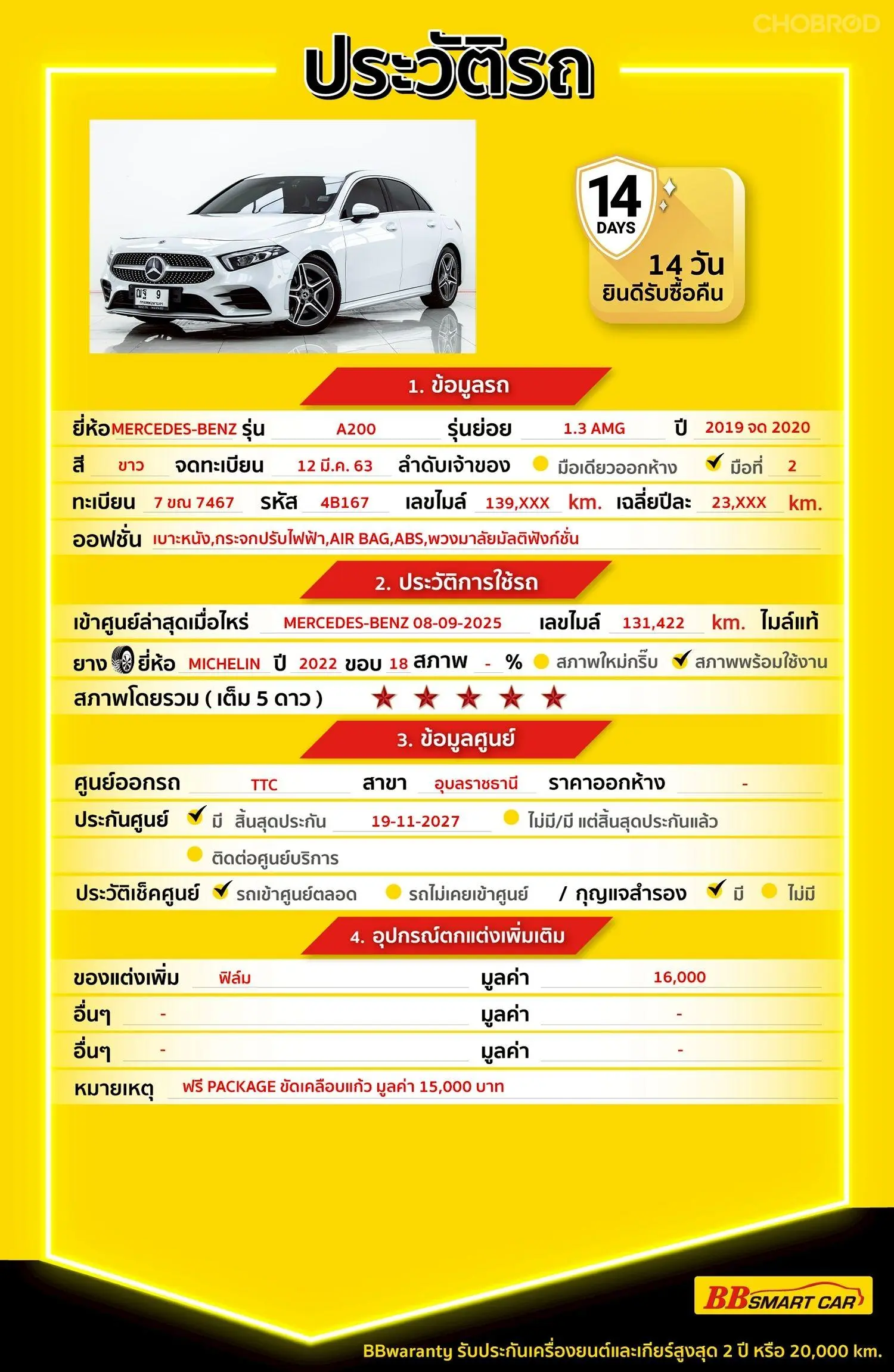 มีการรับประกันจากดีลเลอร์ (6 เดือน) มีบริการช่วยเหลือฉุกเฉินบนท้องถนน 24 ชม. จากดีลเลอร์
