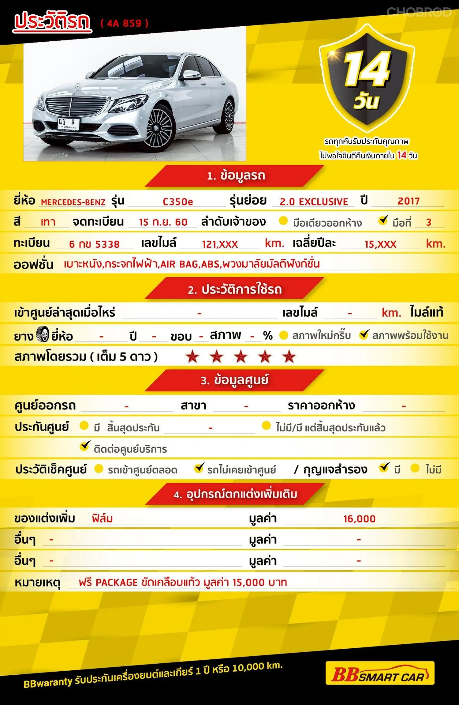 MERCEDES-BENZ C350e 2.0 EXCLUSIVE 2017 ออกรถ 0 บาท จัดได้ 609,000 บ. Line:@********แสดงข้อมูล 🔥จอง 199 บาท ส่งบัตรประชาชน รู้ผลพิจารณาภายใน 30 นาที ไม่ผ่านคืนเงินจองทุกกรณี 🔥ซื้อรถกับ BB พร้อมให้คำปรึกษา แก้ทุกปัญหา ให้ทุกเรื่อง บริการ call center 24 ชม. 🔥BB Care Plus รับประกันหลังการขาย สูงสุด 2 ปี หรือ 20,000 km.. 🔥มีรถให้เลือกมากกว่า 1,800 คัน บีบีสมาร์ทคาร์ 4 สาขากาญจนาภิเษก รหัสรถ 4A859 ราคา 589,000 บ. ผ่อนเพียง 10,196 บาท Brand. : MERCEDES-BENZ Year. : 2017 Model. : C-CLASS C350e Grade. : 2.0 EXCLUSIVE W205 Engine. : 2000 CC. Type. : เบนซิน Gearbox : A/T Color. : เทา Mileage. : 121,XXX km. (ซื้อสด ราคานี้ยังไม่รวมค่าดำเนินการ 10,000 บ.) 🚩 Price. 589,000 บาท ยอดจัด : 599,000 บาท เงินดาวน์. : ฟรีดาวน์ ประกันภัย : ฟรีประกันภัย 1 ปี ค่าดำเนินการ : 10,000 รวมออกรถ 0 บาท ผ่อน 36 = 19,616 บาท ผ่อน 48 = 15,090 บาท ผ่อน 60 = 12,538 บาท ผ่อน 72 = 11,217 บาท ผ่อน 84 = 10,196 บาท *เงื่อนไขเป็นไปตามที่ไฟแนนซ์กำหนด โปรโมชั่นพิเศษ สำหรับลูกค้าเครดิตดี 🚩เลือกรับเรทดอกเบี้ยพิเศษ 📍36 งวด = 1.29 % 📍48 งวด = 1.99 % 📍60 งวด = 2.39 % 📍72 งวด = 3.59 % 🔥 เงื่อนไข โปรโมชั่น ดอกเบี้ยเริ่มต้น 1.29% ตลอดอายุสัญญา - ยอดจัดไฟแนนซ์ 300,000-600,0000 บาท - ผ่อนสูงสุด 72 เดือน - เป็นลูกค้าประวัติดี พนักงานประจำเงินเดือน 20,000 ขึ้นไป - ค่าดำเนินการแคมเปญ 20,000 บาท (รวมในยอดจัดได้) 🎗Car Hightlight ทางเลือกพิเศษของยนตรกรรม จากเมอร์เซเดส-เบนซ์ ที่พร้อมปลุกเร้าความสปอร์ตโฉบเฉี่ยวด้วยรูปทรง ที่มีเอกลักษณ์เฉพาะตัว ผสานกับขุมพลังเบนซิน เทอร์โบ ที่ให้ความแรงเร้าใจใกล้เคียงรถสปอร์ตแท้ๆ 🎗ภายใน ให้ความหรูหรา ล้ำสมัย ผสานความสปอร์ตเต็มพิกัดในทุกรายละเอียด พวงมาลัยเพาเวอร์ เซ็นทรัลล๊อก จอ LCD เล่น DVD วิทยุ - CD เบาะหนังแท้ เบรกมือไฟฟ้า Airbag ม่านหลังไฟฟ้า เบาะกึ่งหนัง ภายในลายไม้ พวงมาลัย Multifunction แอร์ AUTO เบรค ABS แอร์ เกียร์ Paddle Shift กุญแจรีโมท-สัญญานกันขโมย ม่านบังแดดรอบคัน เบาะหนัง กระจกไฟฟ้า เบาะไฟฟ้าคู่หน้า 🎗ภายนอก มาพร้อมเอกลักษณ์การออกแบบที่โดดเด่น ประณีต พิถีพิถัน กระจกมองข้างปรับไฟฟ้า ไฟเลี้ยวกระจกมองข้าง กระจกมองข้างพับไฟฟ้า เซนเซอร์รอบคัน กล้องส่องหลัง รูปลักษณ์ภายนอกต้องบอกว่าน่าหลงใหลให้ความเฉียบคมในทุกรายละเอียด ด้วยรูปทรงโค้งมนอ่อนช้อยงดงาม พร้อมการตกแต่งรอบคันแบบ เสริมลุคสปอร์ตได้อย่างชัดเจน 🎗ความคุ้มค่า สำหรับคันนี้เป็นรถที่นิยมใช้กันในท้องตลาด สภาพดี ภายในกว้างขวาง เราคัดเลือกสภาพรถคันนี้มาแล้ว สภาพดีมากๆ เทียบกับราคานี้ถือว่าคุ้มค่าสุดๆ ไปเลยจ้า ⭐️การรับประกันหลังการขาย BB Care Plus สูงสุด 2 ปี หรือ 20,000 km. ด้วยช่างที่ผ่านการอบรมจากศูนย์ชั้นนำของประเทศ 🎉Special offer เฉพาะ บีบีสมาร์ทคาร์ ที่นี่ที่เดียว ⭐ดอกเบี้ยเริ่มต้น 1.29% มีไฟแนนซ์รองรับหลายที่ค่ะ ⭐ฟรี!! แพคเก็จ ขัดเคลือบแก