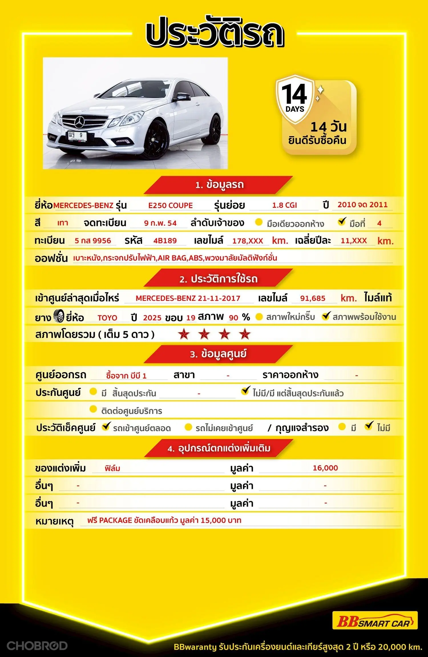 MERCEDES-BENZ E250 1.8 CGI COUPE 2011 ออกรถ 0 บาท จัดได้ 569,000 บ. Line:@698epmtg 📍BBsmartcar สาขา 4 ถนนกาญจนาภิเษกใกล้กับสมาคมปักษ์ใต้ MERCEDES-BENZ E-CLASS E250 COUPE W207 AT 2011 💸price 549,000 บาท *** Highlight *** E250 COUPE W207 ปี 2011 สีเงิน Iridium Silver Metallic คูเป้หรูดีไซน์อมตะแบบไม่มีเสา B ชุดแต่ง AMG รอบคัน เครื่องเทอร์โบขับสนุก และภาพลักษณ์ที่ดูแพงตลอดกาล ออปชันล้น สภาพสวยพร้อมขับ ไมล์น้อยเช็กศูนย์ตลอด หายาก วิ่งเพียง 178,XXX KM. ประวัติเช็กศูนย์ เจ้าของรถซื้อสะสม เน้นจอดเป็นหลัก ประหยัดจากป้ายแดงได้เกือบ 3.5 M 💎รับประกันโครงสร้างรถ ไม่เคยประสบอุบัติเหตุหนัก พลิกคว่ำ น้ำท่วม หรือไฟไหม้ โครงสร้างและแชสซีอยู่ในสภาพสมบูรณ์ 💎BB Care Plus รับประกันหลังการขายสูงสุด 2 ปี หรือ 20,000 km. 💎ไม่พอใจ ยินดีคืนเงินภายใน 14 วัน 🔥คลิ๊กที่ลิงก์เพื่อดู วิดีโอคันนี้,ประวัติรถ,รูปภาพภายนอกและรูปภายใน https://www.bbsmartcar.com/web-php/index.php/site/cardetail/20260218FEC70D09F01E 🔥เรามีรถรุ่นนี้ให้เลือกชมอีก 24 คัน https://www.bbsmartcar.com/web-php/index.php/site/car?name_brand=MERCEDES-BENZ&modelCar=E-CLASS&search=one 🔥มีรถให้เลือกมากกว่า 1,800 คัน https://www.bbsmartcar.com/web-php/index.php/site/home NO. 4B189 Brand. : MERCEDES-BENZ Year. : 2011 Model. : E-CLASS E250 Grade. : 1.8 CGI COUPE W207 Engine. : 1800 CC Type. : เบนซิน Gearbox : A/T Color. : เทาดำ Mileage. : 178,XXX km. (ซื้อสด ราคานี้ยังไม่รวมค่าดำเนินการ 10,000 บ.) เงินดาวน์. : ฟรีดาวน์ ประกันภัย : ฟรีประกันภัย 1 ปี ค่าดำเนินการ : 10,000 รวมออกรถ 0 บาท ผ่อน 72 = 11,547 บาท ผ่อน 84 = 10,859 บาท *เงื่อนไขเป็นไปตามที่ไฟแนนซ์กำหนด โปรโมชั่นพิเศษ สำหรับลูกค้าเครดิตดี 🚩เลือกรับเรทดอกเบี้ยพิเศษ 📍36 งวด = 1.29 % 📍48 งวด = 1.99 % 📍60 งวด = 2.39 % 📍72 งวด = 3.59 % 🔥 เงื่อนไข โปรโมชั่น ดอกเบี้ยเริ่มต้น 1.29% ตลอดอายุสัญญา - ยอดจัดไฟแนนซ์ 300,000-600,0000 บาท - ผ่อนสูงสุด 72 เดือน - เป็นลูกค้าประวัติดี พนักงานประจำเงินเดือน 20,000 ขึ้นไป - ค่าดำเนินการแคมเปญ 20,000 บาท (รวมในยอดจัดได้) จุดเด่นออปชั่น - ดีไซน์ Pillarless หนึ่งเดียว: เสน่ห์ของรถคูเป้เบนซ์ที่ไม่มีเสา B (เสากลาง) เปิดกระจกแล้วโล่งหรูหรา โดดเด่นไม่เหมือนใคร - เครื่องยนต์ Turbo CGI: 1.8 เทอร์โบ 204 แรงม้า อัตราเร่งดี ขับสนุก และบำรุงรักษาง่ายกว่ารุ่นไฮบริด - ลุคสปอร์ต AMG: มาพร้อมชุดแต่ง AMG Bodystyling รอบคัน เพิ่มความดุดันและดูทันสมัยตลอดกาล - ภาพลักษณ์ระดับ High-End: เป็นรถ 2 ประตูที่ให้ภาพลักษณ์ดูรวยและภูมิฐาน ในราคาที่จับต้องได้ง่ายในปัจจุบัน - หลังคา Panoramic Sunroof: หลังคาแก้วเต็มบาน เพิ่มความโปร่งสบายและหรูหราให้กับห้องโดยสาร 🎗ภายใน พวงมาลัยเพาเวอร์ เบาะหนังแท้ แอร์ AUTO เบรค ABS พวงมาลัย Multifunction จอ LCD เล่น DVD แอร์ Airbag วิทยุ - CD เซ็นทรัลล๊อก เกียร์ Paddle Shift กุญแจรีโมท-สัญญานกันขโมย กระจกไฟฟ้า เบาะไฟฟ้าคู่หน้า เบาะหนัง 🎗ภายนอก กระจกมองข้างปรับไฟฟ้า ล้อแม็ก ไฟเลี้ยวกระจกมองข้าง ไฟโปรเจคเตอร์ ไฟตัดหมอก กล้องส่องหลัง กระจกมองข้างพับไฟฟ้า เซนเซอร์รอบคัน 