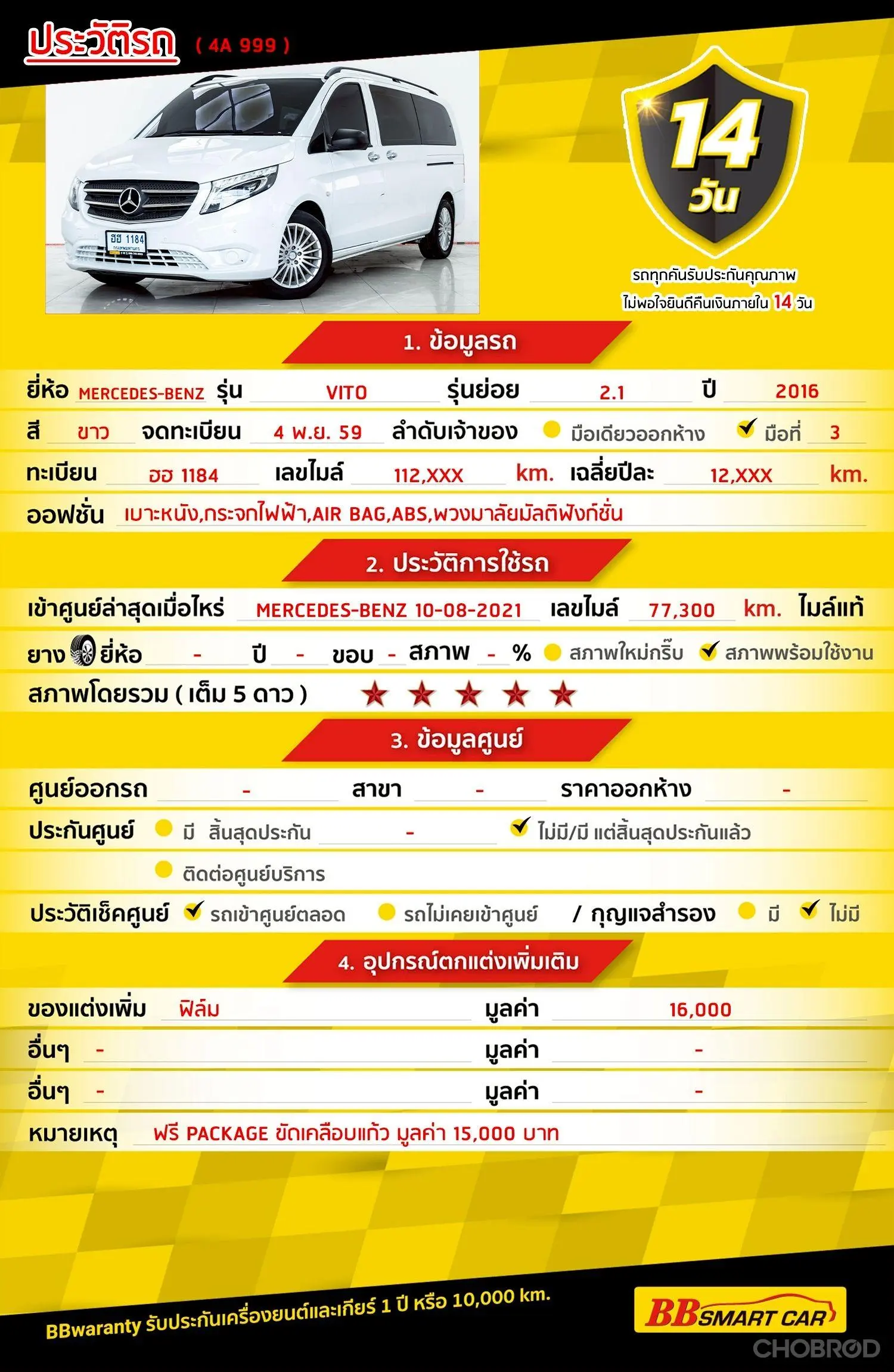 MERCEDES-BENZ VITO 2.2 116 CDI 2016 ออกรถ 0 บาท จัดได้ 949,000 บ. Line:@698epmtg 🔥จอง 199 บาท ส่งบัตรประชาชน รู้ผลพิจารณาภายใน 30 นาที ไม่ผ่านคืนเงินจองทุกกรณี 🔥ซื้อรถกับ BB พร้อมให้คำปรึกษา แก้ทุกปัญหา ให้ทุกเรื่อง บริการ call center 24 ชม. 🔥BB Care Plus รับประกันหลังการขาย สูงสุด 2 ปี หรือ 20,000 km.. 🔥มีรถให้เลือกมากกว่า 1,800 คัน สาขา4 ถนนกาญจนาภิเษกใกล้กับสมาคมปักษ์ใต้ รหัสรถ 4A999 ราคา 929,000 บ. ผ่อนเพียง 17,562 บาท Brand. : MERCEDES-BENZ Year. : 2016 Model. : VITO Grade. : 2.2 116 CDI Engine. : 2200 CC Type. : ดีเซล Gearbox : A/T Color. : ขาว Mileage. : 112,XXX km. (ซื้อสด ราคานี้ยังไม่รวมค่าดำเนินการ 10,000 บ.) 🚩 Price. 929,000 บาท ยอดจัด : 939,000 บาท เงินดาวน์. : ฟรีดาวน์ ประกันภัย : ฟรีประกันภัย 1 ปี ค่าดำเนินการ : 10,000 รวมออกรถ 0 บาท ผ่อน 36 = 31,836 บาท ผ่อน 48 = 24,858 บาท ผ่อน 60 = 20,839 บาท ผ่อน 72 = 18,802 บาท ผ่อน 84 = 17,562 บาท *เงื่อนไขเป็นไปตามที่ไฟแนนซ์กำหนด โปรโมชั่นพิเศษ สำหรับลูกค้าเครดิตดี 🚩เลือกรับเรทดอกเบี้ยพิเศษ 📍36 งวด = 1.29 % 📍48 งวด = 1.99 % 📍60 งวด = 2.39 % 📍72 งวด = 3.59 % 🔥 เงื่อนไข โปรโมชั่น ดอกเบี้ยเริ่มต้น 1.29% ตลอดอายุสัญญา - ยอดจัดไฟแนนซ์ 300,000-600,0000 บาท - ผ่อนสูงสุด 72 เดือน - เป็นลูกค้าประวัติดี พนักงานประจำเงินเดือน 20,000 ขึ้นไป - ค่าดำเนินการแคมเปญ 20,000 บาท (รวมในยอดจัดได้) 🎗Car Hightlight MERCEDES-BENZ VITO 2.2 116 CDI AT 2016 เป็นรถตู้เชิงพาณิชย์ที่ได้รับความนิยมอย่างมาก ด้วยจุดเด่นหลายประการที่ทำให้เป็นตัวเลือกที่น่าสนใจสำหรับธุรกิจและ การใช้งานส่วนตัว โดดเด่นทั้งในด้านสมรรถนะ ความปลอดภัย ความสะดวกสบาย และภาพลักษณ์ที่หรูหรา เหมาะสำหรับผู้ที่ต้องการรถตู้ที่มีคุณภาพสูง ทนทาน และสามารถตอบโจทย์การใช้งานได้หลากหลาย ทั้งการขนส่งผู้โดยสาร การขนส่งสินค้า หรือแม้กระทั่งการนำไปดัดแปลงเป็นรถบ้านเคลื่อนที่ 🎗ภายใน เบาะนั่ง: เบาะหนังแท้ สามารถปรับพับหรือถอดออกได้หลากหลายรูปแบบ พวงมาลัย: มัลติฟังก์ชัน ระบบปรับอากาศ: ระบบปรับอากาศ แอร์ AUTO เครื่องเสียง: วิทยุ CD/MP3 พร้อมช่องเชื่อมต่อ AUX/USB หน้าจอแสดงข้อมูล: จอแสดงข้อมูลการขับขี่แบบดิจิตอล กระจกหน้าต่าง: กระจกไฟฟ้า ระบบความปลอดภัย: ถุงลมนิรภัย, ESP, ABS, ASR 🎗ภายนอก ไฟหน้า: ฮาโลเจน พร้อมระบบปรับระดับสูง-ต่ำ กระจกมองข้าง: ปรับไฟฟ้า ล้อ: ล้ออัลลอย ประตู: ประตูบานเลื่อนคู่ไฟฟ้า 🎗ความคุ้มค่า สำหรับคันนี้เป็นรถที่นิยมใช้กันในท้องตลาด สภาพดี ภายในกว้างขวาง เราคัดเลือกสภาพรถคันนี้มาแล้ว สภาพดีมากๆ เทียบกับราคานี้ถือว่าคุ้มค่าสุดๆ ไปเลยจ้า ⭐️การรับประกันหลังการขาย BB Care Plus สูงสุด 2 ปี หรือ 20,000 km. ด้วยช่างที่ผ่านการอบรมจากศูนย์ชั้นนำของประเทศ 🎉Special offer เฉพาะ บีบีสมาร์ทคาร์ ที่นี่ที่เดียว ⭐ดอกเบี้ยเริ่มต้น 1.29% มีไฟแนนซ์รองรับหลายที่ค่ะ ⭐ฟรี!! แพคเก็จ ขัดเคลือบแก้ว มูลค่า 15,000 