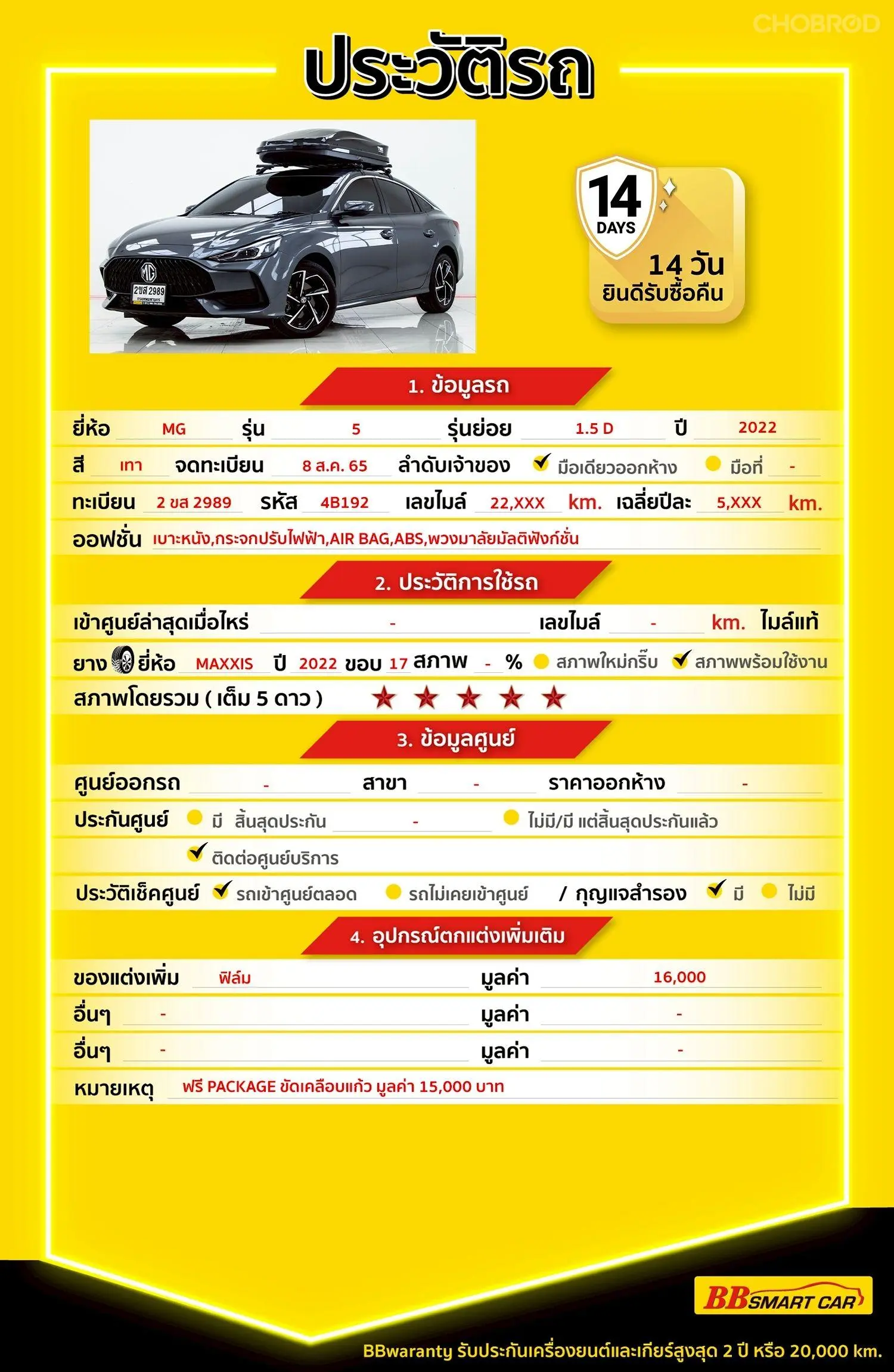 MG 5 1.5 D 2022 ออกรถ 0 บาท จัดได้ 379,000 บ. Line:@698epmtg 🔥มีรถให้เลือกมากกว่า 1,800 คัน 🔥รถทุกคันผ่านตรวจสอบ Inspection เรียบแล้วค่ะ ผ่าน 5 ดาวทุกคันค่ะ 🔥ซื้อรถกับ BB พร้อมให้คำปรึกษา แก้ทุกปัญหา ให้ทุกเรื่อง บริการ call center 24 ชม. 🔥BB Care Plus รับประกันหลังการขาย สูงสุด 2 ปี หรือ 20,000 km. 🔥ฟรี!! แพคเก็จ ขัดเคลือบแก้ว มูลค่า 15,000 บาท ทุกคัน 🔥มี 6 สาขา ในกรุงเทพและปริมณฑลใกล้บ้านท่าน สาขา 4 ถนนกาญจนาภิเษกใกล้กับสมาคมปักษ์ใต้ รหัสรถ 4B192 ราคา 359,000 บาท ผ่อนเพียง 6,178 บาท Brand. : MG Year. : 2022 Model. : 5 Grade. : 1.5 D Engine. : 1500 CC Type. : เบนซิน Gearbox : A/T Color. : เทา Mileage. : 21,XXX km. (ซื้อสด ราคานี้ยังไม่รวมค่าดำเนินการ 10,000 บ.) 🚩 Price. 359,000 บาท ยอดจัด : 369,000 บาท เงินดาวน์ : 0 บาท ประกันภัย : ฟรีประกันภัย 1 ปี ค่าดำเนินการ : 10,000 บาท รวมออกรถ : 0 บาท ผ่อน 36 งวด = 11,886 บาท ผ่อน 48 งวด = 9,143 บาท ผ่อน 60 งวด = 7,597 บาท ผ่อน 72 งวด = 6,797 บาท ผ่อน 84 งวด = 6,178 บาท **เงื่อนไขเป็นไปตามที่ไฟแนนซ์กำหนด โปรโมชั่นพิเศษ สำหรับลูกค้าเครดิตดีลือกรับเรทดอกเบี้ยพิเศษ 📍36 งวด = 1.29 % 📍48 งวด = 1.99 % 📍60 งวด = 2.39 % 📍72 งวด = 3.59 % 🔥 เงื่อนไข โปรโมชั่น ดอกเบี้ยเริ่มต้น 1.29% ตลอดอายุสัญญา - ยอดจัดไฟแนนซ์ 300,000-600,000 บาท - ผ่อนสูงสุด 72 เดือน - เป็นลูกค้าประวัติดี พนักงานประจำเงินเดือน 20,000 ขึ้นไป - ค่าดำเนินการแคมเปญ 20,000 บาท (รวมในยอดจัดได้) 🎗Car Hightlight รถสวยๆ วันนี้ขอแนะนำ MG 5 1.5 D AT 2022 จุดเด่นออปชั่น - ดีไซน์ Beyond ระดับเดียวกัน: รูปลักษณ์สไตล์สปอร์ตคูเป้ (Fastback Design) ขนาดตัวถังใหญ่กว้างขวางระดับ C-Segment แต่ราคามือสองเท่า Eco Car - หน้าตาหรูหราเกินราคา: กระจังหน้าแบบ Digital Burning Grille และไฟหน้า LED ดีไซน์โฉบเฉี่ยว (คล้ายรถยุโรปหรู) - ภายในล้ำสมัย: หน้าจอสัมผัสขนาดใหญ่ 10 นิ้ว วางเอียงเข้าหาคนขับ พร้อมหน้าจอแสดงผลอัจฉริยะแบบดิจิทัล - ความปลอดภัยพื้นฐานครบ: มีระบบควบคุมการทรงตัว (SCS), ระบบช่วยออกตัวบนทางลาดชัน (HAS) และกล้องมองหลัง - ความคุ้มค่าสูงสุด: เป็นรถปีใหม่ที่มีออปชันทันสมัยและภาพลักษณ์ดูแพง ในราคาที่เข้าถึงได้ง่ายที่สุดในตลาด 🎗ภายใน เบาะหนังหุ้มวัสดุพรีเมียม, หน้าจอสัมผัส 10 นิ้ว รองรับ Apple CarPlay / Android Auto, พวงมาลัยมัลติฟังก์ชันปรับน้ำหนักได้ 3 ระดับ 🎗ภายนอก ไฟหน้า LED Projector เปิด-ปิดอัตโนมัติ, ไฟท้าย LED ดีไซน์ Leopard Claw และเส้นสายตัวถังแบบสปอร์ต Fastback 🎗ความคุ้มค่า สำหรับคันนี้หากเปรียบเทียบราคากับคุณภาพ คันนี้ถือว่าคุ้มค่ามากค่ะ ผ่อนสบายๆก็มีรถขับได้ รถดีมีคุณภาพแบบนี้รีบตัดสินใจซื้อได้เลราคานี้มาไวไปไวนะคะ