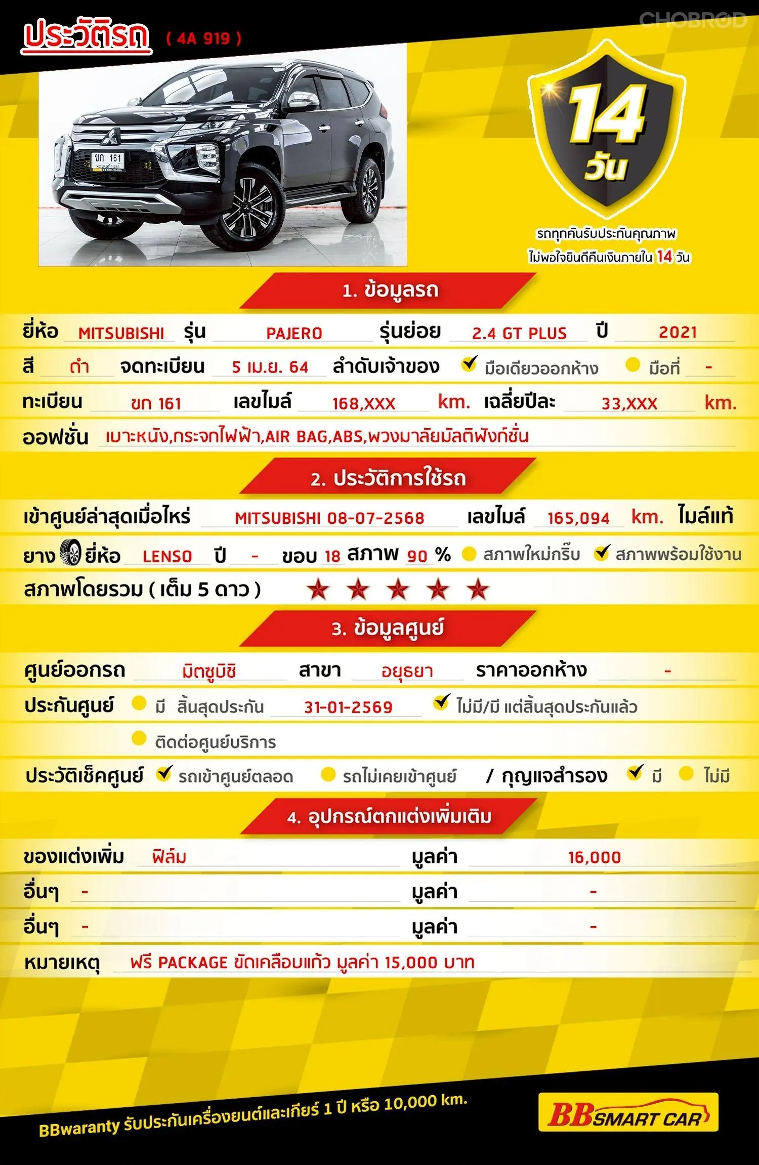 MITSUBISHI PAJERO 2.4 GT PLUS 2021 ออกรถ 0 บาท จัดได้ 779,000 บ. Line:@********แสดงข้อมูล 🔥จอง 199 บาท ส่งบัตรประชาชน รู้ผลพิจารณาภายใน 30 นาที ไม่ผ่านคืนเงินจองทุกกรณี 🔥ซื้อรถกับ BB พร้อมให้คำปรึกษา แก้ทุกปัญหา ให้ทุกเรื่อง บริการ call center 24 ชม. 🔥BB Care Plus รับประกันหลังการขาย สูงสุด 2 ปี หรือ 20,000 km.. 🔥มีรถให้เลือกมากกว่า 1,800 คัน บีบีสมาร์ทคาร์ 4 สาขากาญจนาภิเษก รหัสรถ 4A919 ราคา 759,000 บาท ผ่อนเพียง 12,874 บาท Brand. : MITSUBISHI Year. : 2021 Model. : PAJERO Grade. : 2.4 GT PLUS Engine. : 2400 CC Type. : ดีเซล Gearbox : A/T Color. : ดำ Mileage. : 168,XXX km. (ซื้อสด ราคานี้ยังไม่รวมค่าดำเนินการ 10,000 บ.) 🚩 Price. 759,000 บาท ยอดจัด : 769,000 บาท เงินดาวน์ : 0 บาท ประกันภัย : ฟรีประกันภัย 1 ปี ค่าดำเนินการ : 10,000 บาท รวมออกรถ : 0 บาท ผ่อน 36 งวด = 24,769 บาท ผ่อน 48 งวด = 19,056 บาท ผ่อน 60 งวด = 15,833 บาท ผ่อน 72 งวด = 14,164 บาท ผ่อน 84 งวด = 12,874 บาท **เงื่อนไขเป็นไปตามที่ไฟแนนซ์กำหนด โปรโมชั่นพิเศษ สำหรับลูกค้าเครดิตดีลือกรับเรทดอกเบี้ยพิเศษ 📍36 งวด = 1.29 % 📍48 งวด = 1.99 % 📍60 งวด = 2.39 % 📍72 งวด = 3.59 % 🔥 เงื่อนไข โปรโมชั่น ดอกเบี้ยเริ่มต้น 1.29% ตลอดอายุสัญญา - ยอดจัดไฟแนนซ์ 300,000-600,000 บาท - ผ่อนสูงสุด 72 เดือน - เป็นลูกค้าประวัติดี พนักงานประจำเงินเดือน 20,000 ขึ้นไป - ค่าดำเนินการแคมเปญ 20,000 บาท (รวมในยอดจัดได้) 🎗Car Hightlight รถสวยๆ วันนี้ขอแนะนำ MITSUBISHI PAJERO มั่นใจเรื่องความปลอดภัยในการขับขี่ เป็นรถที่มีความปลอดภัยและมีความแข็งแรงสูงมาก ฟังก์ชันการใช้งานต่างๆ ก็ให้มาแบบไม่ได้กั๊ก มีฟังก์ชันและออปชันต่างๆ ที่ตอบโจทย์การใช้งานจริง 🎗ภายใน พวงมาลัยเพาเวอร์ เซ็นทรัลล๊อก เบรกมือไฟฟ้า จอ LCD เล่น DVD เบาะหนัง เบรค ABS พวงมาลัย Multifunction วิทยุ - CD แอร์ AUTO แอร์ Airbag กุญแจรีโมท-สัญญานกันขโมย กระจกไฟฟ้า เบาะกึ่งหนัง 🎗ภายนอก กระจกมองข้างปรับไฟฟ้า กระจกข้างโครเมี่ยม บันไดข้าง เซนเซอร์รอบคัน กระจกมองข้างพับไฟฟ้า คิ้วกันสาด ไฟตัดหมอก กล้องส่องหลัง ไฟเลี้ยวกระจกมองข้าง 🎗ความคุ้มค่า สำหรับคันนี้หากเปรียบเทียบราคากับคุณภาพ คันนี้ถือว่าคุ้มค่ามากค่ะ ผ่อนสบายๆก็มีรถขับได้ รถดีมีคุณภาพแบบนี้รีบตัดสินใจซื้อได้เลราคานี้มาไวไปไวนะคะ ⭐️การรับประกันหลังการขาย BB Care Plus สูงสุด 2 ปี หรือ 20,000 km. ด้วยช่างที่ผ่านการอบรมจากศูนย์ชั้นนำของประเทศ 🎉Special offer เฉพาะ บีบีสมาร์ทคาร์ ที่นี่ที่เดียว ⭐ดอกเบี้ยเริ่มต้น 1.29% มีไฟแนนซ์รองรับหลายที่ค่ะ ⭐ฟรี!! แพคเก็จ ขัดเคลือบแก้ว มูลค่า 15,000 บาท ทุกคัน ⭐อนุมัติไว 30 นาที นำเอกสารมาให้ครบรับรถกลับบ้านทันทีค่ะ ⭐BB Care Plus รับประกันหลังการขาย สูงสุด 2 ปี หรือ 20,000 km. ⭐มี 6 สาขา ในกรุงเทพและปริมณฑลใกล้บ้านท่าน ⭐รถทุกคันผ่านตรวจสอบ Inspection เรียบร้อยแล้วค่ะ ผ่าน 5 ดาวทุกคันค่ะ ⭐เซลล์ทุกท่านเป็นมืออาชีพพร้อมให้บริการทุกท่านแน่น