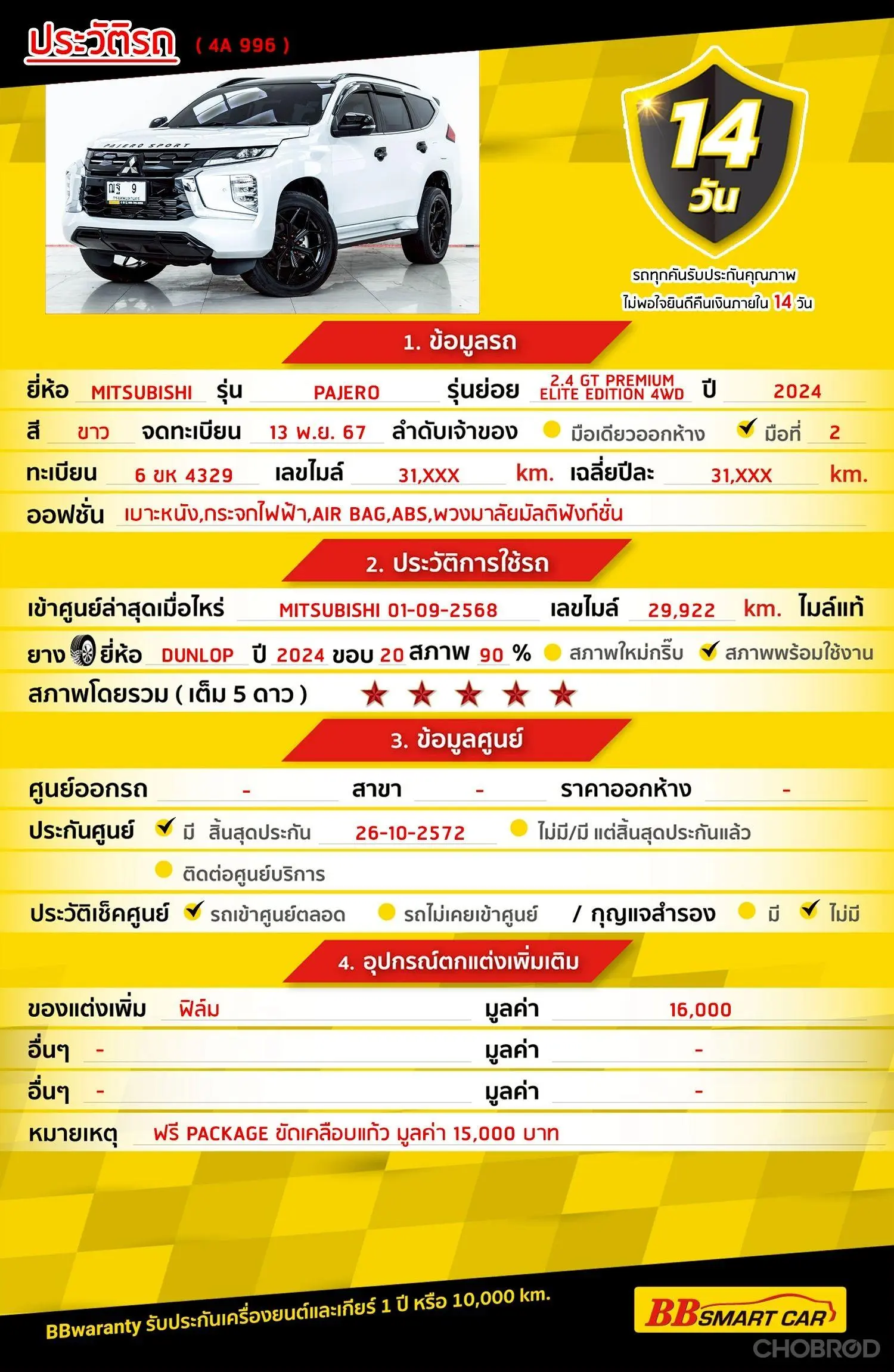 MITSUBISHI PAJERO 2.4 GT PREMIUM ELITE EDITION 4WD 2024 ออกรถ 0 บาท จัดได้ 1,249,000 บ. Line:@********แสดงข้อมูล 🔥จอง 199 บาท ส่งบัตรประชาชน รู้ผลพิจารณาภายใน 30 นาที ไม่ผ่านคืนเงินจองทุกกรณี 🔥ซื้อรถกับ BB พร้อมให้คำปรึกษา แก้ทุกปัญหา ให้ทุกเรื่อง บริการ call center 24 ชม. 🔥BB Care Plus รับประกันหลังการขาย สูงสุด 2 ปี หรือ 20,000 km.. 🔥มีรถให้เลือกมากกว่า 1,800 คัน สาขา4 ถนนกาญจนาภิเษกใกล้กับสมาคมปักษ์ใต้ รหัสรถ 4A996 ราคา 1,229,000 บาท ผ่อนเพียง 20,743 บาท Brand. : MITSUBISHI Year. : 2024 Model. : PAJERO Grade. : 2.4 GT PREMIUM ELITE EDITION 4WD Engine. : 2400 CC Type. : ดีเซล Gearbox : A/T Color. : ขาว Mileage. : 31,XXX km. (ซื้อสด ราคานี้ยังไม่รวมค่าดำเนินการ 10,000 บ.) 🚩 Price. 1,229,000 บาท ยอดจัด : 1,239,000 บาท เงินดาวน์ : 0 บาท ประกันภัย : ฟรีประกันภัย 1 ปี ค่าดำเนินการ : 10,000 บาท รวมออกรถ : 0 บาท ผ่อน 36 งวด = 39,908 บาท ผ่อน 48 งวด = 30,702 บาท ผ่อน 60 งวด = 25,509 บาท ผ่อน 72 งวด = 22,821 บาท ผ่อน 84 งวด = 20,743 บาท **เงื่อนไขเป็นไปตามที่ไฟแนนซ์กำหนด โปรโมชั่นพิเศษ สำหรับลูกค้าเครดิตดีลือกรับเรทดอกเบี้ยพิเศษ 📍36 งวด = 1.29 % 📍48 งวด = 1.99 % 📍60 งวด = 2.39 % 📍72 งวด = 3.59 % 🔥 เงื่อนไข โปรโมชั่น ดอกเบี้ยเริ่มต้น 1.29% ตลอดอายุสัญญา - ยอดจัดไฟแนนซ์ 300,000-600,000 บาท - ผ่อนสูงสุด 72 เดือน - เป็นลูกค้าประวัติดี พนักงานประจำเงินเดือน 20,000 ขึ้นไป - ค่าดำเนินการแคมเปญ 20,000 บาท (รวมในยอดจัดได้) 🎗Car Hightlight รถสวยๆ วันนี้ขอแนะนำ MITSUBISHI PAJERO มั่นใจเรื่องความปลอดภัยในการขับขี่ เป็นรถที่มีความปลอดภัยและมีความแข็งแรงสูงมาก ฟังก์ชันการใช้งานต่างๆ ก็ให้มาแบบไม่ได้กั๊ก มีฟังก์ชันและออปชันต่างๆ ที่ตอบโจทย์การใช้งานจริง 🎗ภายใน เซ็นทรัลล๊อก พวงมาลัยเพาเวอร์ Airbag เบาะกึ่งหนัง เบรค ABS กุญแจรีโมท-สัญญานกันขโมย วิทยุ - CD พวงมาลัย Multifunction เบาะไฟฟ้าคู่หน้า เบรกมือไฟฟ้า แอร์ กระจกไฟฟ้า แอร์ AUTO เบาะหนัง จอ LCD เล่น DVD เกียร์ Paddle Shift ไมล์ Digital 🎗ภายนอก กระจกมองข้างปรับไฟฟ้า ไฟโปรเจคเตอร์ คิ้วกันสาด ล้อแม็ก กระจกมองข้างพับไฟฟ้า เซนเซอร์รอบคัน บันไดข้าง ไฟตัดหมอก ไฟเลี้ยวกระจกมองข้าง 🎗ความคุ้มค่า สำหรับคันนี้หากเปรียบเทียบราคากับคุณภาพ คันนี้ถือว่าคุ้มค่ามากค่ะ ผ่อนสบายๆก็มีรถขับได้ รถดีมีคุณภาพแบบนี้รีบตัดสินใจซื้อได้เลราคานี้มาไวไปไวนะคะ ⭐️การรับประกันหลังการขาย BB Care Plus สูงสุด 2 ปี หรือ 20,000 km. ด้วยช่างที่ผ่านการอบรมจากศูนย์ชั้นนำของประเทศ 🎉Special offer เฉพาะ บีบีสมาร์ทคาร์ ที่นี่ที่เดียว ⭐ดอกเบี้ยเริ่มต้น 1.29% มีไฟแนนซ์รองรับหลายที่ค่ะ ⭐ฟรี!! แพคเก็จ ขัดเคลือบแก้ว มูลค่า 15,000 บาท ทุกคัน ⭐อนุมัติไว 30 นาที นำเอกสารมาให้ครบรับรถกลับบ้านทันทีค่ะ ⭐BB Care Plus รับประกันหลังการขาย สูงสุด 2 ปี หรือ 20,000 km. ⭐มี 6 สาขา ในกรุงเทพและปริมณฑลใกล้บ้านท่าน ⭐รถทุกคันผ่านตรวจสอบ Inspection เรียบร้อยแล้วค่ะ ผ่าน 5 ดาวทุกคันค่ะ ⭐