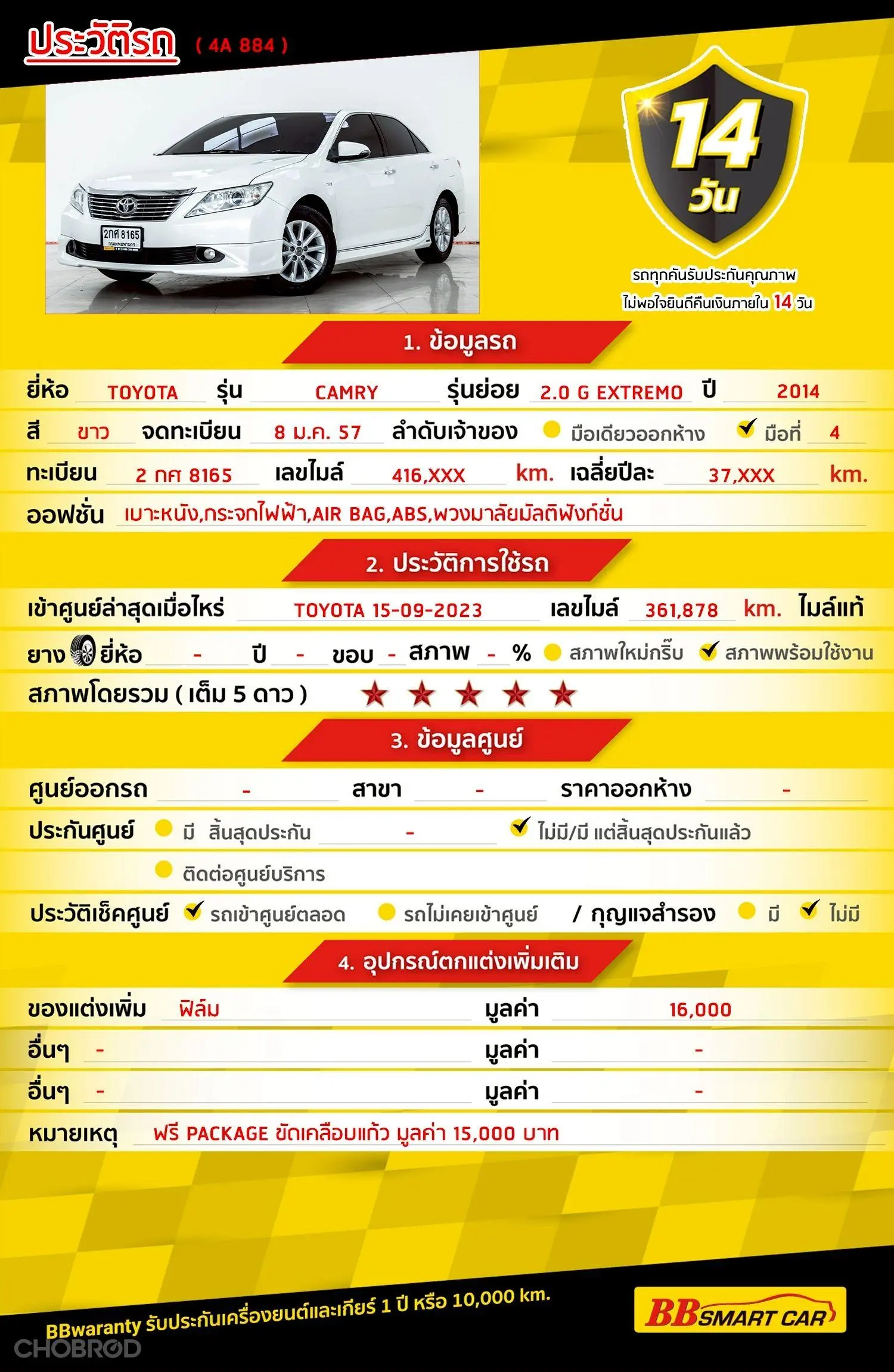 TOYOTA CAMRY 2.0 G EXTREMO 2014 ออกรถ 0 บาท จัดได้ 344,000 บ. Line:@********แสดงข้อมูล 🔥จอง 199 บาท ส่งบัตรประชาชน รู้ผลพิจารณาภายใน 30 นาที ไม่ผ่านคืนเงินจองทุกกรณี 🔥ซื้อรถกับ BB พร้อมให้คำปรึกษา แก้ทุกปัญหา ให้ทุกเรื่อง บริการ call center 24 ชม. 🔥BB Care Plus รับประกันหลังการขาย สูงสุด 2 ปี หรือ 20,000 km.. 🔥มีรถให้เลือกมากกว่า 1,800 คัน บีบีสมาร์ทคาร์ 4 สาขากาญจนาภิเษก รหัสรถ 4A884 ราคา 324,000 บาท ผ่อนเพียง 6,099 บาท Brand. : TOYOTA Year. : 2014 Model. : CAMRY Grade. : 2.0 G EXTREMO Engine. : 2000 CC Type. : เบนซิน Gearbox : AT Color. : ขาว Mileage. : 416,XXX km. (ซื้อสด ราคานี้ยังไม่รวมค่าดำเนินการ 10,000 บ.) 🚩 Price. 324,000 บาท ยอดจัด : 334,000 บาท เงินดาวน์ : 0 บาท ประกันภัย : ฟรีประกันภัย 1 ปี ค่าดำเนินการ : 10,000 บาท รวมออกรถ : 0 บาท ผ่อน 36 งวด = 11,252 บาท ผ่อน 48 งวด = 8,732 บาท ผ่อน 60 งวด = 7,281 บาท ผ่อน 72 งวด = 6,546 บาท ผ่อน 84 งวด = 6,099 บาท ***เงื่อนไขเป็นไปตามที่ไฟแนนซ์กำหนด โปรโมชั่นพิเศษ สำหรับลูกค้าเครดิตดี เลือกรับเรทดอกเบี้ยพิเศษ 📍36 งวด = 1.29 % 📍48 งวด = 1.99 % 📍60 งวด = 2.39 % 📍72 งวด = 3.59 % 🔥 เงื่อนไข โปรโมชั่น ดอกเบี้ยเริ่มต้น 1.29% ตลอดอายุสัญญา - ยอดจัดไฟแนนซ์ 300,000-600,000 บาท - ผ่อนสูงสุด 72 เดือน - เป็นลูกค้าประวัติดี พนักงานประจำเงินเดือน 20,000 ขึ้นไป - ค่าดำเนินการแคมเปญ 20,000 บาท (รวมในยอดจัดได้) 🎗Car Hightlight รถสวยๆ วันนี้ขอแนะนำ TOYOTA CAMRY 2.0 G EXTREMO AT เบนซิน 2014 มาพร้อมโฉมลักษณ์ที่ดูงดงามมากยิ่งขึ้น โดยมุ่งเน้นในความหรูเลิศมากยิ่งขึ้นกว่าเดิมอีกขั้นจากการออกแบบที่ปรับโฉมให้สามารถตอบสนองความต้องการของลูกค้า สะกดทุกสายตา กับสเกิร์ตสไตล์สปอร์ตหรูรอบคัน สปอยเลอร์หลัง ดีไซน์ใหม่ 🎗ภายใน • ห้องโดยสารโทน สีเบจ/ครีม ให้ความหรูหรา เรียบหรู สว่างตา • เบาะหนังสีเบจ ปรับไฟฟ้าฝั่งคนขับ • แผงประตู และแดชบอร์ดโทนเบจตัดลายไม้/โครเมียม • พวงมาลัยมัลติฟังก์ชัน หุ้มหนัง • ระบบแอร์แยกซ้าย-ขวา + ช่องแอร์หลัง 🎗ภายนอก • ชุดแต่งรอบคัน: สเกิร์ตหน้า-ข้าง-หลัง + สปอยเลอร์ท้าย • กระจังหน้าแบบโครเมียม ดีไซน์สปอร์ต • ไฟหน้าโปรเจกเตอร์ HID + Daytime Running Light (บางคันติดเพิ่ม) • ไฟท้ายรมดำ + กันชนท้ายดีไซน์เฉพาะ Extremo • ล้ออัลลอยลายพิเศษ (16-17 นิ้ว แล้วแต่ปีล็อต) 🎗ความคุ้มค่า สำหรับคันนี้หากเปรียบเทียบราคากับคุณภาพ คันนี้ถือว่าคุ้มค่ามากค่ะ ผ่อนสบายๆก็มีรถขับได้ รถดีมีคุณภาพแบบนี้รีบตัดสินใจซื้อได้เลราคานี้มาไวไปไวนะคะ ⭐️การรับประกันหลังการขาย BB Care Plus สูงสุด 2 ปี หรือ 20,000 km. ด้วยช่างที่ผ่านการอบรมจากศูนย์ชั้นนำของประเทศ 🎉Special offer เฉพาะ บีบีสมาร์ทคาร์ ที่นี่ที่เดียว ⭐ดอกเบี้ยเริ่มต้น 1.29% มีไฟแนนซ์รองรับหลายที่ค่ะ ⭐ฟรี!! แพคเก็จ ขัดเคลือบแก้ว มูลค่า 15,000 บาท ทุกคัน ⭐อนุมัติไว 30 นาที นำเอกสารมาให้ครบรับรถกลับบ้านทันทีค่ะ ⭐BB Care Plus รับประกันหลังก