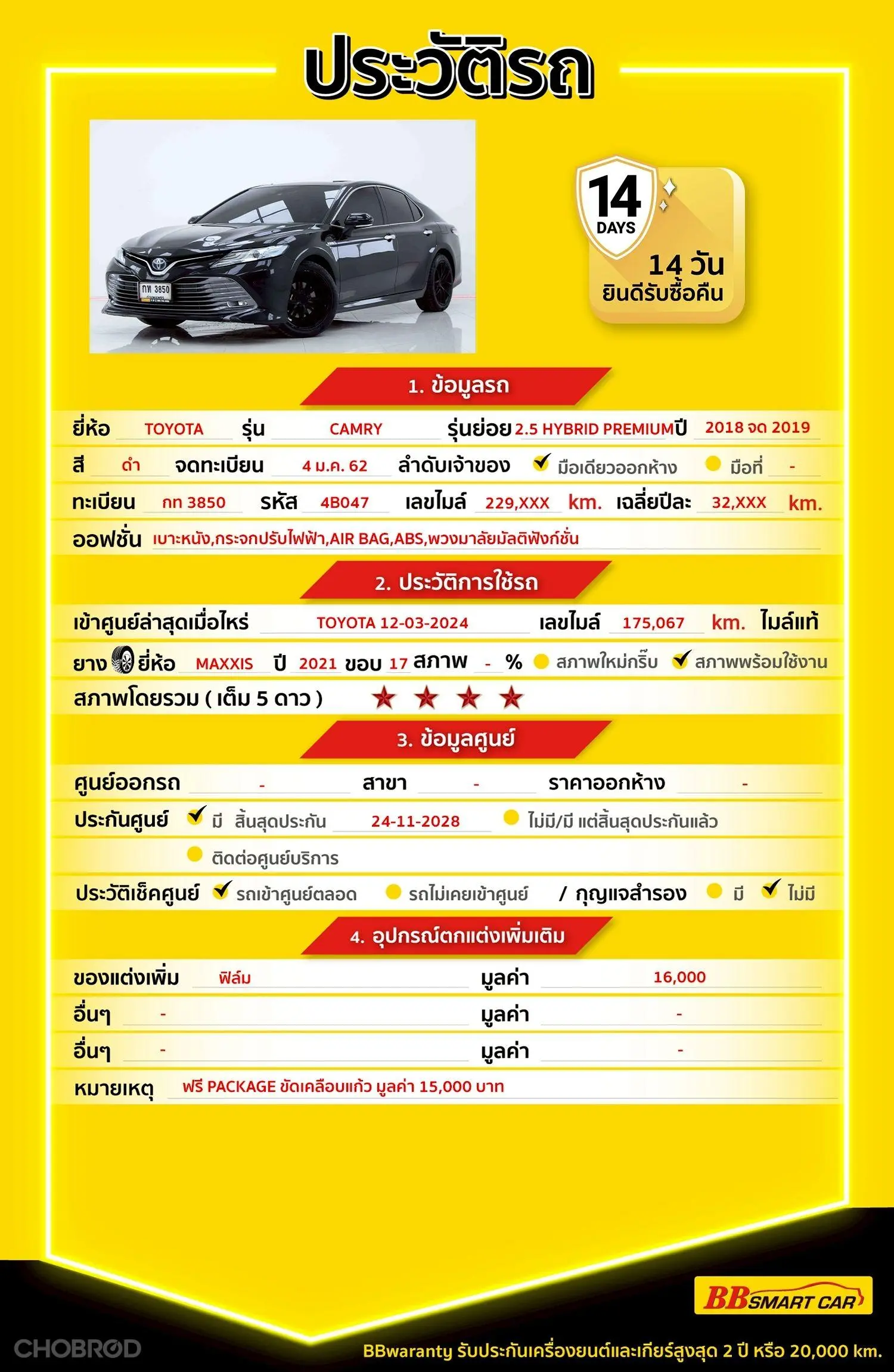 TOYOTA CAMRY 2.5 HV PREMIUM 2019 ออกรถ 0 บาท จัดได้ 749,000 บ. Line:@********แสดงข้อมูล 🔥จอง 199 บาท ส่งบัตรประชาชน รู้ผลพิจารณาภายใน 30 นาที ไม่ผ่านคืนเงินจองทุกกรณี 🔥ซื้อรถกับ BB พร้อมให้คำปรึกษา แก้ทุกปัญหา ให้ทุกเรื่อง บริการ call center 24 ชม. 🔥BB Care Plus รับประกันหลังการขาย สูงสุด 2 ปี หรือ 20,000 km.. 🔥มีรถให้เลือกมากกว่า 1,800 คัน สาขา4 ถนนกาญจนาภิเษกใกล้กับสมาคมปักษ์ใต้ รหัสรถ 4B047 ราคา 729,000 บาท ผ่อนเพียง 12,372 บาท Brand. : TOYOTA Year. : 2019 Model. : CAMRY Grade. : 2.5 HV PREMIUM Engine. : 2500 CC Type. : เบนซิน+ไฟฟ้า Gearbox : AT Color. : ดำ Mileage. : 229,XXX km. (ซื้อสด ราคานี้ยังไม่รวมค่าดำเนินการ 10,000 บ.) 🚩 Price. 729,000 บาท ยอดจัด : 739,000 บาท เงินดาวน์ : 0 บาท ประกันภัย : ฟรีประกันภัย 1 ปี ค่าดำเนินการ : 10,000 บาท รวมออกรถ : 0 บาท ผ่อน 36 งวด = 23,803 บาท ผ่อน 48 งวด = 18,312 บาท ผ่อน 60 งวด = 15,215 บาท ผ่อน 72 งวด = 13,611 บาท ผ่อน 84 งวด = 12,372 บาท ***เงื่อนไขเป็นไปตามที่ไฟแนนซ์กำหนด โปรโมชั่นพิเศษ สำหรับลูกค้าเครดิตดี เลือกรับเรทดอกเบี้ยพิเศษ 📍36 งวด = 1.29 % 📍48 งวด = 1.99 % 📍60 งวด = 2.39 % 📍72 งวด = 3.59 % 🔥 เงื่อนไข โปรโมชั่น ดอกเบี้ยเริ่มต้น 1.29% ตลอดอายุสัญญา - ยอดจัดไฟแนนซ์ 300,000-600,000 บาท - ผ่อนสูงสุด 72 เดือน - เป็นลูกค้าประวัติดี พนักงานประจำเงินเดือน 20,000 ขึ้นไป - ค่าดำเนินการแคมเปญ 20,000 บาท (รวมในยอดจัดได้) 🎗Car Hightlight รถสวยๆ วันนี้ขอแนะนำ TOYOTA CAMRY 2.5 HV PREMIUM AT เบนซิน 2019 มาพร้อมโฉมลักษณ์ที่ดูงดงามมากยิ่งขึ้น โดยมุ่งเน้นในความหรูเลิศมากยิ่งขึ้นกว่าเดิมอีกขั้นจากการออกแบบที่ปรับโฉมให้สามารถตอบสนองความต้องการของลูกค้า สะกดทุกสายตา กับสเกิร์ตสไตล์สปอร์ตหรูรอบคัน สปอยเลอร์หลัง ดีไซน์ใหม่ 🎗ภายใน จอ LCD เล่น DVD ภายในลายไม้ ม่านหลังไฟฟ้า Airbag เบาะกึ่งหนัง เซ็นทรัลล๊อก วิทยุ - CD หลังคาแก้ว กระจกไฟฟ้า แอร์ เบาะหนัง เบาะไฟฟ้าคู่หน้า พวงมาลัย Multifunction ซันรูฟ เบรค ABS เบรกมือไฟฟ้า กุญแจรีโมท-สัญญานกันขโมย แอร์ AUTO พวงมาลัยเพาเวอร์ 🎗ภายนอก กระจกมองข้างปรับไฟฟ้า ไฟตัดหมอก เซนเซอร์รอบคัน ล้อแม็ก กล้องส่องหลัง ไฟโปรเจคเตอร์ ไฟเลี้ยวกระจกมองข้าง กระจกมองข้างพับไฟฟ้า ไม่มีชนหนักแน่นอนค่ะ 🎗ความคุ้มค่า สำหรับคันนี้หากเปรียบเทียบราคากับคุณภาพ คันนี้ถือว่าคุ้มค่ามากค่ะ ผ่อนสบายๆก็มีรถขับได้ รถดีมีคุณภาพแบบนี้รีบตัดสินใจซื้อได้เลราคานี้มาไวไปไวนะคะ ⭐️การรับประกันหลังการขาย BB Care Plus สูงสุด 2 ปี หรือ 20,000 km. ด้วยช่างที่ผ่านการอบรมจากศูนย์ชั้นนำของประเทศ 🎉Special offer เฉพาะ บีบีสมาร์ทคาร์ ที่นี่ที่เดียว ⭐ดอกเบี้ยเริ่มต้น 1.29% มีไฟแนนซ์รองรับหลายที่ค่ะ ⭐ฟรี!! แพคเก็จ ขัดเคลือบแก้ว มูลค่า 15,000 บาท ทุกคัน ⭐อนุมัติไว 30 นาที นำเอกสารมาให้ครบรับรถกลับบ้านทันทีค่ะ ⭐BB Care Plus รับประกันหลังการขาย สูงสุด 2 ปี หรือ 20,000 km. ⭐มี 6 สาขา ในกรุงเทพ