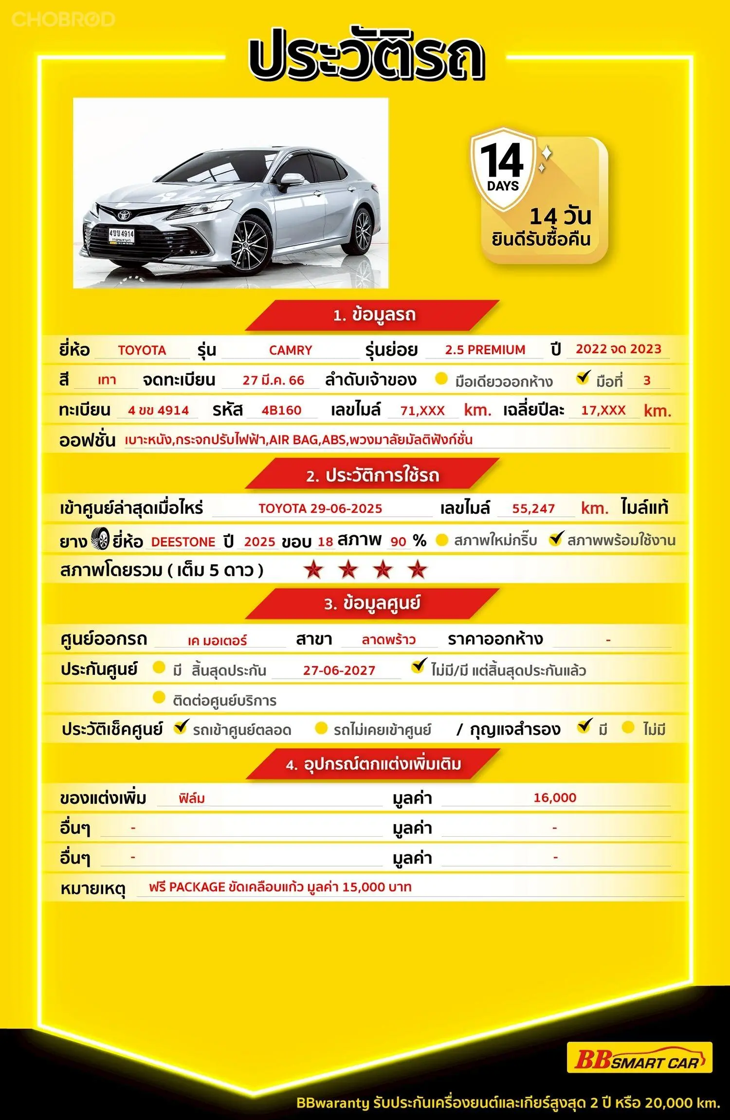 TOYOTA CAMRY 2.5 PREMIUM 2023 ออกรถ 0 บาท จัดได้ 999,000 บ. Line:@698epmtg 🔥มีรถให้เลือกมากกว่า 1,800 คัน 🔥รถทุกคันผ่านตรวจสอบ Inspection เรียบแล้วค่ะ ผ่าน 5 ดาวทุกคันค่ะ 🔥ซื้อรถกับ BB พร้อมให้คำปรึกษา แก้ทุกปัญหา ให้ทุกเรื่อง บริการ call center 24 ชม. 🔥BB Care Plus รับประกันหลังการขาย สูงสุด 2 ปี หรือ 20,000 km. 🔥ฟรี!! แพคเก็จ ขัดเคลือบแก้ว มูลค่า 15,000 บาท ทุกคัน 🔥มี 6 สาขา ในกรุงเทพและปริมณฑลใกล้บ้านท่าน สาขา 4 ถนนกาญจนาภิเษกใกล้กับสมาคมปักษ์ใต้ รหัสรถ 4B160 ราคา 979,000 บาท ผ่อนเพียง 16,557 บาท Brand. : TOYOTA Year. : 2023 Model. : CAMRY Grade. : 2.5 PREMIUM Engine. : 2500 CC Type. : เบนซิน Gearbox : AT Color. : เทา Mileage. : 71,XXX km. (ซื้อสด ราคานี้ยังไม่รวมค่าดำเนินการ 10,000 บ.) 🚩 Price. 979,000 บาท ยอดจัด : 989,000 บาท เงินดาวน์ : 0 บาท ประกันภัย : ฟรีประกันภัย 1 ปี ค่าดำเนินการ : 10,000 บาท รวมออกรถ : 0 บาท ผ่อน 36 งวด = 31,856 บาท ผ่อน 48 งวด = 24,507 บาท ผ่อน 60 งวด = 20,362 บาท ผ่อน 72 งวด = 18,217 บาท ผ่อน 84 งวด = 16,557 บาท ***เงื่อนไขเป็นไปตามที่ไฟแนนซ์กำหนด โปรโมชั่นพิเศษ สำหรับลูกค้าเครดิตดี เลือกรับเรทดอกเบี้ยพิเศษ 📍36 งวด = 1.29 % 📍48 งวด = 1.99 % 📍60 งวด = 2.39 % 📍72 งวด = 3.59 % 🔥 เงื่อนไข โปรโมชั่น ดอกเบี้ยเริ่มต้น 1.29% ตลอดอายุสัญญา - ยอดจัดไฟแนนซ์ 300,000-600,000 บาท - ผ่อนสูงสุด 72 เดือน - เป็นลูกค้าประวัติดี พนักงานประจำเงินเดือน 20,000 ขึ้นไป - ค่าดำเนินการแคมเปญ 20,000 บาท (รวมในยอดจัดได้) 🎗Car Hightlight รถสวยๆ วันนี้ขอแนะนำ TOYOTA CAMRY 2.5 PREMIUM AT 2023 - เครื่องแรงสะใจ: เครื่องยนต์ 2.5L 209 แรงม้า + เกียร์ 8 สปีด ขับสนุก เร่งแซงมั่นใจที่สุดในกลุ่มรถสันดาป - ช่วงล่าง TNGA: เกาะถนนดีเยี่ยม นุ่มนวลแต่ไม่ยวบยาบ จุดศูนย์ถ่วงต่ำ ขับขี่มั่นคง - ออปชั่นจัดเต็ม: มีเบาะเป่าลม (Seat Ventilator) กันร้อน, หลังคา Sunroof และเบาะไฟฟ้าพร้อม Memory Seat - ความปลอดภัยอัจฉริยะ: ระบบ TSS 2.5+ รุ่นล่าสุด (เบรกอัตโนมัติ, คุมความเร็วแปรผันทุกย่านความเร็ว) - ดูแลรักษาง่าย: เครื่องเบนซินล้วน ไม่ต้องกังวลเรื่องแบตเตอรี่ไฮบริดในระยะยาว ทนทาน ราคาขายต่อดี 🎗ภายใน เซ็นทรัลล๊อก วิทยุ - CD แอร์ AUTO เบรกมือไฟฟ้า หลังคาแก้ว เบาะกึ่งหนัง พวงมาลัย Multifunction Airbag ซันรูฟ เบาะหนัง ภายในลายไม้ เบรค ABS กุญแจรีโมท-สัญญานกันขโมย แอร์ จอ LCD เล่น DVD เบาะไฟฟ้าคู่หน้า กระจกไฟฟ้า พวงมาลัยเพาเวอร์ 🎗ภายนอก กระจกมองข้างปรับไฟฟ้า คิ้วกันสาด ไฟตัดหมอก กล้องส่องหลัง ไฟเลี้ยวกระจกมองข้าง ไฟโปรเจคเตอร์ เซนเซอร์รอบคัน กระจกมองข้างพับไฟฟ้า 🎗ความคุ้มค่า สำหรับคันนี้หากเปรียบเทียบราคากับคุณภาพ คันนี้ถือว่าคุ้มค่ามากค่ะ ผ่อนสบายๆก็มีรถขับได้ รถดีมีคุณภาพแบบนี้รีบตัดสินใจซื้อได้เลราคานี้มาไวไปไวนะคะ