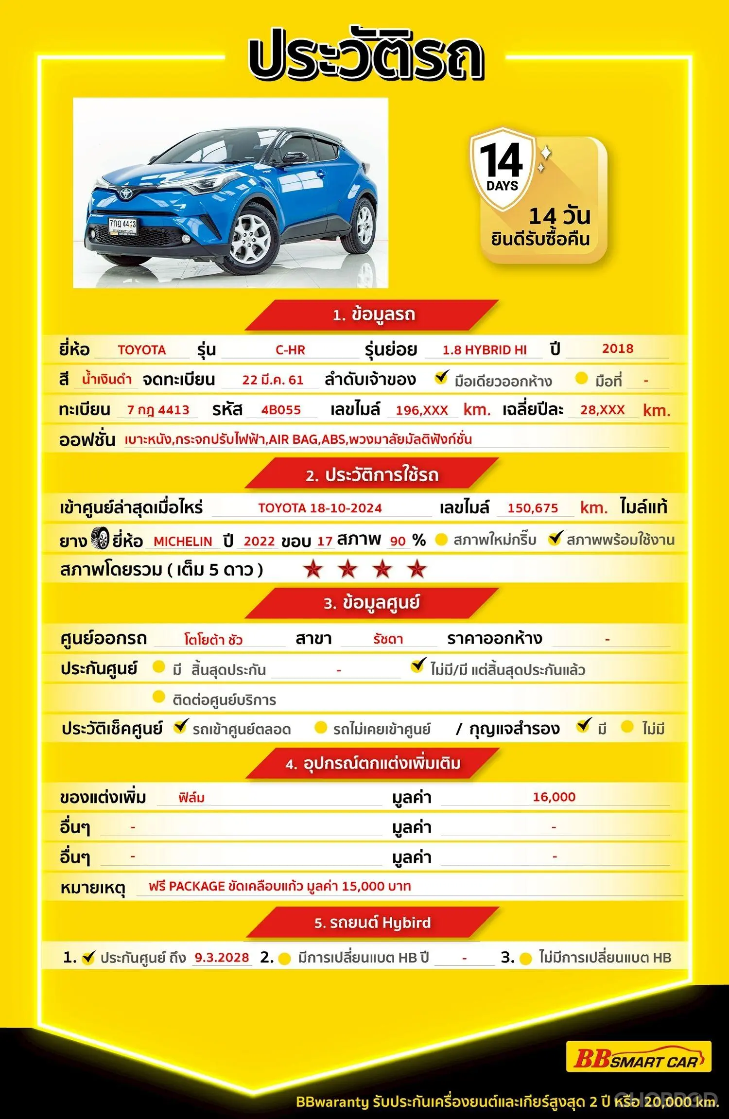 มีการรับประกันจากดีลเลอร์ (6 เดือน) มีบริการช่วยเหลือฉุกเฉินบนท้องถนน 24 ชม. จากดีลเลอร์