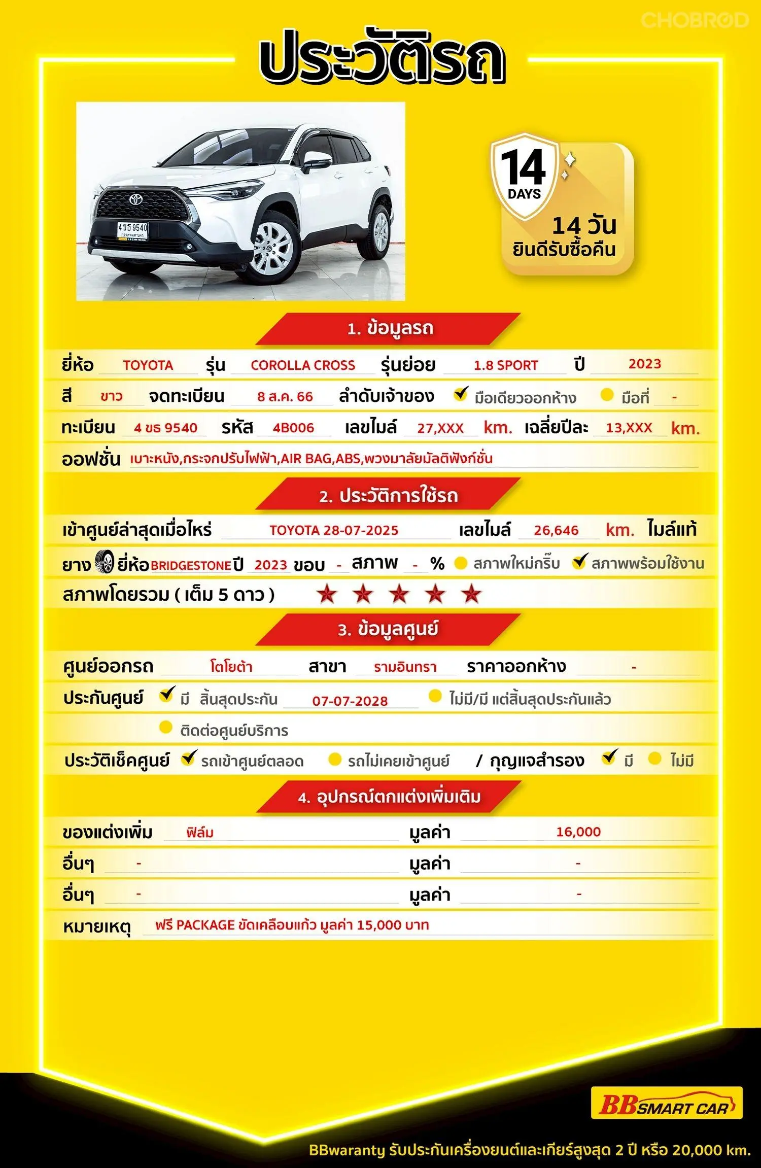 TOYOTA CROSS 1.8 SPORT 2023 ออกรถ 0 บาท จัดได้ 729,000 บ. Line:@********แสดงข้อมูล 🔥จอง 199 บาท ส่งบัตรประชาชน รู้ผลพิจารณาภายใน 30 นาที ไม่ผ่านคืนเงินจองทุกกรณี 🔥ซื้อรถกับ BB พร้อมให้คำปรึกษา แก้ทุกปัญหา ให้ทุกเรื่อง บริการ call center 24 ชม. 🔥BB Care Plus รับประกันหลังการขาย สูงสุด 2 ปี หรือ 20,000 km.. 🔥มีรถให้เลือกมากกว่า 1,800 คัน สาขา4 ถนนกาญจนาภิเษกใกล้กับสมาคมปักษ์ใต้ รหัสรถ 4B006 ราคา 709,000 บ. ผ่อนเพียง 12,038 บาท Brand. : TOYOTA Year. : 2023 Model. : COROLLA CROSS Grade : 1.8 SPORT Engine. : 1800 Type. : เบนซิน Gearbox. : A/T Color. : ขาว Mileage. : 27,XXX km. (ซื้อสด ราคานี้ยังไม่รวมค่าดำเนินการ 10,000 บ.) 🚩 Price. 709,000 บาท ยอดจัด : 719,000 บาท ประกันภัย : ฟรีประกันภัย 1 ปี ค่าดำเนินการ : 10,000 บาท รวมออกรถ 0 บาท ผ่อน 36 = 23,159 บาท ผ่อน 48 = 17,817 บาท ผ่อน 60 = 14,803 บาท ผ่อน 72 = 13,243 บาท ผ่อน 84 = 12,038 บาท เงื่อนไขเป็นไปตามที่ไฟแนนซ์กำหนด** โปรโมชั่นพิเศษ สำหรับลกค้าเครดิตดี 🚩เลือกรับเรทดอกเบี้ยพิเศษ 📍36 งวด = 1.29 % 📍48 งวด = 1.99 % 📍60 งวด = 2.39 % 📍72 งวด = 3.59 % 🔥 เงื่อนไข โปรโมชั่น ดอกเบี้ยเริ่มต้น 1.29% ตลอดอายุสัญญา - ยอดจัดไฟแนนซ์ 300,000-600,0000 บาท - ผ่อนสูงสุด 72 เดือน - เป็นลูกค้าประวัติดี พนักงานประจำเงินเดือน 20,000 ขึ้นไป - ค่าดำเนินการแคมเปญ 20,000 บาท (รวมในยอดจัดได้) 🎗Car Hightlight TOYOTA COROLLA CROSS 1.8 SPORT AT 2023 ขนาดตัวที่กะทัดรัด แต่เปี่ยมความอเนกประสงค์แบบเอสยูวี แถมยังมีราคาที่น่าจับต้อง เหมาะสำหรับครอบครัวที่กำลังมองหา "ตัวจบ" จะใช้งานคนเดียวก็ไม่เทอะทะ จะใช้เป็นรถครอบครัวช่วงวันหยุดก็ตอบโจทย์ได้ดี 🎗ภายใน เซ็นทรัลล๊อก พวงมาลัยเพาเวอร์ Airbag แอร์ AUTO วิทยุ - CD จอ LCD เล่น DVD เบรค ABS แอร์ กระจกไฟฟ้า กุญแจรีโมท-สัญญานกันขโมย เบาะหนัง พวงมาลัย Multifunction เบาะกึ่งหนัง 🎗ภายนอก กระจกมองข้างปรับไฟฟ้า ไฟเลี้ยวกระจกมองข้าง เซนเซอร์รอบคัน กระจกมองข้างพับไฟฟ้า ไฟโปรเจคเตอร์ กล้องส่องหลัง ไฟตัดหมอก คิ้วกันสาด 🎗ความคุ้มค่า สำหรับรถคันนี้แล้วคุณภาพที่ลูกค้าได้รับ ถือว่ามาแบบเต็มสุดๆทั้งระบบรักษาความปลอดภัยและเทคโนโลยีต่างๆที่มากับตัวรถนับว่าคุ้มสุดๆ กำลังเครื่องดี ไม่ว่าจะทางเรียบหรือขรุขระทนรทานกับทุกพื้นผิวถนน ดูแลง่าย ในราคาที่แสนสบายกระเป๋าด้วยจ้า ⭐️การรับประกันหลังการขาย BB Care Plus สูงสุด 2 ปี หรือ 20,000 km. ด้วยช่างที่ผ่านการอบรมจากศูนย์ชั้นนำของประเทศ 🎉Special offer เฉพาะ บีบีสมาร์ทคาร์ ที่นี่ที่เดียว ⭐ดอกเบี้ยเริ่มต้น 1.29% มีไฟแนนซ์รองรับหลายที่ค่ะ ⭐ฟรี!! แพคเก็จ ขัดเคลือบแก้ว มูลค่า 15,000 บาท ทุกคัน ⭐อนุมัติไว 30 นาที นำเอกสารมาให้ครบรับรถกลับบ้านทันทีค่ะ ⭐BB Care Plus รับประกันหลังการขาย สูงสุด 2 ปี หรือ 20,000 km. ⭐มี 6 สาขา ในกรุงเทพและปริมณฑลใกล้บ้านท่าน ⭐รถทุกคันผ่านตรวจสอบ Inspection เรียบแล้วค่ะ ผ่าน 5 ดาวทุกคันค่ะ ⭐เซลล์ทุกท่านเ