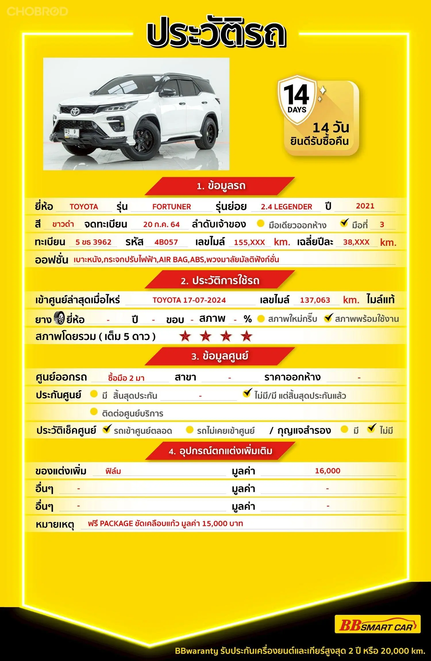 TOYOTA FORTUNER 2.4 LEGENDER 2021 ออกรถ 0 บาท จัดได้ 1,059,000 บ. Line:@698epmtg 🔥จอง 199 บาท ส่งบัตรประชาชน รู้ผลพิจารณาภายใน 30 นาที ไม่ผ่านคืนเงินจองทุกกรณี 🔥ซื้อรถกับ BB พร้อมให้คำปรึกษา แก้ทุกปัญหา ให้ทุกเรื่อง บริการ call center 24 ชม. 🔥BB Care Plus รับประกันหลังการขาย สูงสุด 2 ปี หรือ 20,000 km.. 🔥มีรถให้เลือกมากกว่า 1,800 คัน สาขา4 ถนนกาญจนาภิเษกใกล้กับสมาคมปักษ์ใต้ รหัสรถ 4B057 ราคา 1,039,000 บาท ผ่อนเพียง 17,730 บาท Brand. : TOYOTA Year. : 2021 Model. : FORTUNER Grade. : 2.4 LEGENDER Engine. : 2400 CC Type. : ดีเซล Gearbox : AT Color. : ขาวทูโทน Mileage. : 156,XXX km. (ซื้อสด ราคานี้ยังไม่รวมค่าดำเนินการ 10,000 บ.) 🚩 Price. 1,039,000 บาท ยอดจัด : 1,049,000 บาท เงินดาวน์ : 0 บาท ประกันภัย : ฟรีประกันภัย 1 ปี ค่าดำเนินการ : 10,000 บาท รวมออกรถ : 0 บาท ผ่อน 36 งวด = 34,111 บาท ผ่อน 48 งวด = 26,242 บาท ผ่อน 60 งวด = 21,803 บาท ผ่อน 72 งวด = 19,506 บาท ผ่อน 84 งวด = 17,730 บาท เงื่อนไขเป็นไปตามที่ไฟแนนซ์กำหนด** โปรโมชั่นพิเศษ สำหรับลกค้าเครดิตดี 🚩เลือกรับเรทดอกเบี้ยพิเศษ 📍36 งวด = 1.29 % 📍48 งวด = 1.99 % 📍60 งวด = 2.39 % 📍72 งวด = 3.59 % 🔥 เงื่อนไข โปรโมชั่น ดอกเบี้ยเริ่มต้น 1.29% ตลอดอายุสัญญา - ยอดจัดไฟแนนซ์ 300,000-600,0000 บาท - ผ่อนสูงสุด 72 เดือน - เป็นลูกค้าประวัติดี พนักงานประจำเงินเดือน 20,000 ขึ้นไป - ค่าดำเนินการแคมเปญ 20,000 บาท (รวมในยอดจัดได้) 🎗Car Hightlight รถสวยๆ วันนี้ขอแนะนำ TOYOTA FORTUNER 2.4 LEGENDER AT 2021 เป็นรถ SUV อเนกประสงค์ที่ได้รับความนิยมอย่างสูงในตลาดเมืองไทย ด้วยความทนทาน สมรรถนะที่ไว้ใจได้ และห้องโดยสารที่กว้างขวาง ทำให้เป็นตัวเลือกที่น่าสนใจสำหรับผู้ที่มองหารถครอบครัว หรือรถที่ใช้งานได้หลากหลาย 🎗ภายใน จอ LCD เล่น DVD พวงมาลัยเพาเวอร์ เบาะหนัง เกียร์ Paddle Shift เบาะกึ่งหนัง เซ็นทรัลล๊อก ภายในลายไม้ กระจกไฟฟ้า แอร์ AUTO กุญแจรีโมท-สัญญานกันขโมย พวงมาลัย Multifunction วิทยุ - CD Airbag แอร์ เบาะไฟฟ้าคู่หน้า เบรค ABS 🎗ภายนอก มีดีไซน์แข็งแกร่ง บึกบึน กระจกมองข้างปรับไฟฟ้า สปอยเลอร์หลัง บันไดข้าง ไฟตัดหมอก เซนเซอร์รอบคัน กระจกมองข้างพับไฟฟ้า ไฟโปรเจคเตอร์ ล้อแม็ก ไฟเลี้ยวกระจกมองข้าง กล้องส่องหลัง คิ้วกันสาด ให้ความรู้สึกเป็น SUV ที่พร้อมลุยและทนทาน 🎗ความคุ้มค่า สำหรับรถคันนี้แล้วคุณภาพที่ลูกค้าได้รับ ถือว่ามาแบบเต็มสุดๆทั้งระบบรักษาความปลอดภัยและเทคโนโลยีต่างๆที่มากับตัวรถนับว่าคุ้มสุดๆ กำลังเครื่องดี ไม่ว่าจะทางเรียบหรือขรุขระทนรทานกับทุกพื้นผิวถนน ดูแลง่าย ในราคาที่แสนสบายกระเป๋าด้วยจ้า ⭐️การรับประกันหลังการขาย BB Care Plus สูงสุด 2 ปี หรือ 20,000 km. ด้วยช่างที่ผ่านการอบรมจากศูนย์ชั้นนำของประเทศ 🎉Special offer เฉพาะ บีบีสมาร์ทคาร์ ที่นี่ที่เดียว ⭐ดอกเบี้ยเริ่มต้น 1.29% มีไฟแนนซ์รองรับหลายที่ค่ะ ⭐ฟรี!! แพคเก็จ ขัดเคลือบแก้ว มูลค่า 15,000 บาท ทุกคัน ⭐อนุมัติไว 30 นา
