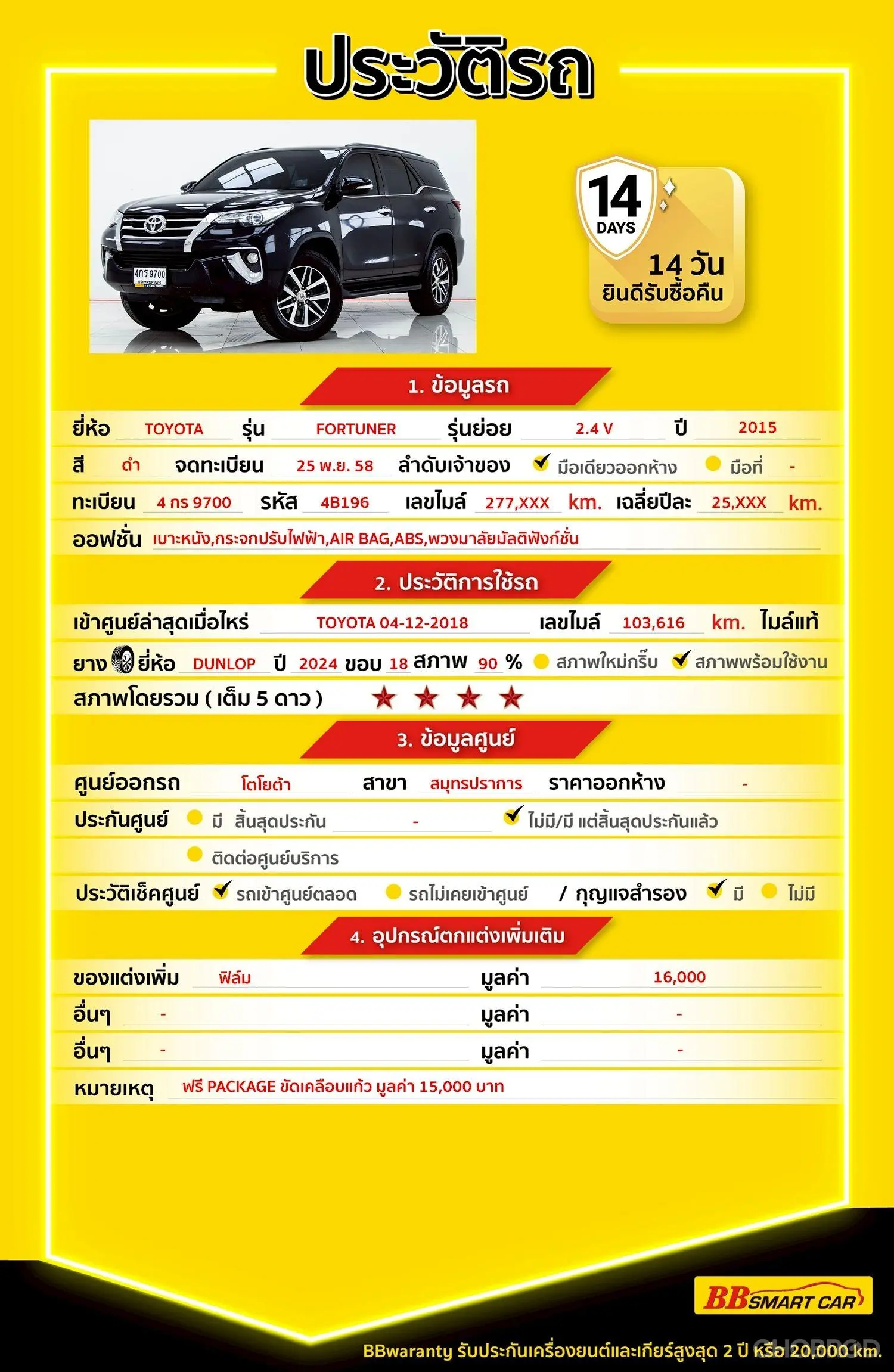 TOYOTA FORTUNER 2.4 V 2015 ออกรถ 0 บาท จัดได้ 669,000 บ. Line:@698epmtg 🔥มีรถให้เลือกมากกว่า 1,800 คัน 🔥รถทุกคันผ่านตรวจสอบ Inspection เรียบแล้วค่ะ ผ่าน 5 ดาวทุกคันค่ะ 🔥ซื้อรถกับ BB พร้อมให้คำปรึกษา แก้ทุกปัญหา ให้ทุกเรื่อง บริการ call center 24 ชม. 🔥BB Care Plus รับประกันหลังการขาย สูงสุด 2 ปี หรือ 20,000 km. 🔥ฟรี!! แพคเก็จ ขัดเคลือบแก้ว มูลค่า 15,000 บาท ทุกคัน 🔥มี 6 สาขา ในกรุงเทพและปริมณฑลใกล้บ้านท่าน สาขา 4 ถนนกาญจนาภิเษกใกล้กับสมาคมปักษ์ใต้ รหัสรถ 4B196 ราคา 649,000 บาท ผ่อนเพียง 11,856 บาท Brand. : TOYOTA Year. : 2015 Model. : FORTUNER Grade. : 2.4 V 2WD Engine. : 2400 CC Type. : ดีเซล Gearbox : AT Color. : ดำ Mileage. : 277,XXX km. (ซื้อสด ราคานี้ยังไม่รวมค่าดำเนินการ 10,000 บ.) 🚩 Price. 649,000 บาท ยอดจัด : 659,000 บาท เงินดาวน์ : 0 บาท ประกันภัย : ฟรีประกันภัย 1 ปี ค่าดำเนินการ : 10,000 บาท รวมออกรถ : 0 บาท ผ่อน 36 งวด = 21,873 บาท ผ่อน 48 งวด = 16,976 บาท ผ่อน 60 งวด = 14,155 บาท ผ่อน 72 งวด = 12,726 บาท ผ่อน 84 งวด = 11,856 บาท เงื่อนไขเป็นไปตามที่ไฟแนนซ์กำหนด** โปรโมชั่นพิเศษ สำหรับลกค้าเครดิตดี 🚩เลือกรับเรทดอกเบี้ยพิเศษ 📍36 งวด = 1.29 % 📍48 งวด = 1.99 % 📍60 งวด = 2.39 % 📍72 งวด = 3.59 % 🔥 เงื่อนไข โปรโมชั่น ดอกเบี้ยเริ่มต้น 1.29% ตลอดอายุสัญญา - ยอดจัดไฟแนนซ์ 300,000-600,0000 บาท - ผ่อนสูงสุด 72 เดือน - เป็นลูกค้าประวัติดี พนักงานประจำเงินเดือน 20,000 ขึ้นไป - ค่าดำเนินการแคมเปญ 20,000 บาท (รวมในยอดจัดได้) 🎗Car Hightlight รถสวยๆ วันนี้ขอแนะนำ TOYOTA FORTUNER 2.4 V 2WD AT 2015 จุดเด่นออปชั่น - ราชาแห่งรถมหาชน: เป็นโฉมใหม่ (New Fortuner) รุ่นแรกที่เปลี่ยนดีไซน์ให้หรูหรา ภูมิฐาน และราคาขายต่อแข็งแกร่งที่สุดในกลุ่ม PPV - เครื่องยนต์ GD Efficient Boost: 2.4 ลิตร 150 แรงม้า แรงบิด 400 นิวตันเมตร ประหยัดน้ำมันกว่าเดิมมากและดูแลรักษาง่าย ไม่จุกจิก - ฝาท้ายไฟฟ้า (Power Back Door): ออปชันเด่นในรุ่น V ที่ช่วยอำนวยความสะดวกในการเปิด-ปิดท้ายรถได้เพียงปลายนิ้ว - ความปลอดภัยครบครัน: มาพร้อมระบบควบคุมการทรงตัว (VSC), ระบบป้องกันล้อหมุนฟรี (TRC) และระบบช่วยออกตัวบนทางลาดชัน (HAC) - ความพรีเมียมภายใน: ห้องโดยสาร 7 ที่นั่งกว้างขวาง ตกแต่งด้วยหนังและวัสดุบุนุ่ม ให้ความรู้สึกหรูหราเหมือนรถเก๋งซีดาน 🎗ภายใน ภายในลายไม้ เบาะไฟฟ้าคู่หน้า กระจกไฟฟ้า เซ็นทรัลล๊อก พวงมาลัยเพาเวอร์ จอ LCD เล่น DVD แอร์ เบาะกึ่งหนัง เกียร์ Paddle Shift แอร์ AUTO พวงมาลัย Multifunction กุญแจรีโมท-สัญญานกันขโมย วิทยุ - CD Airbag เบรค ABS เบาะหนัง 🎗ภายนอก กระจกมองข้างปรับไฟฟ้า ไฟโปรเจคเตอร์ กล้องส่องหลัง บันไดข้าง ไฟเลี้ยวกระจกมองข้าง สปอยเลอร์หลัง กระจกมองข้างพับไฟฟ้า ไฟตัดหมอก เซนเซอร์รอบคัน 🎗ความคุ้มค่า สำหรับรถคันนี้แล้วคุณภาพที่ลูกค้าได้รับ ถือว่ามาแบบเต็มสุดๆทั้งระบบรักษาความปลอดภัยและเทคโนโลยีต่างๆที่มากับตัวรถนับว่าคุ้มสุดๆ กำลังเครื่องดี ไม่ว่าจะทางเรีย