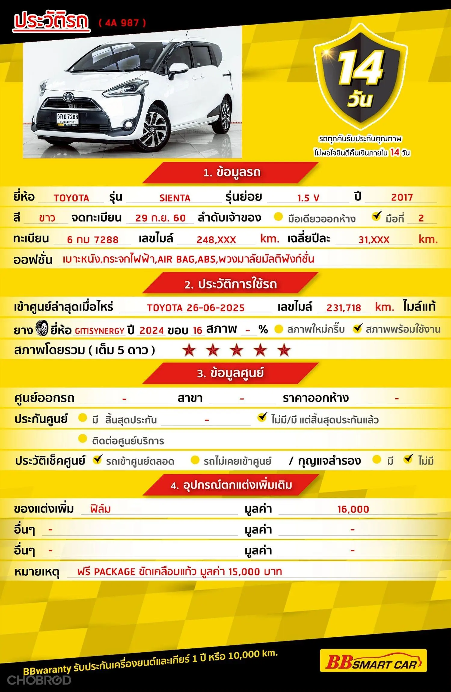 TOYOTA SIENTA 1.5 V 2017 ออกรถ 0 บาท จัดได้ 389,000 บ. Line:@********แสดงข้อมูล 🔥จอง 199 บาท ส่งบัตรประชาชน รู้ผลพิจารณาภายใน 30 นาที ไม่ผ่านคืนเงินจองทุกกรณี 🔥ซื้อรถกับ BB พร้อมให้คำปรึกษา แก้ทุกปัญหา ให้ทุกเรื่อง บริการ call center 24 ชม. 🔥BB Care Plus รับประกันหลังการขาย สูงสุด 2 ปี หรือ 20,000 km.. 🔥มีรถให้เลือกมากกว่า 1,800 คัน สาขา4 ถนนกาญจนาภิเษกใกล้กับสมาคมปักษ์ใต้ รหัสรถ 4A987 ราคา 369,000 บาท ผ่อนเพียง 6,345 บาท Brand. : TOYOTA Year. : 2017 Model. : SIENTA Grade. : 1.5 V Engine. : 1500 CC Type. : เบนซิน Gearbox : A/T Color. : ขาว Mileage. : 248,XXX km (ซื้อสด ราคานี้ยังไม่รวมค่าดำเนินการ 10,000 บ.) 🚩 Price. 369,000 บาท ยอดจัด : 379,000 บาท เงินดาวน์ : 0 บาท ประกันภัย : ฟรีประกันภัย 1 ปี ค่าดำเนินการ : 10,000 บาท รวมออกรถ : 0 บาท ผ่อน 36 งวด = 12,208 บาท ผ่อน 48 งวด = 9,391 บาท ผ่อน 60 งวด = 7,804 บาท ผ่อน 72 งวด = 6,981 บาท ผ่อน 84 งวด = 6,345 บาท **เงื่อนไขเป็นไปตามที่ไฟแนนซ์กำหนด โปรโมชั่นพิเศษ สำหรับลูกค้าเครดิตดี 🚩เลือกรับเรทดอกเบี้ยพิเศษ 📍36 งวด = 1.29 % 📍48 งวด = 1.99 % 📍60 งวด = 2.39 % 📍72 งวด = 3.59 % 🔥 เงื่อนไข โปรโมชั่น ดอกเบี้ยเริ่มต้น 1.29% ตลอดอายุสัญญา - ยอดจัดไฟแนนซ์ 300,000-600,0000 บาท - ผ่อนสูงสุด 72 เดือน - เป็นลูกค้าประวัติดี พนักงานประจำเงินเดือน 20,000 ขึ้นไป - ค่าดำเนินการแคมเปญ 20,000 บาท (รวมในยอดจัดได้) 🎗Car Hightlight TOYOTA SIENTA 1.5 V AT เบนซิน 2017 เป็นรถ MPV 7 ที่นั่งมือสองที่พร้อมใช้งานและโดดเด่นไม่เหมือนใคร ด้วยดีไซน์สปอร์ตจากล้อแม็กซ์สีขาวที่ติดตั้งมาเป็นพิเศษ ทำให้รถดูทันสมัยและมีสไตล์เฉพาะตัว คันนี้เป็นมากกว่ารถทั่วไป แต่เป็น "เพื่อนร่วมทางของครอบครัวที่พร้อมตอบโจทย์ทุกการเดินทาง ด้วยความสะดวกสบาย ประหยัด และดีไซน์ที่โดดเด่น" เหมาะสำหรับผู้ที่ต้องการรถยนต์ที่ครบครันสำหรับการใช้ชีวิตประจำวันและท่องเที่ยวพักผ่อนค่ะ 🎗ภายใน กระจกไฟฟ้า เบรค ABS เซ็นทรัลล๊อก พวงมาลัยเพาเวอร์ แอร์ กุญแจรีโมท-สัญญานกันขโมย พวงมาลัย Multifunction เบาะหนัง Airbag เบาะกึ่งหนัง แอร์ AUTO จอ LCD เล่น DVD วิทยุ - CD 🎗ภายนอก กระจกมองข้างปรับไฟฟ้า ไฟเลี้ยวกระจกมองข้าง คิ้วกันสาด กระจกมองข้างพับไฟฟ้า ไฟตัดหมอก เซนเซอร์รอบคัน กล้องส่องหลัง 🎗ความคุ้มค่า สำหรับคันนี้หากเปรียบเทียบราคากับคุณภาพ คันนี้ถือว่าคุ้มค่ามากค่ะ ผ่อนสบายๆก็มีรถขับได้ รถดีมีคุณภาพแบบนี้รีบตัดสินใจซื้อได้เลราคานี้มาไวไปไวนะคะ ⭐️การรับประกันหลังการขาย BB Care Plus สูงสุด 2 ปี หรือ 20,000 km. ด้วยช่างที่ผ่านการอบรมจากศูนย์ชั้นนำของประเทศ 🎉Special offer เฉพาะ บีบีสมาร์ทคาร์ ที่นี่ที่เดียว ⭐ดอกเบี้ยเริ่มต้น 1.29% มีไฟแนนซ์รองรับหลายที่ค่ะ ⭐ฟรี!! แพคเก็จ ขัดเคลือบแก้ว มูลค่า 15,000 บาท ทุกคัน ⭐อนุมัติไว 30 นาที นำเอกสารมาให้ครบรับรถกลับบ้านทันทีค่ะ ⭐BB Care Plus รับประกันหลังการขาย สูงสุด 2 ปี หรือ 20