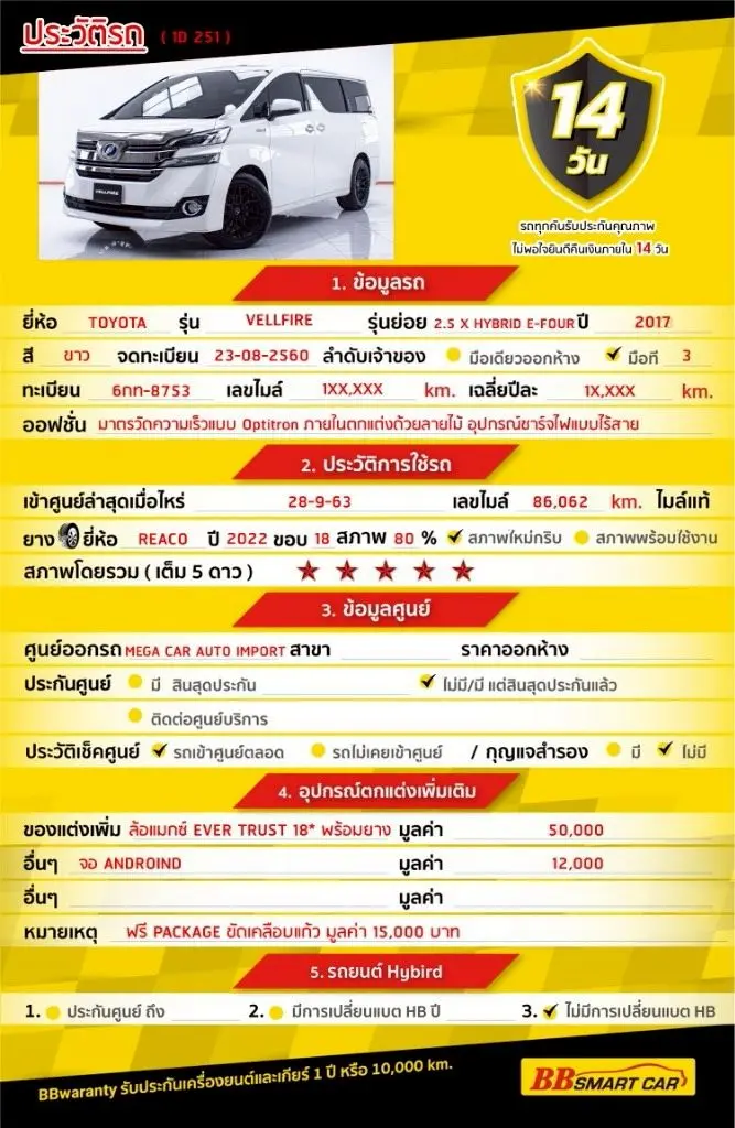 TOYOTA VELLFIRE 2.5 X HYBRID E-FOUR 2017 ออกรถ 0 บาท จัดได้ 1,364,000 บ. Line:@*******แสดงข้อมูล 🔥จอง 199 บาท ส่งบัตรประชาชน รู้ผลพิจารณาภายใน 30 นาที ไม่ผ่านคืนเงินจองทุกกรณี 🔥ซื้อรถกับ BB พร้อมให้คำปรึกษา แก้ทุกปัญหา ให้ทุกเรื่อง บริการ call center 24 ชม. 🔥BB Care Plus รับประกันหลังการขาย สูงสุด 2 ปี หรือ 20,000 km.. 🔥มีรถให้เลือกมากกว่า 1,600 คัน บีบีสมาร์ทคาร์ 4 สาขากาญจนาภิเษก รหัส 4A940 ราคา 1,344,000 บาท ผ่อนเพียง 25,511 บาท Brand. : TOYOTA Year. : 2017 Model. : VELLFIRE Grade. : 2.5 X HYBRID E-FOUR Engine. : 2500 CC Type. : เบนซิน+ไฟฟ้า Gearbox : AT Color. : ขาว Mileage. : 142,XXX km. (ซื้อสด ราคานี้ยังไม่รวมค่าดำเนินการ 10,000 บ.) 🚩 Price. 1,344,000 บาท ยอดจัด : 1,354,000 บาท เงินดาวน์ : 0 บาท ประกันภัย : ฟรีประกันภัย 1 ปี ค่าดำเนินการ : 10,000 บาท รวมออกรถ : 0 บาท ผ่อน 36 งวด = 46,245 บาท ผ่อน 48 งวด = 36,110 บาท ผ่อน 60 งวด = 30,272 บาท ผ่อน 72 งวด = 27,313 บาท ผ่อน 84 งวด = 25,511 บาท เงื่อนไขเป็นไปตามที่ไฟแนนซ์กำหนด** โปรโมชั่นพิเศษ สำหรับลกค้าเครดิตดี 🚩เลือกรับเรทดอกเบี้ยพิเศษ 📍36 งวด = 1.29 % 📍48 งวด = 1.99 % 📍60 งวด = 2.39 % 📍72 งวด = 3.59 % 🔥 เงื่อนไข โปรโมชั่น ดอกเบี้ยเริ่มต้น 1.29% ตลอดอายุสัญญา - ยอดจัดไฟแนนซ์ 300,000-600,0000 บาท - ผ่อนสูงสุด 72 เดือน - เป็นลูกค้าประวัติดี พนักงานประจำเงินเดือน 20,000 ขึ้นไป - ค่าดำเนินการแคมเปญ 20,000 บาท (รวมในยอดจัดได้) 🎗Car Hightlight รถสวยๆ วันนี้ขอแนะนำ TOYOTA VELLFIRE 2.5 X HYBRID E-FOUR AT 2017 จุดเด่นออฟชั่น 1 : ภายในตกแต่งด้วยลายไม้ 2 : มาตรวัดความเร็วแบบ Optitron 3 : อุปกรณ์ชาร์จไฟแบบไร้สาย Wireless Charging 🎗ภายใน เบาะนั่งหุ้มด้วยหนังแบบพิเศษ Perforated (Premium Nappa) เบาะนั่งคู่หน้า พร้อมระบบระบายอากาศ Heat & Ventilate Seat เบาะนั่งคู่หน้า พร้อมระบบบริหารหลังไฟฟ้า Air Lumbar Pro เบาะนั่งด้านหน้าผู้โดยสาร ปรับไฟฟ้า 4 ทิศทาง พร้อมที่รองขา เบาะนั่งด้านหน้า ผู้ขับขี่ ปรับไฟฟ้า 8 ทิศทาง เบาะนั่งด้านหน้า ผู้ขับขี่ พร้อมระบบความจำ 3 ตำแหน่ง เบาะนั่งแถวที่ 2 ปรับไฟฟ้า 2 ที่นั่ง แบบ Executive Lounge เบาะนั่งแถวที่ 2 พร้อมระบบความจำ 2 ตำแหน่ง เบาะนั่งแถวที่ 2 พร้อม Seat Ventilator & Heater ที่รองขา เบาะนั่งแถวที่ 2 พร้อมโต๊ะส่วนตัวแบบพับได้ ม่านบังแดด หน้าต่างหลัง แบบปรับธรรมดา ไฟส่องสว่างบริเวณที่เก็บสัมภาระด้านท้าย วัสดุหุ้มเสา หุ้มด้วยผ้าสักหลาด กล่องรับสัญญาณ Digital TV 🎗ภายนอก ไฟหน้า Projector Lens แบบ LED ไฟ Daytime Running Lights แบบ LED ระบบไฟหน้า ปรับระดับสูง – ต่ำ อัตโนมัติ ไฟเลี้ยวหน้า – หลัง LED แบบจังหวะ Sequential ไฟตัดหมอก ไฟท้ายแบบ LED ไฟตัดหมอกด้านหลัง ป้ายติดกระจกบังลมหลัง ” Officially Authorized by Toyota Motor Thailand ” สำหรับรุ่นปกติ ป้ายติดกระจกบังลมหลัง ” 10-Year Hybrid Battery Guarantee ” สำหรับรุ่น Hybrid ไฟอ่านหนังสือ สำหรับเบาะนั่งแถวที่ 2 🎗ความคุ้มค่า สำหรับรถคันนี้แล้วคุณภาพที่ลูกค้าได้รับ ถือว่ามาแบบเต็มสุดๆทั้งระบบรักษาความปลอดภัยและเทคโนโลยีต่างๆที่มากับตัวรถนับว่าค