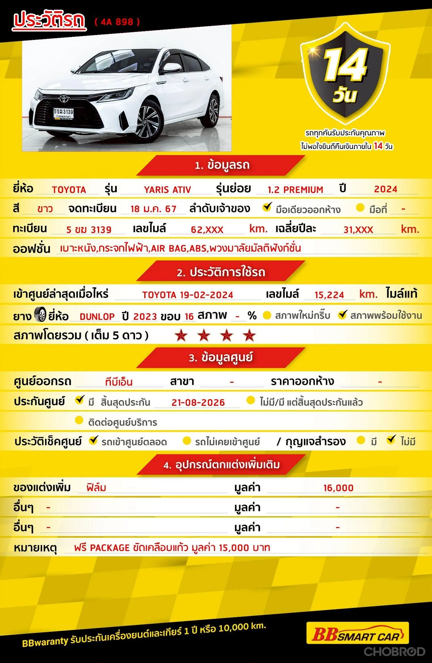 TOYOTA YARIS ATIV 1.2 PREMIUM 2024 ออกรถ 0 บาท จัดได้ 519,000 บ. Line:@********แสดงข้อมูล 🔥จอง 199 บาท ส่งบัตรประชาชน รู้ผลพิจารณาภายใน 30 นาที ไม่ผ่านคืนเงินจองทุกกรณี 🔥ซื้อรถกับ BB พร้อมให้คำปรึกษา แก้ทุกปัญหา ให้ทุกเรื่อง บริการ call center 24 ชม. 🔥BB Care Plus รับประกันหลังการขาย สูงสุด 2 ปี หรือ 20,000 km.. 🔥มีรถให้เลือกมากกว่า 1,800 คัน บีบีสมาร์ทคาร์ 4 สาขากาญจนาภิเษก รหัสรถ 4A898 ราคา 499,000 บ. ผ่อนเพียง 8,187 บาท Brand. : TOYOTA Year. : 2024 Model. : YARIS ATIV Grade. : 1.2 PREMIUM Engine. : 1200 CC. Type. : เบนซิน Gearbox : A/T Color. : ขาว Mileage. : 62,XXX km. (ซื้อสด ราคานี้ยังไม่รวมค่าดำเนินการ 10,000 บ.) 🚩 Price. 499,000 บาท ยอดจัด : 509,000 บาท เงินดาวน์. : ฟรีดาวน์ ประกันภัย : ฟรีประกันภัย 1 ปี ค่าดำเนินการ : 10,000 บาท รวมออกรถ 0 บาท ผ่อน 36 งวด = 15,750 บาท ผ่อน 48 งวด = 12,117 บาท ผ่อน 60 งวด = 10,068 บาท ผ่อน 72 งวด = 9,007 บาท ผ่อน 84 งวด = 8,187 บาท **เงื่อนไขเป็นไปตามที่ไฟแนนซ์กำหนด โปรโมชั่นพิเศษ สำหรับลูกค้าเครดิตดี เลือกรับเรทดอกเบี้ยพิเศษ 📍36 งวด = 1.29 % 📍48 งวด = 1.99 % 📍60 งวด = 2.39 % 📍72 งวด = 3.59 % 🔥 เงื่อนไข โปรโมชั่น ดอกเบี้ยเริ่มต้น 1.29% ตลอดอายุสัญญา - ยอดจัดไฟแนนซ์ 300,000-600,000 บาท - ผ่อนสูงสุด 72 เดือน - เป็นลูกค้าประวัติดี พนักงานประจำเงินเดือน 20,000 ขึ้นไป - ค่าดำเนินการแคมเปญ 20,000 บาท (รวมในยอดจัดได้) 🎗Car Hightlight มาแล้วค่ะ !! TOYOTA YARIS ATIV เครื่องยนต์เบนซิน 1200 cc รถเล็กประหยัด คล่องตัว ออปชั่นครบ จบในคันเดียว 🚗✨ รถยนต์อีโคคาร์ที่มาพร้อมกับการออกแบบรูปลักษณ์ใหม่ ชูจุดเด่นตัวถังขนาดใหญ่ ขวัญใจวัยรุ่น สภาพสวยทุกรายละเอียด รถสวยจริงๆค่ะ เอาไปพร้อมขับเลยน้า 🎗ภายใน จอ LCD เล่น DVD แอร์ เบาะหนัง กระจกไฟฟ้า เซ็นทรัลล๊อก พวงมาลัยเพาเวอร์ กุญแจรีโมท-สัญญานกันขโมย พวงมาลัย Multifunction เบาะกึ่งหนัง เบรกมือไฟฟ้า Airbag วิทยุ - CD แอร์ AUTO เบรค ABS 🎗ภายนอก กระจกมองข้างปรับไฟฟ้า กล้องส่องหลัง กระจกมองข้างพับไฟฟ้า คิ้วกันสาด ไฟเลี้ยวกระจกมองข้าง เซนเซอร์รอบคัน 🎗ความคุ้มค่า เป็นแบรนด์ที่ซื้อง่ายขายคล่อง รถอีโค้คาร์ยอดนิยม ประหยัดน้ำมัน ดูแลง่ายมากๆค่ะ ศูนย์บริการก็เยอะ มีทั่วประเทศอะไหล่หาง่ายทั้งนอกและในศูนย์ เทียบกับราคานี้ถือว่าคุ้มค่ามากๆเลยค่ะ ⭐️การรับประกันหลังการขาย BB Care Plus สูงสุด 2 ปี หรือ 20,000 km. ด้วยช่างที่ผ่านการอบรมจากศูนย์ชั้นนำของประเทศ 🎉Special offer เฉพาะ บีบีสมาร์ทคาร์ ที่นี่ที่เดียว ⭐ดอกเบี้ยเริ่มต้น 1.29% มีไฟแนนซ์รองรับหลายที่ค่ะ ⭐ฟรี!! แพคเก็จ ขัดเคลือบแก้ว มูลค่า 15,000 บาท ทุกคัน ⭐อนุมัติไว 30 นาที นำเอกสารมาให้ครบรับรถกลับบ้านทันทีค่ะ ⭐BB Care Plus รับประกันหลังการขาย สูงสุด 2 ปี หรือ 20,000 km. ⭐มี 6 สาขา ในกรุงเทพและปริมณฑลใกล้บ้านท่าน ⭐รถทุกคันผ่านตรวจสอบ Inspection เรียบแล้วค่ะ ผ่าน 5 ดาวทุกคันค่ะ ⭐เซลล์ทุกท่านเป็นมืออาชีพพร้อ