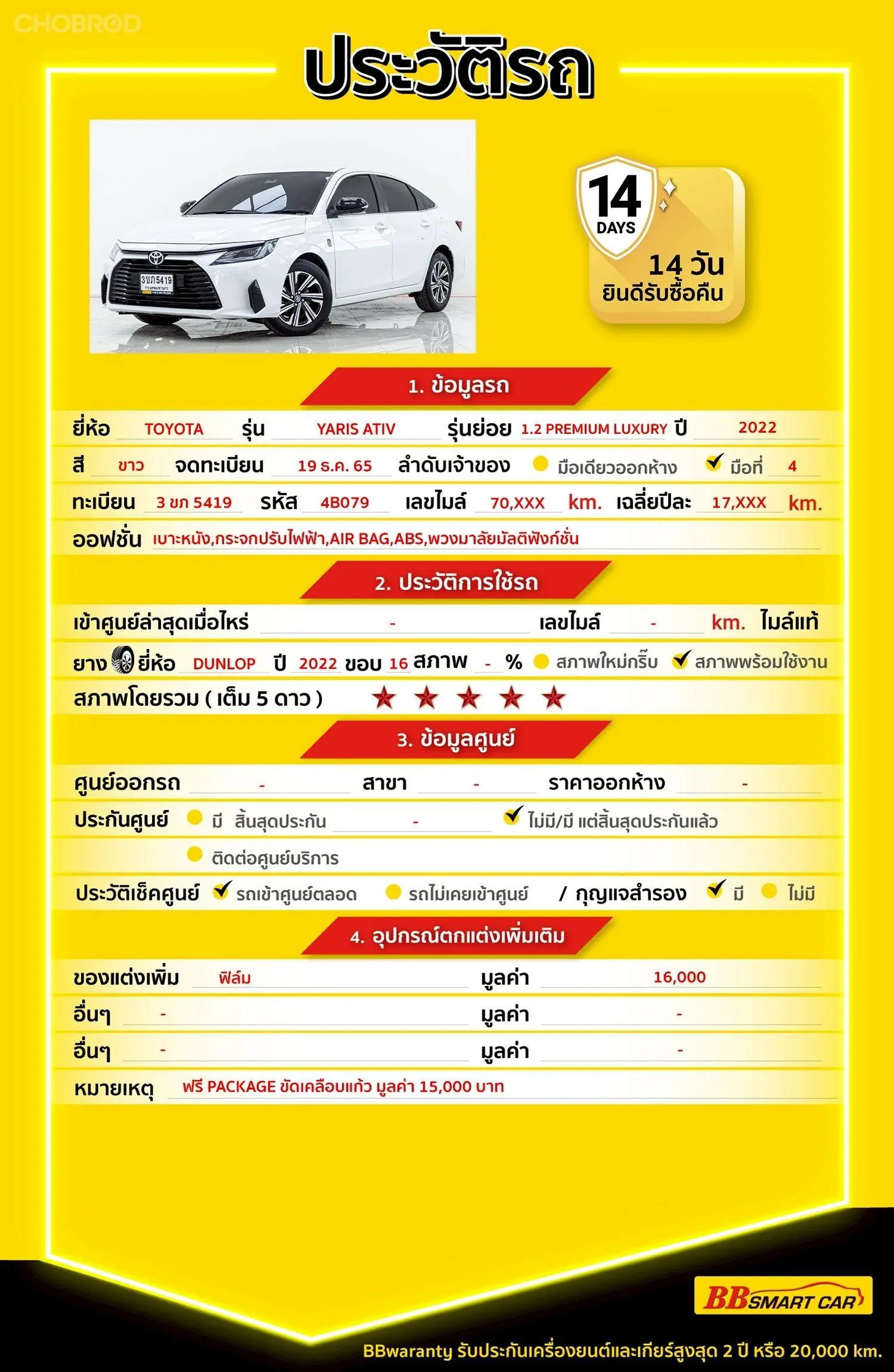 TOYOTA YARIS ATIV 1.2 PREMIUM LUXURY 2022 ออกรถ 0 บาท จัดได้ 509,000 บ. Line:@698epmtg 🔥จอง 199 บาท ส่งบัตรประชาชน รู้ผลพิจารณาภายใน 30 นาที ไม่ผ่านคืนเงินจองทุกกรณี 🔥ซื้อรถกับ BB พร้อมให้คำปรึกษา แก้ทุกปัญหา ให้ทุกเรื่อง บริการ call center 24 ชม. 🔥BB Care Plus รับประกันหลังการขาย สูงสุด 2 ปี หรือ 20,000 km.. 🔥มีรถให้เลือกมากกว่า 1,800 คัน สาขา4 ถนนกาญจนาภิเษกใกล้กับสมาคมปักษ์ใต้ รหัสรถ 4B079 ราคา 489,000 บ. ผ่อนเพียง 8,355 บาท Brand. : TOYOTA Year. : 2022 Model. : YARIS ATIV Grade. : 1.2 PREMIUM LUXURY Engine. : 1200 CC. Type. : เบนซิน Gearbox : AT Color. : ขาว Mileage. : 71,XXX km. (ซื้อสด ราคานี้ยังไม่รวมค่าดำเนินการ 10,000 บ.) 🚩 Price. 489,000 บาท ยอดจัด : 499,000 บาท เงินดาวน์. : ฟรีดาวน์ ประกันภัย : ฟรีประกันภัย 1 ปี ค่าดำเนินการ : 10,000 บาท รวมออกรถ 0 บาท ผ่อน 36 งวด = 16,072 บาท ผ่อน 48 งวด = 12,365 บาท ผ่อน 60 งวด = 10,274 บาท ผ่อน 72 งวด = 9,191 บาท ผ่อน 84 งวด = 8,355 บาท **เงื่อนไขเป็นไปตามที่ไฟแนนซ์กำหนด โปรโมชั่นพิเศษ สำหรับลูกค้าเครดิตดี เลือกรับเรทดอกเบี้ยพิเศษ 📍36 งวด = 1.29 % 📍48 งวด = 1.99 % 📍60 งวด = 2.39 % 📍72 งวด = 3.59 % 🔥 เงื่อนไข โปรโมชั่น ดอกเบี้ยเริ่มต้น 1.29% ตลอดอายุสัญญา - ยอดจัดไฟแนนซ์ 300,000-600,000 บาท - ผ่อนสูงสุด 72 เดือน - เป็นลูกค้าประวัติดี พนักงานประจำเงินเดือน 20,000 ขึ้นไป - ค่าดำเนินการแคมเปญ 20,000 บาท (รวมในยอดจัดได้) 🎗Car Hightlight มาแล้วค่ะ !! TOYOTA YARIS ATIV เครื่องยนต์เบนซิน 1200 cc ปรับโฉมใหม่เป็นทรง Fastback ท้ายลาด ดูสปอร์ตและหรูหราขึ้นชัดเจน รถเล็กประหยัด คล่องตัว ออปชั่นครบ จบในคันเดียว 🚗✨ รถยนต์อีโคคาร์ที่มาพร้อมกับการออกแบบรูปลักษณ์ใหม่ ชูจุดเด่นตัวถังขนาดใหญ่ ขวัญใจวัยรุ่น สภาพสวยทุกรายละเอียด รถสวยจริงๆค่ะ เอาไปพร้อมขับเลยน้า 🎗ภายใน โทนสี: ตกแต่งด้วย หนังสีแดง (เฉพาะรุ่น Premium Luxury) ให้ความรู้สึกหรูหราเกินคันอื่นในระดับเดียวกัน หน้าจอ: หน้าจอสัมผัสขนาด 9 นิ้ว รองรับ Apple CarPlay / Android Auto มาตรวัด: จอ Digital TFT ขนาด 7 นิ้ว ปรับเปลี่ยนกราฟิกได้ 4 รูปแบบ ความสบาย: มีช่องแอร์หลัง, ระบบกรองฝุ่น PM 2.5 และไฟ Ambient Light ปรับได้ 64 สี เครื่องเสียง: ลำโพง Pioneer 6 ตำแหน่ง เสียงดีกว่ารุ่นมาตรฐาน 🎗ภายนอก ดีไซน์: ปรับโฉมใหม่เป็นทรง Fastback ท้ายลาด ดูสปอร์ตและหรูหราขึ้นชัดเจน ไฟหน้า-ท้าย: Full LED ทั้งระบบ พร้อมไฟเลี้ยวแบบ Sequential (ไฟวิ่ง) ล้อ: อัลลอยปัดเงาสีทูโทนขนาด 16 นิ้ว กระจังหน้าขนาดใหญ่สีดำเงา และตัวรถมีความเตี้ยลงแต่ฐานล้อยาวขึ้น ทำให้รถดูทรงตัวดีและกว้างขวาง 🎗ความคุ้มค่า เป็นแบรนด์ที่ซื้อง่ายขายคล่อง รถอีโค้คาร์ยอดนิยม ประหยัดน้ำมัน ดูแลง่ายมากๆค่ะ ศูนย์บริการก็เยอะ มีทั่วประเทศอะไหล่หาง่ายทั้งนอกและในศูนย์ เทียบกับราคานี้ถือว่าคุ้มค่ามากๆเลยค่ะ ⭐️การรับประกันหลังการขาย BB Care Plus สูงสุด 2 ปี หรือ 20,000 km. ด้วยช่างที่ผ่านการอบรมจากศูนย์ชั้นนำของประเทศ 🎉Special of