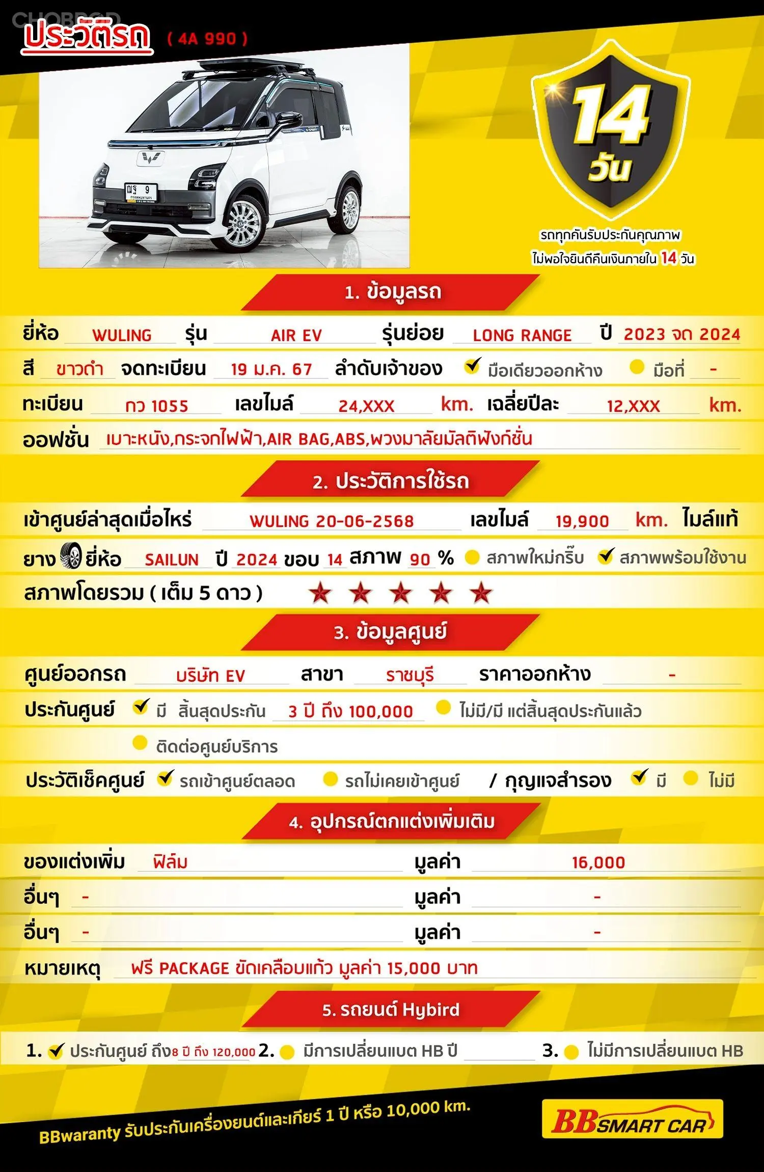 WULING AIR EV LONG RANGE 2024 ออกรถ 0 บาท จัดได้ 279,000 บ. Line:@********แสดงข้อมูล 🔥จอง 199 บาท ส่งบัตรประชาชน รู้ผลพิจารณาภายใน 30 นาที ไม่ผ่านคืนเงินจองทุกกรณี 🔥ซื้อรถกับ BB พร้อมให้คำปรึกษา แก้ทุกปัญหา ให้ทุกเรื่อง บริการ call center 24 ชม. 🔥BB Care Plus รับประกันหลังการขาย สูงสุด 2 ปี หรือ 20,000 km.. 🔥มีรถให้เลือกมากกว่า 1,800 คัน บีบีสมาร์ทคาร์ 4 สาขากาญจนาภิเษก รหัสรถ 4A990 ราคา 259,000 บาท ผ่อนเพียง 4,985 บาท Brand. : WULING Year. : 2024 Model. : AIR EV Grade. : LONG RANGE Engine. : 41 CC Type. : ระบบไฟฟ้า Gearbox : A/T Color. : ขาวทูโทน Mileage. : 24,XXX km. (ซื้อสด ราคานี้ยังไม่รวมค่าดำเนินการ 10,000 บ.) 🚩 Price. 259,000 บาท ยอดจัด : 269,000 บาท เงินดาวน์ : 0 บาท ประกันภัย : ฟรีประกันภัย 1 ปี ค่าดำเนินการ : 10,000 บาท รวมออกรถ : 0 บาท ผ่อน 36 งวด = 8,895 บาท ผ่อน 48 งวด = 6,896 บาท ผ่อน 60 งวด = 5,996 บาท ผ่อน 72 งวด = 5,317 บาท ผ่อน 84 งวด = 4,985 บาท **เงื่อนไขเป็นไปตามที่ไฟแนนซ์กำหนด โปรโมชั่นพิเศษ สำหรับลูกค้าเครดิตดี เลือกรับเรทดอกเบี้ยพิเศษ 📍36 งวด = 1.29 % 📍48 งวด = 1.99 % 📍60 งวด = 2.39 % 📍72 งวด = 3.59 % 🔥 เงื่อนไข โปรโมชั่น ดอกเบี้ยเริ่มต้น 1.29% ตลอดอายุสัญญา - ยอดจัดไฟแนนซ์ 300,000-600,000 บาท - ผ่อนสูงสุด 72 เดือน - เป็นลูกค้าประวัติดี พนักงานประจำเงินเดือน 20,000 ขึ้นไป - ค่าดำเนินการแคมเปญ 20,000 บาท (รวมในยอดจัดได้) 🎗Car Hightlight รถสวยๆ วันนี้ขอแนะนำWULING AIR EV LONG RANGE AT 2024 เป็นรถยนต์ไฟฟ้าที่ออกแบบมาเพื่อตอบโจทย์การเดินทางในเมือง ด้วยขนาดที่กะทัดรัด ประหยัดพลังงาน และมีฟังก์ชันการใช้งานที่ครบครัน เหมาะสำหรับผู้ที่กำลังมองหารถยนต์ไฟฟ้าคันแรก หรือรถยนต์คันที่สองสำหรับใช้ในชีวิตประจำวัน 🎗ภายใน วิทยุ - CD กุญแจรีโมท-สัญญานกันขโมย พวงมาลัยเพาเวอร์ จอ LCD เล่น DVD เซ็นทรัลล๊อก แอร์ เบาะกึ่งหนัง พวงมาลัย Multifunction เบาะหนัง Airbag เบรค ABS เบรกมือไฟฟ้า 🎗ภายนอก กระจกมองข้างปรับไฟฟ้า กระจกไฟฟ้า กล้องส่องหลัง เซนเซอร์รอบคัน แล็คหลังคา ไฟเลี้ยวกระจกมองข้าง ล้อแม็ก สปอยเลอร์หลัง คิ้วกันสาด ไฟตัดหมอก ไม่มีชนหนักแน่นอนค่ะ 🎗ความคุ้มค่า สำหรับคันนี้หากเปรียบเทียบราคากับคุณภาพ คันนี้ถือว่าคุ้มค่ามากค่ะ ผ่อนสบายๆก็มีรถขับได้ รถดีมีคุณภาพแบบนี้รีบตัดสินใจซื้อได้เลราคานี้มาไวไปไวนะคะ ⭐️การรับประกันหลังการขาย BB Care Plus สูงสุด 2 ปี หรือ 20,000 km. ด้วยช่างที่ผ่านการอบรมจากศูนย์ชั้นนำของประเทศ 🎉Special offer เฉพาะ บีบีสมาร์ทคาร์ ที่นี่ที่เดียว ⭐ดอกเบี้ยเริ่มต้น 1.29% มีไฟแนนซ์รองรับหลายที่ค่ะ ⭐ฟรี!! แพคเก็จ ขัดเคลือบแก้ว มูลค่า 15,000 บาท ทุกคัน ⭐อนุมัติไว 30 นาที นำเอกสารมาให้ครบรับรถกลับบ้านทันทีค่ะ ⭐BB Care Plus รับประกันหลังการขาย สูงสุด 2 ปี หรือ 20,000 km. ⭐มี 6 สาขา ในกรุงเทพและปริมณฑลใกล้บ้านท่าน ⭐รถทุกคันผ่านตรวจสอบ Inspection เรียบร้อยแล้วค่ะ ผ่าน 5 ดาวทุกคันค่ะ ⭐เซ